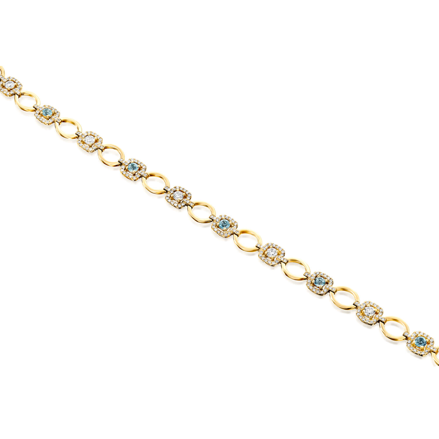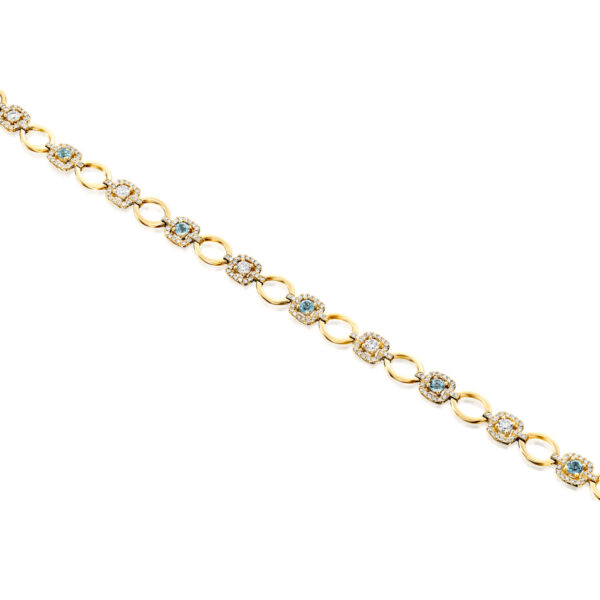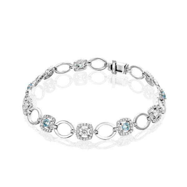 An elegant and fashionable diamond bracelet with a combination of diamonds and a blue topaz gemstone. A diamond bracelet made by hand, with a refined and pleasant presence, in the center set with a diamond or blue topaz and surrounded by small and shiny diamonds.