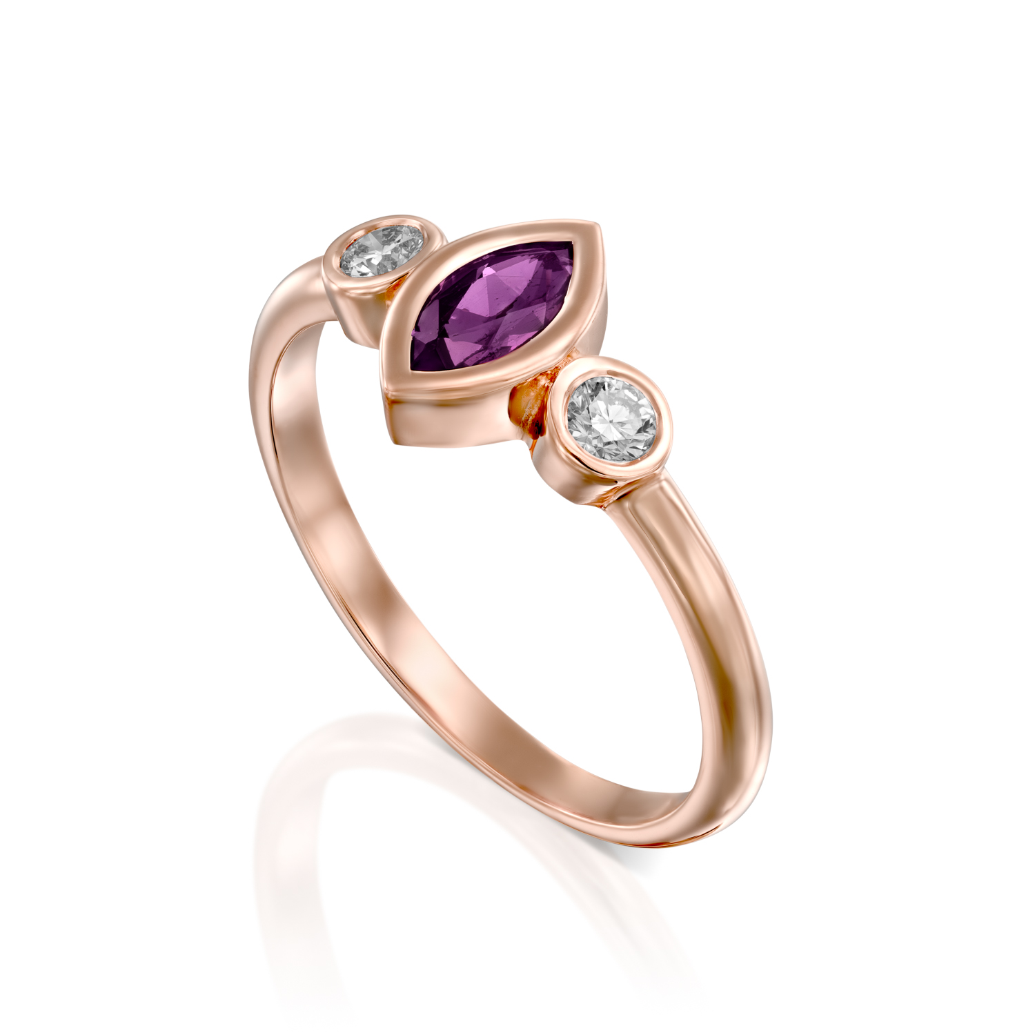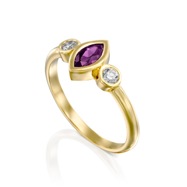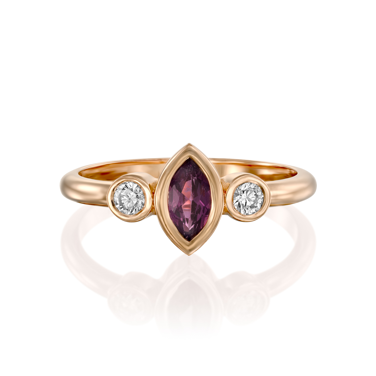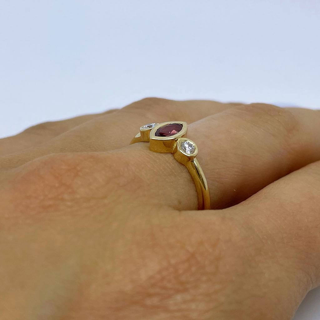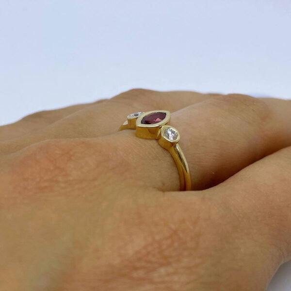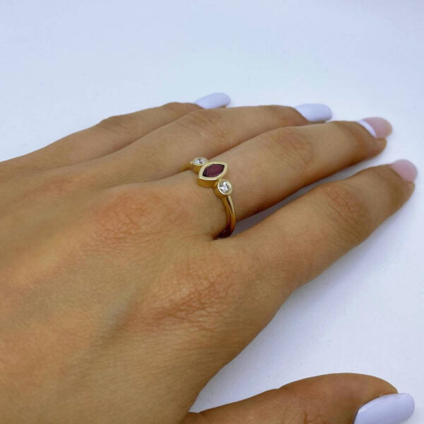 Impressive ruby and diamond ring in a trendy vintage style, set with a ruby weighing 0.45 carats and 2 sparkling diamonds weighing 0.12 carats in total. A diamond and ruby gemstone ring in the shape of a marquise with a unique look that creates interest and attracts looks.