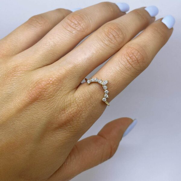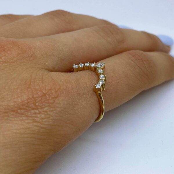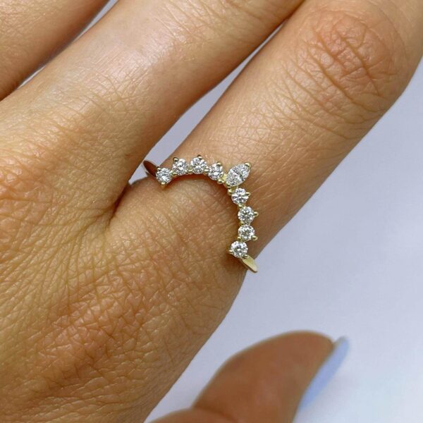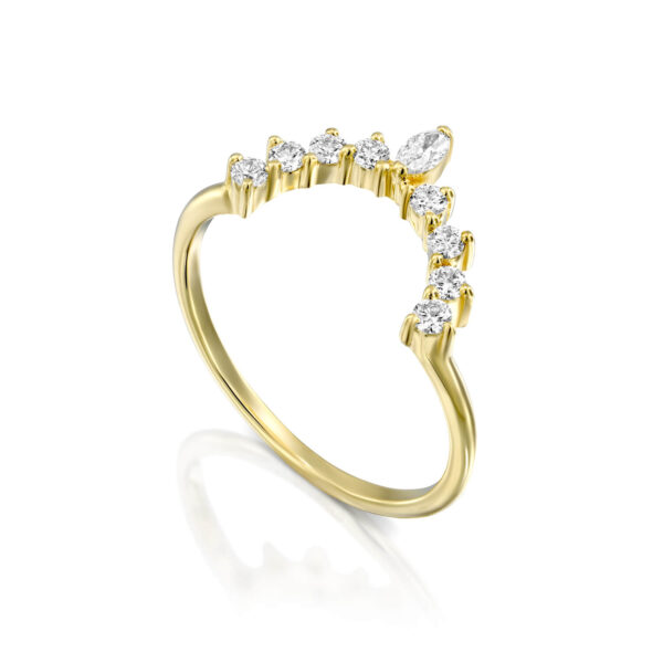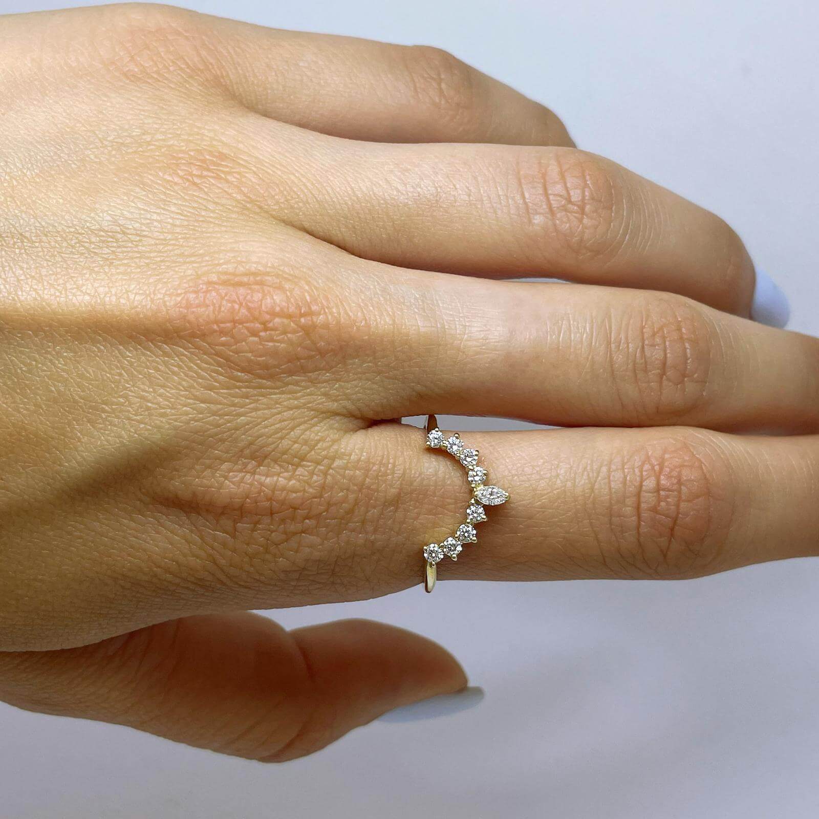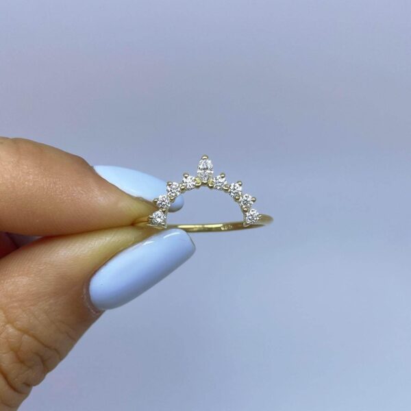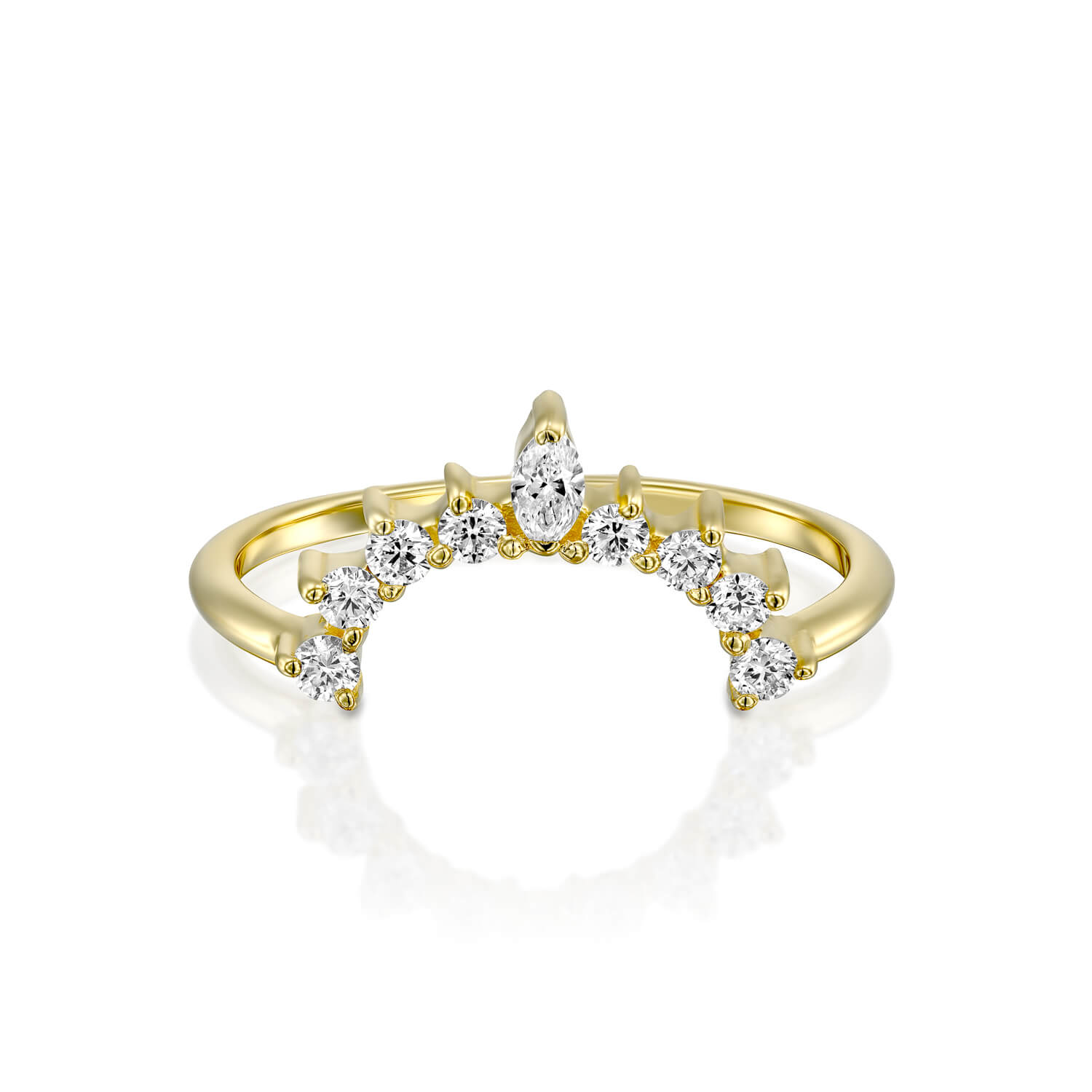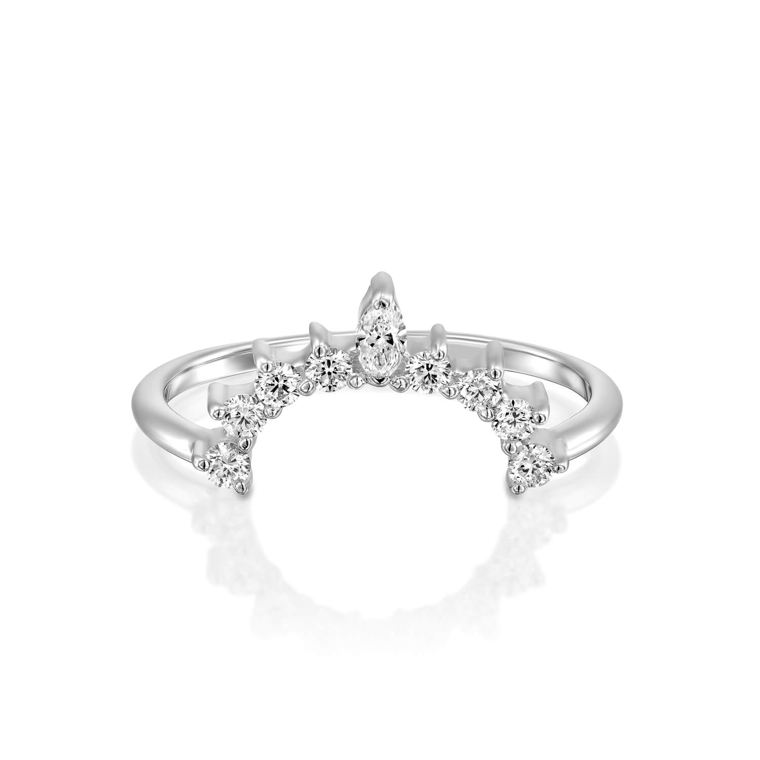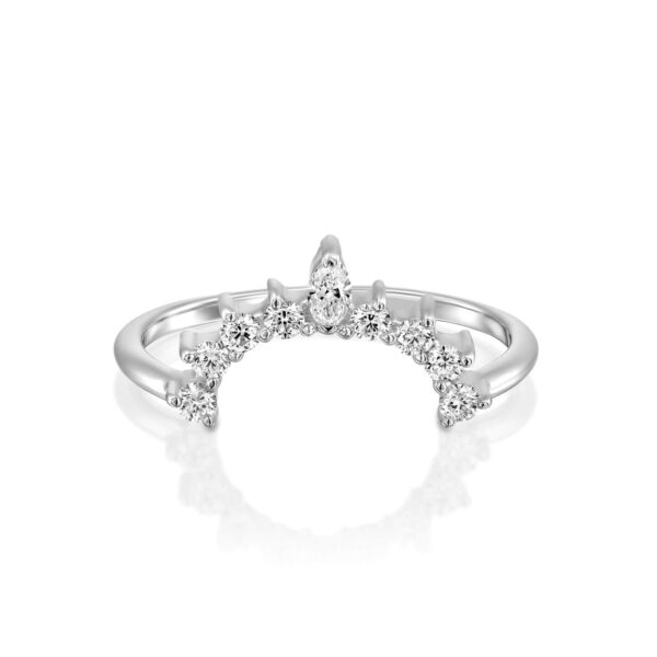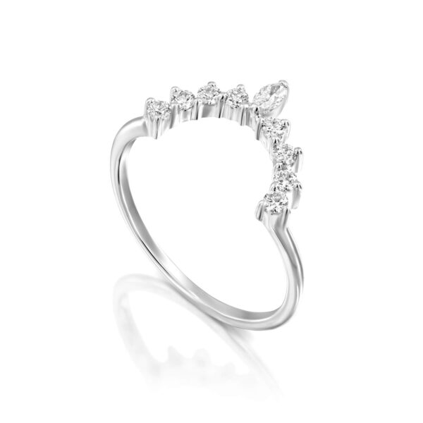 Trendy and delicate crown ring set with a marquise shape diamond weighing 0.06ct in the center and 8 white sparkling diamonds weighing 0.22 carats total. A designed diamond ring that can be worn alone on your finger or attached to an engagement ring.