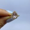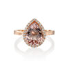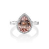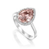 An impressive and colorful engagement ring set with a big and dazzling pear shape pink morganite weighing 2.10 carats and sparkling white diamonds around it.