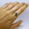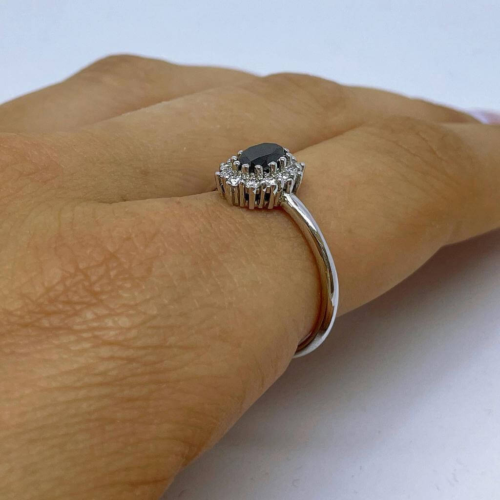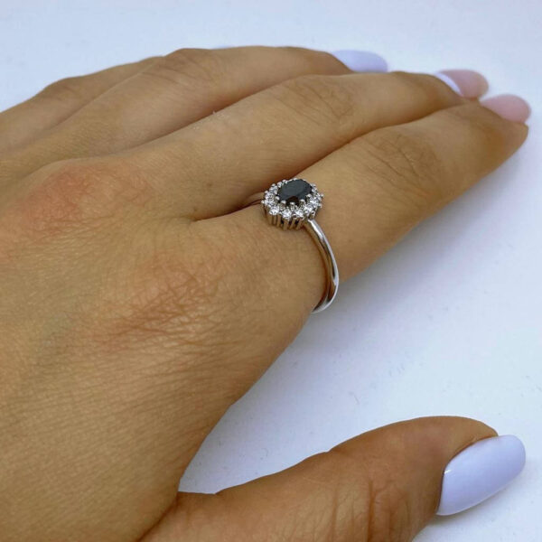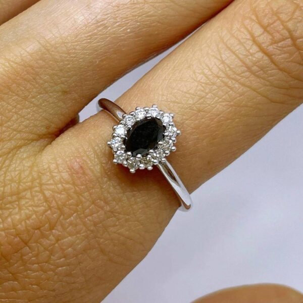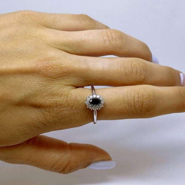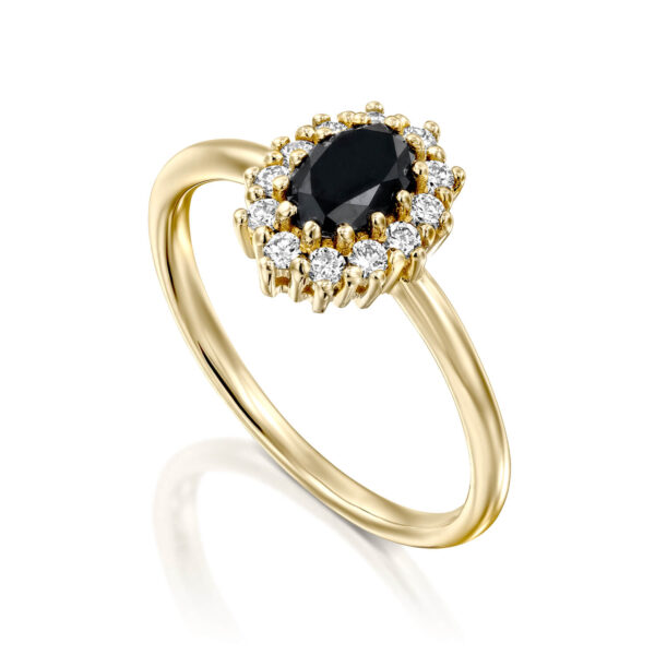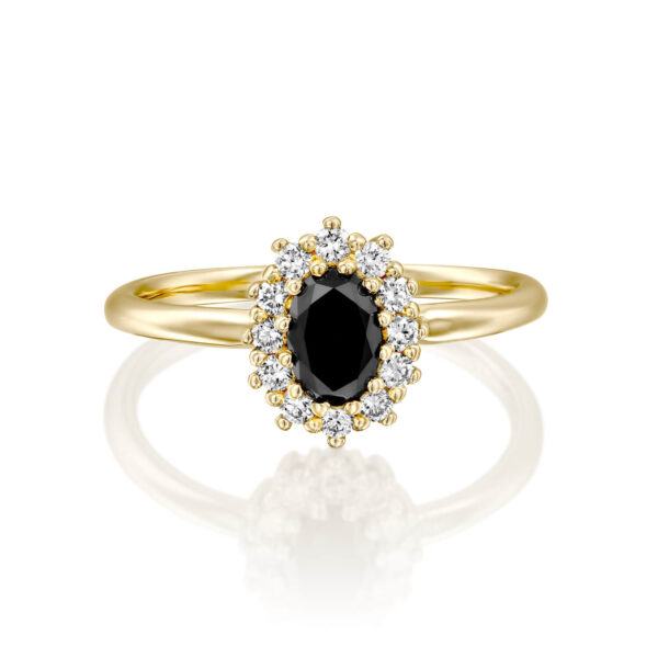 A fashionable engagement ring set in the center a dazzling black diamond 0.50 carats surrounded by sparkling white diamonds weighing 0.20 carats which enhances its prestige. This ring is carefully designed with an emphasis on the small details. Ideal for everyday and special occasions.