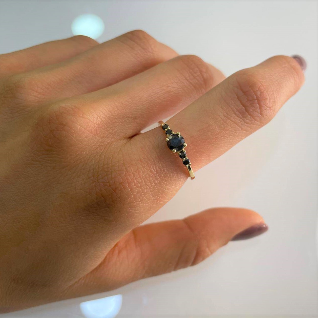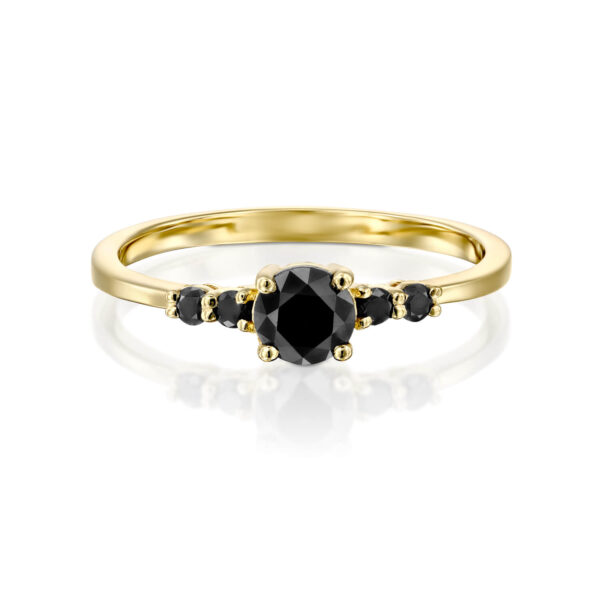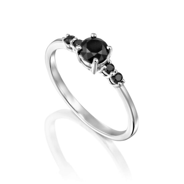 A delicate and special fashionable black diamond ring set in the center of a 0.50 carat black and shiny diamond and on the sides black diamonds weighing 0.11 carats in total. A diamond ring designed in an elegant way that creates a combination of delicacy and a strong presence.