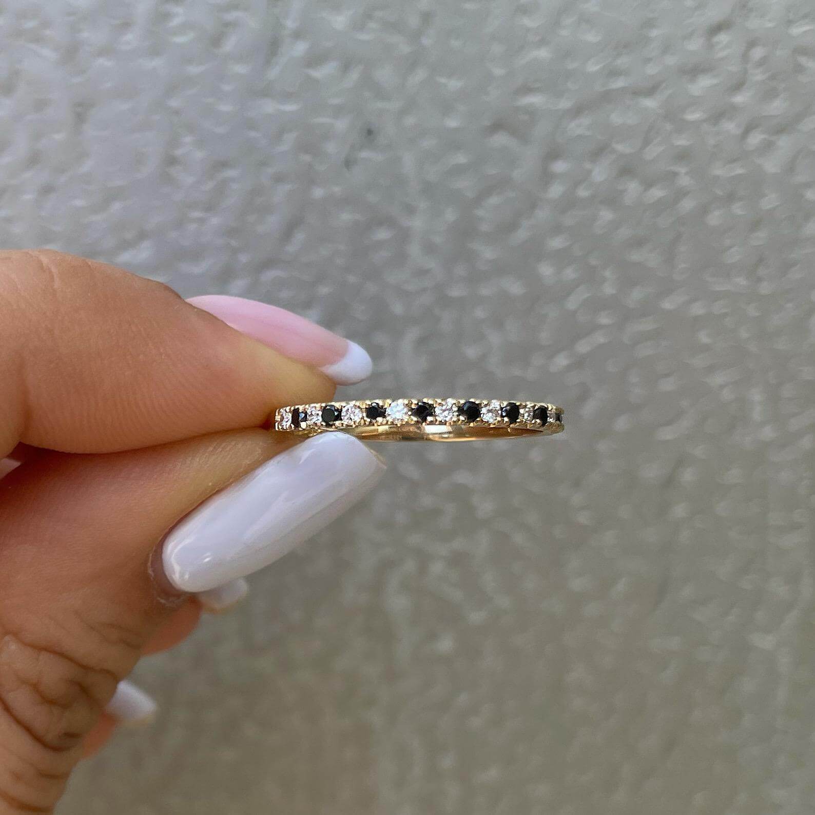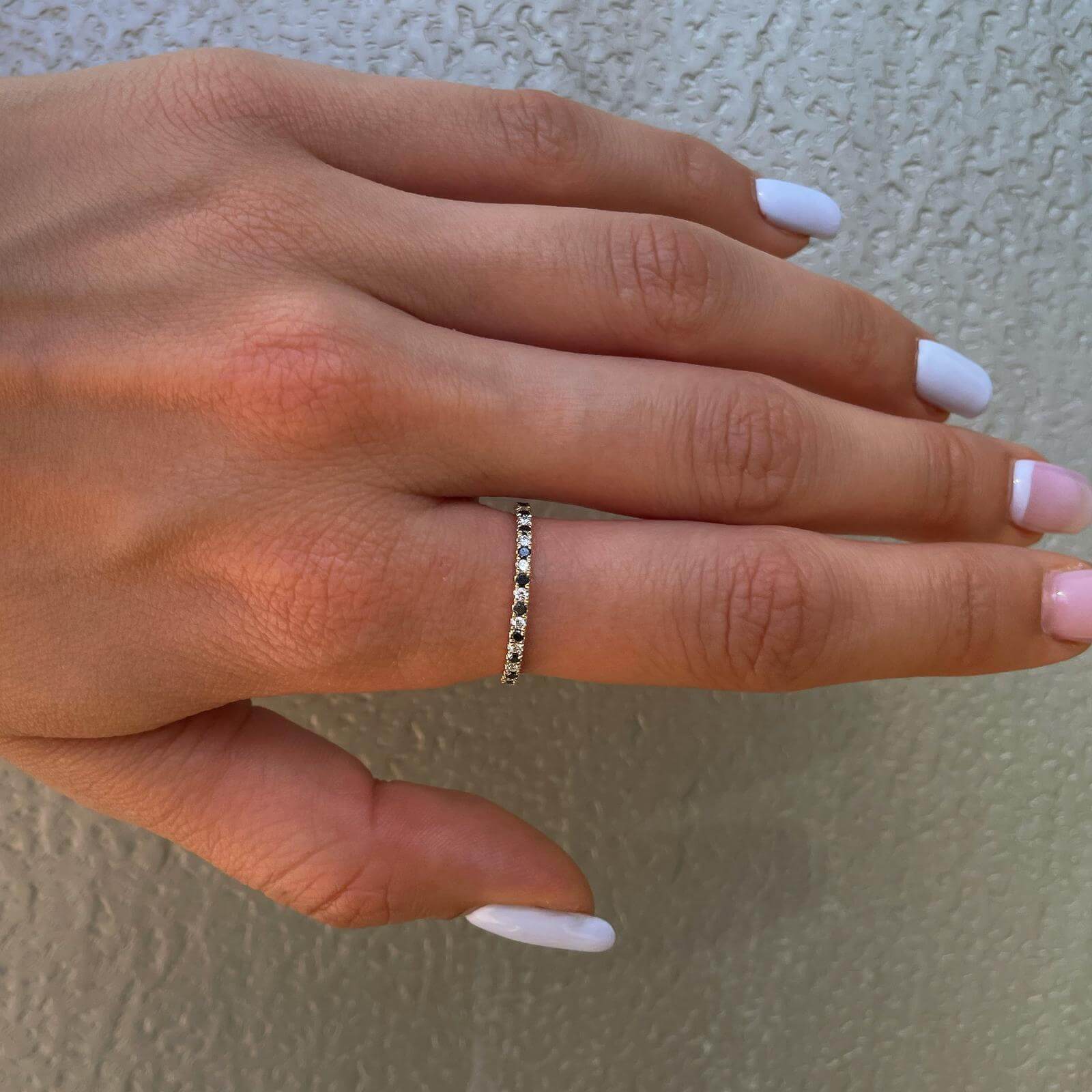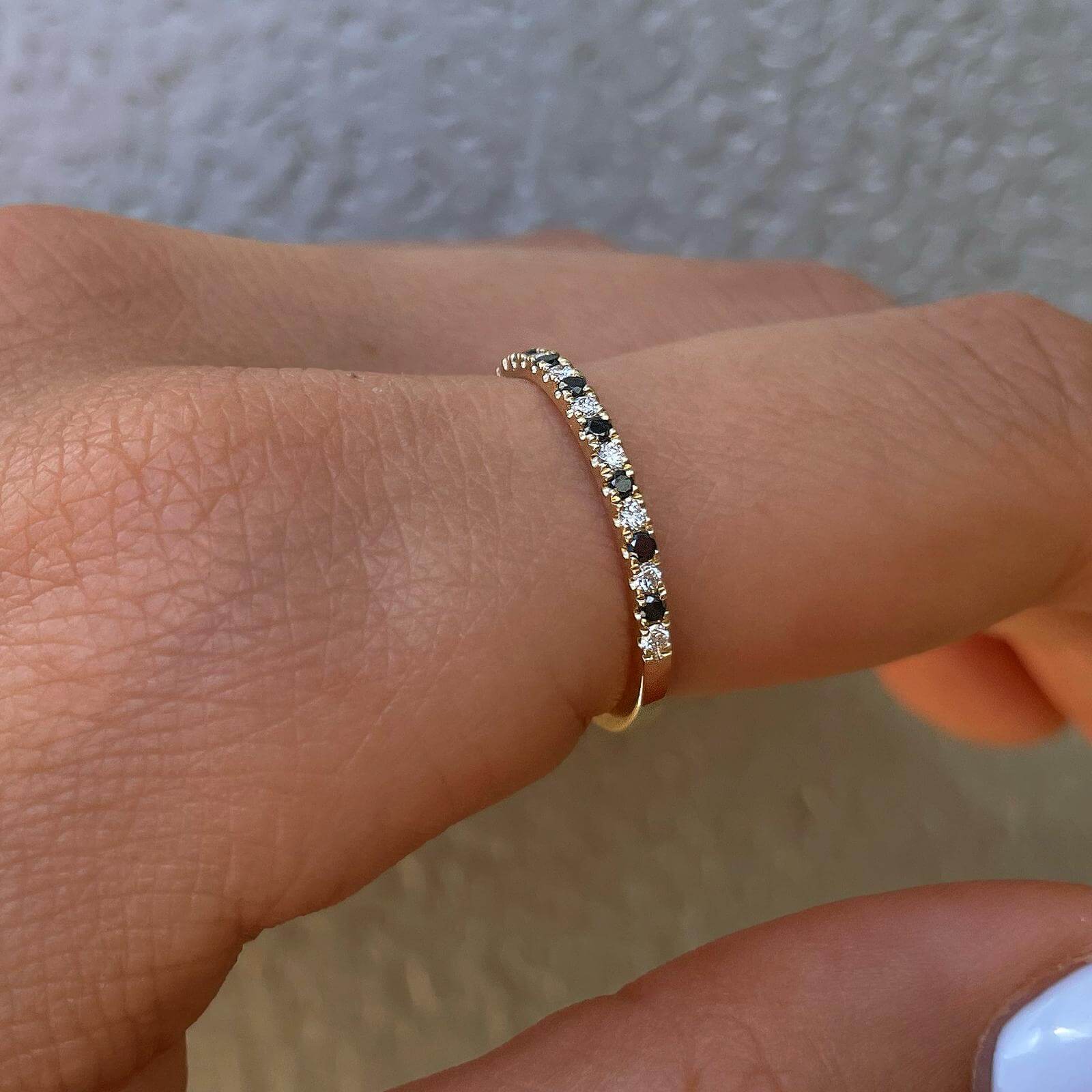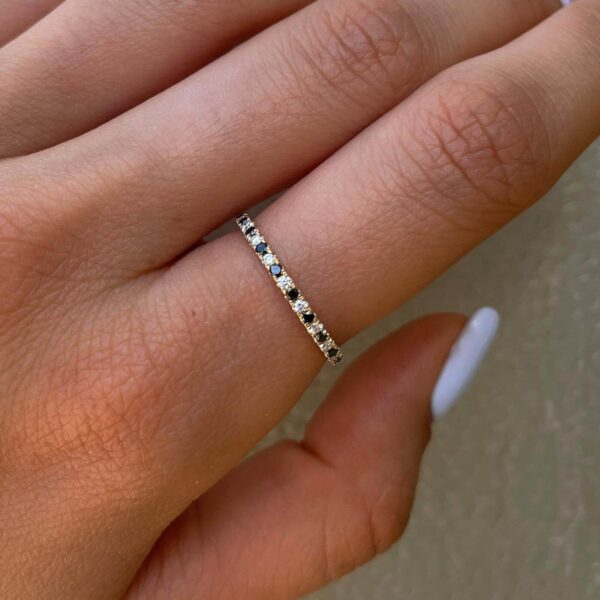 A black and white diamond ring set in a row with a delicate and special look. A diamond ring set with 11 black diamonds weighing 0.11 carat in total and 11 white diamonds weighing 0.11 carats in total. A row of diamond rings that are perfect as a special and sparkling addition to everyday or as an addition that is attached to an engagement ring.
