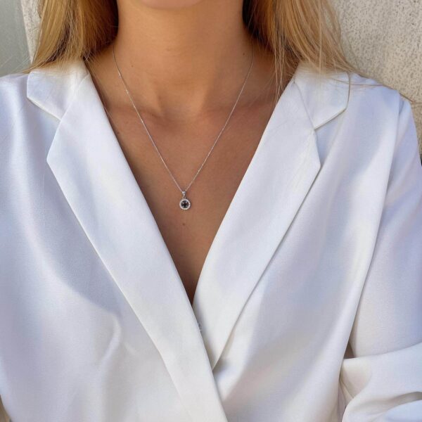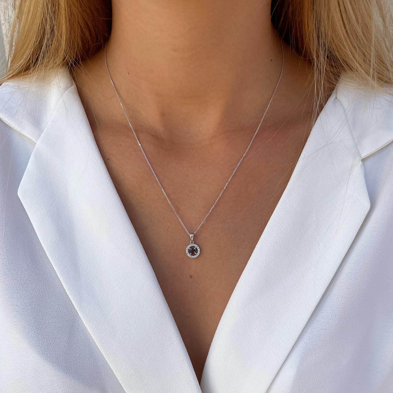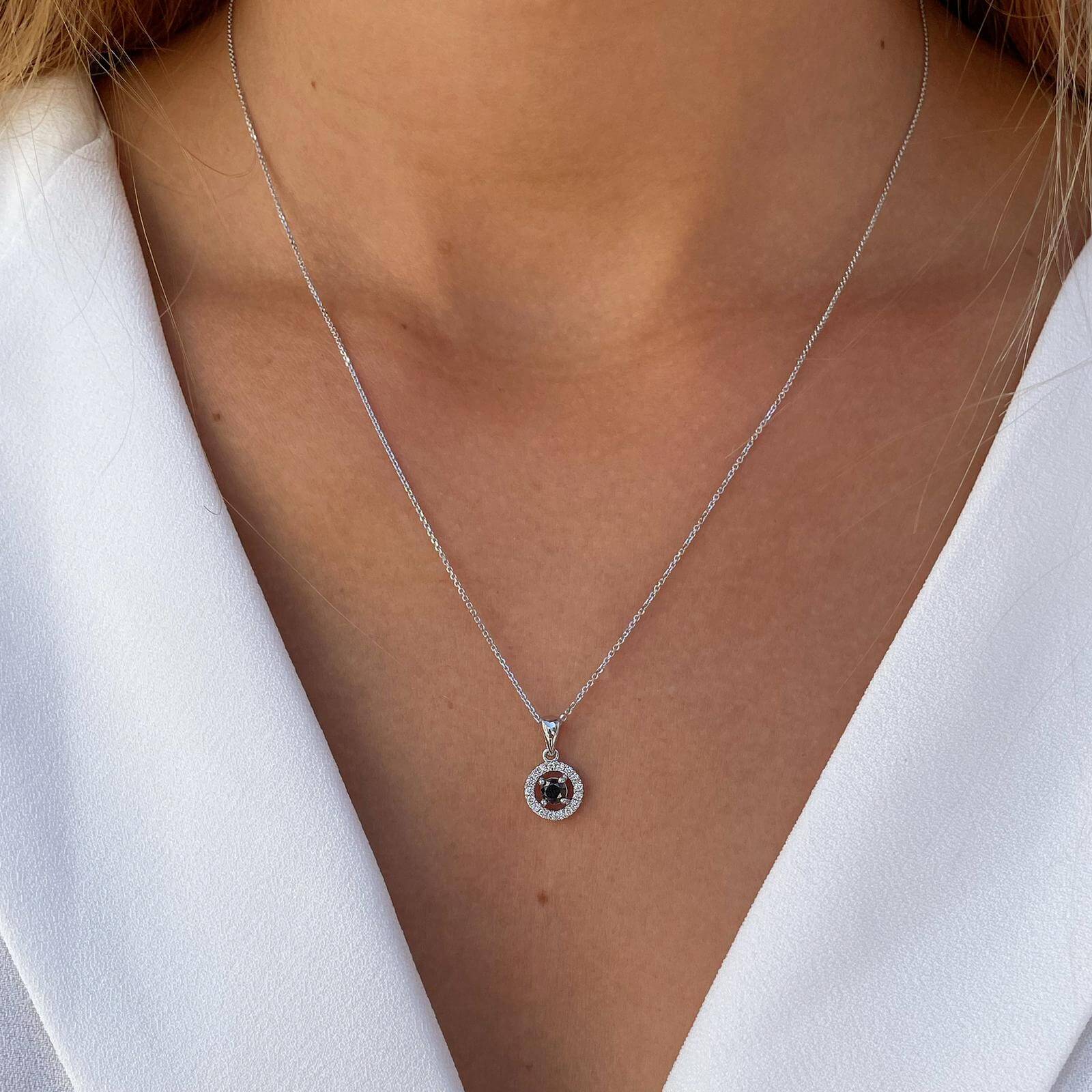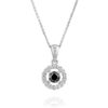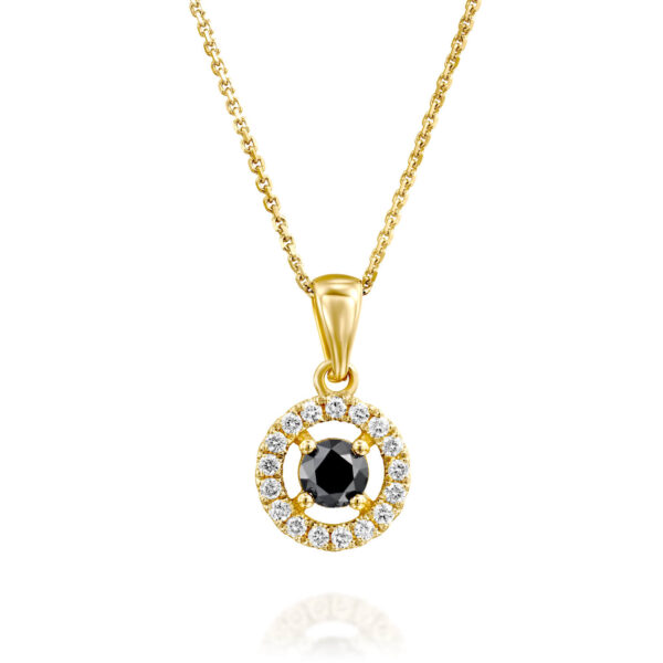 A delicate and elegant black diamond pendant with a young character set in the center of a 0.20 carat shiny black diamond and surrounded by 17 sparkling white diamonds that enhance its beauty. A young and fashionable black diamond pendant but still retains elegance.