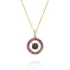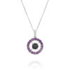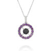 A special and impressive black diamond pendant with a black diamond in the center 0.60 carats and an aura of purple amethyst gems around it 0.16 carats in total. A special diamond pendant with bright and magical colors that creates a magical and mesmerizing look.