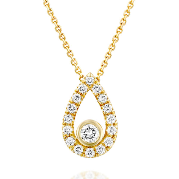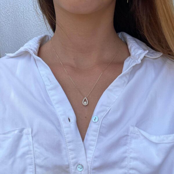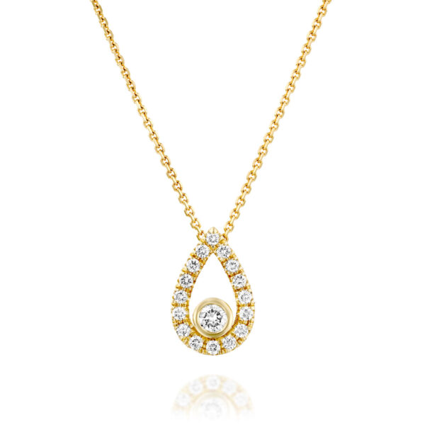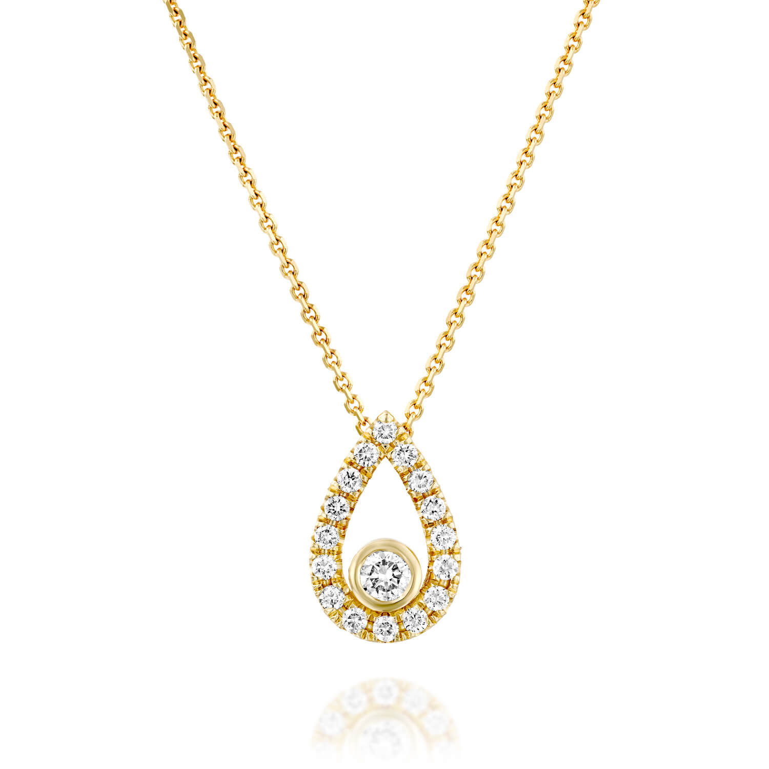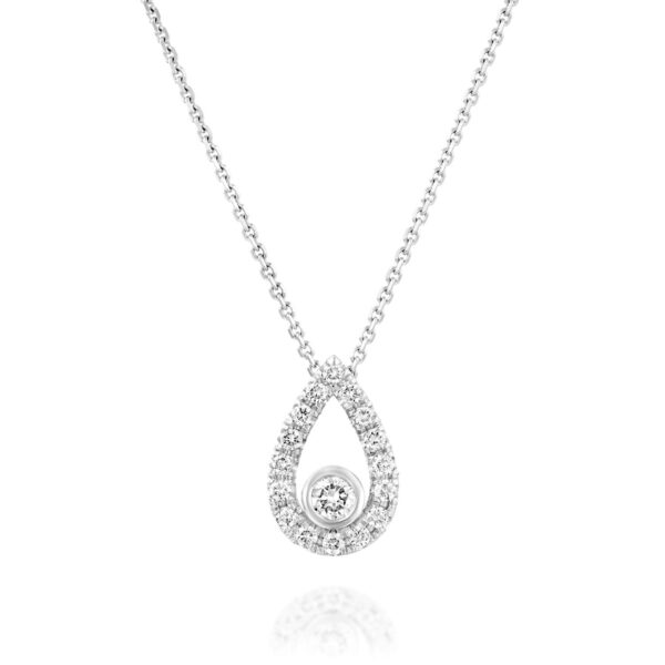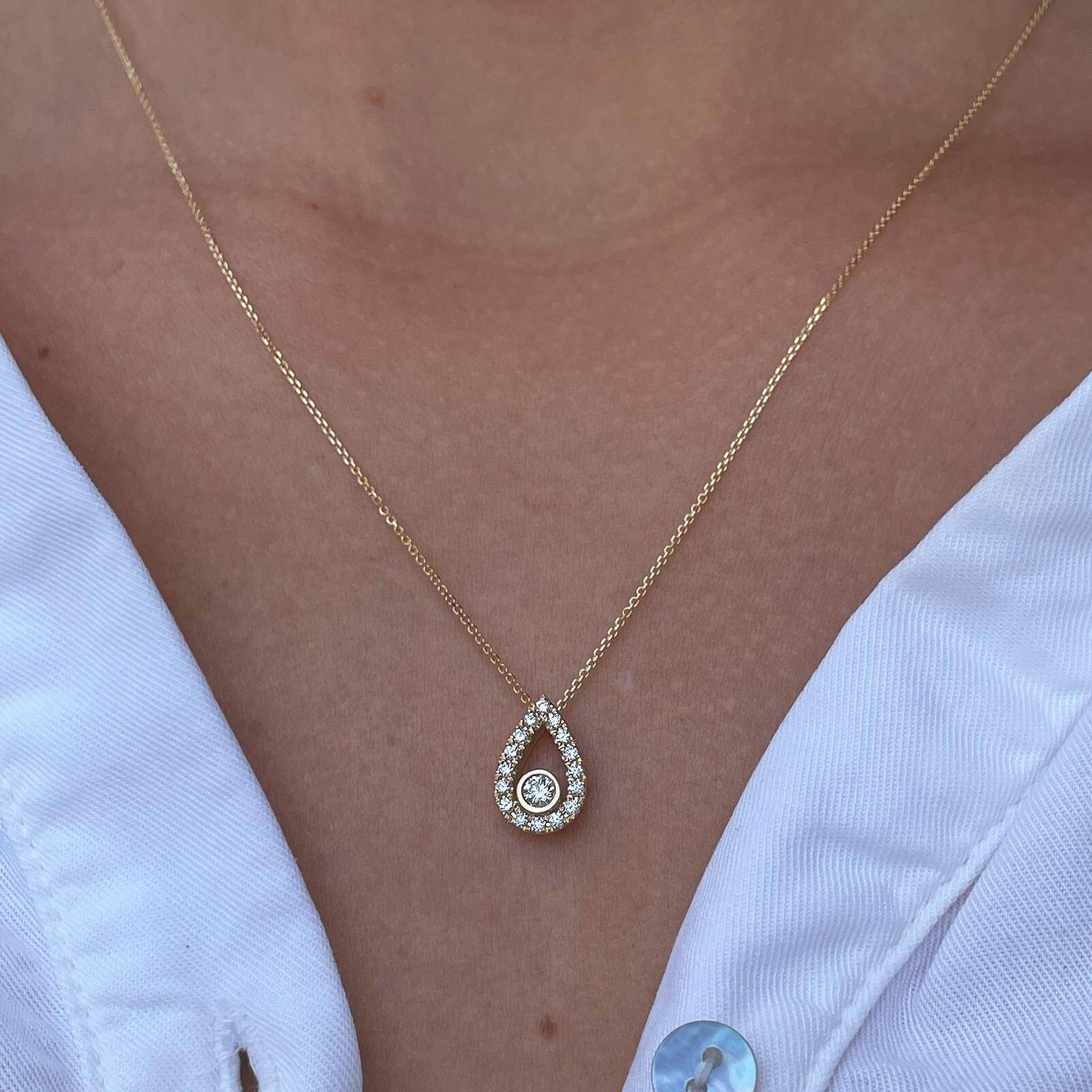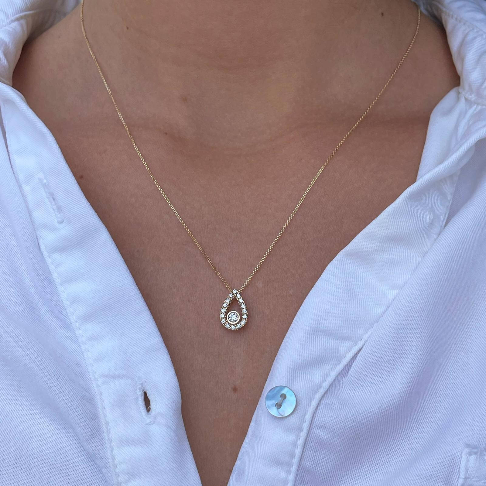 A trendy and refreshing pear shaped diamond pendant, set with 0.10 carat center diamond and small white diamonds around weighing 0.20 carats. A diamond pendant with a fresh, light presence on your neck. Total diamonds 0.30 weight carats.