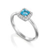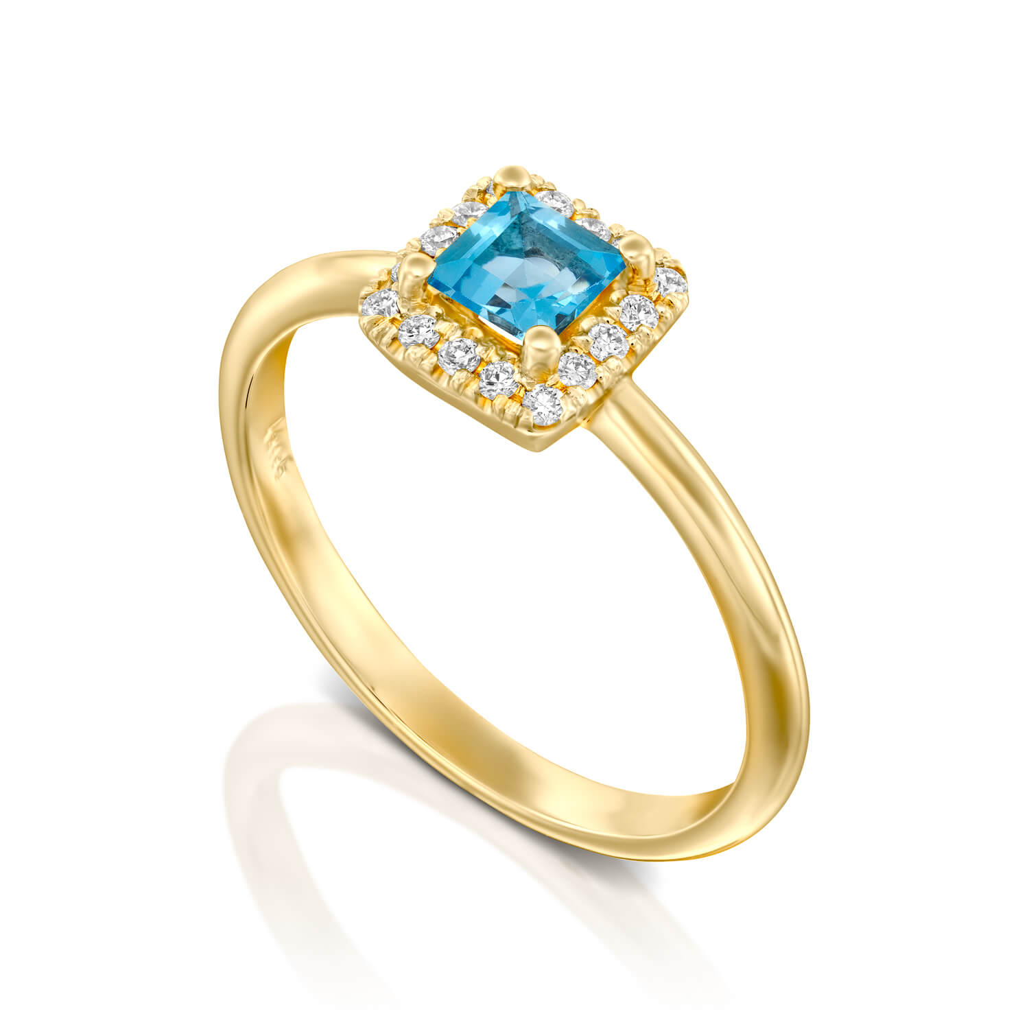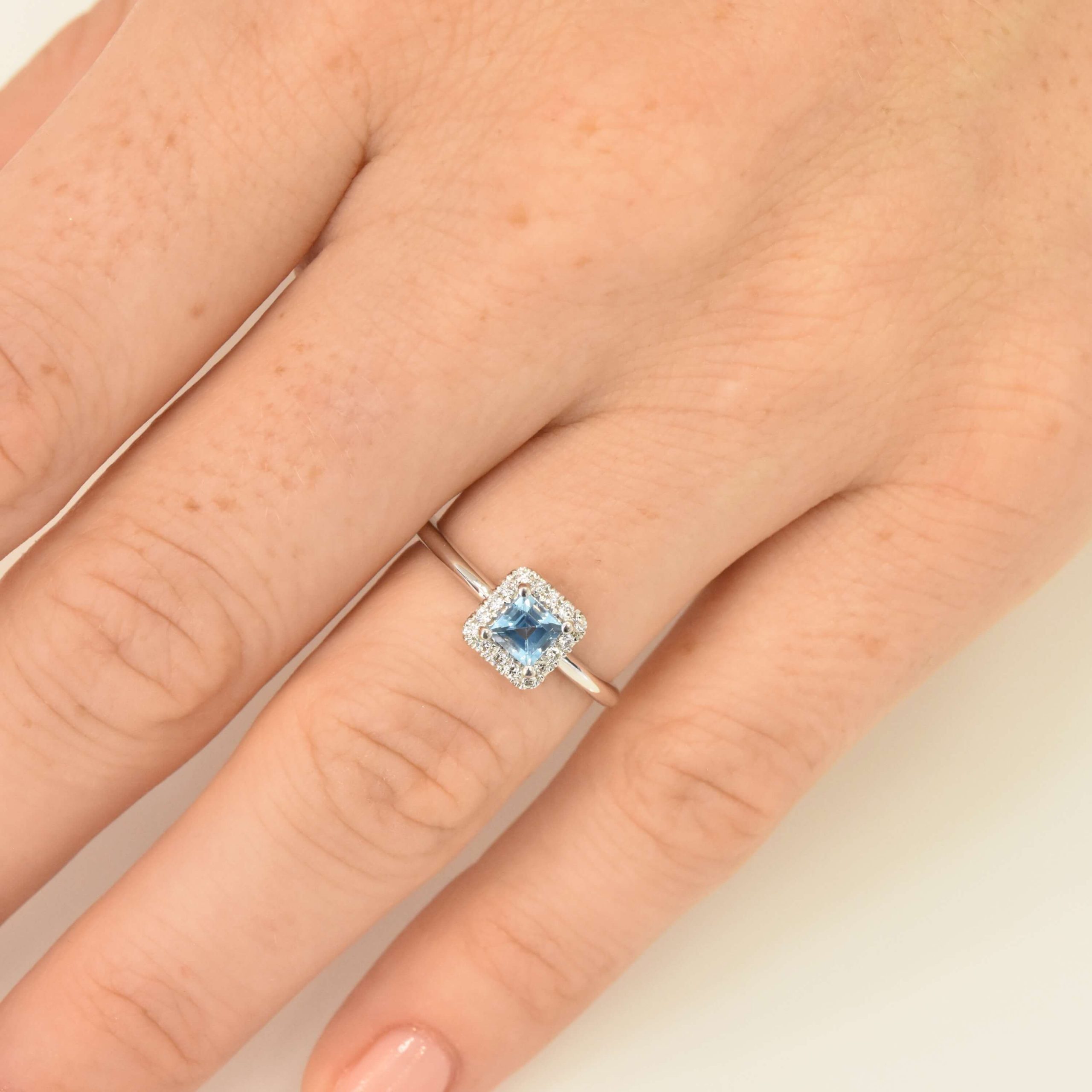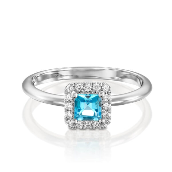 This engagement ring displays a beautiful princess topaz in center stage, enhanced by the dazzling halo.