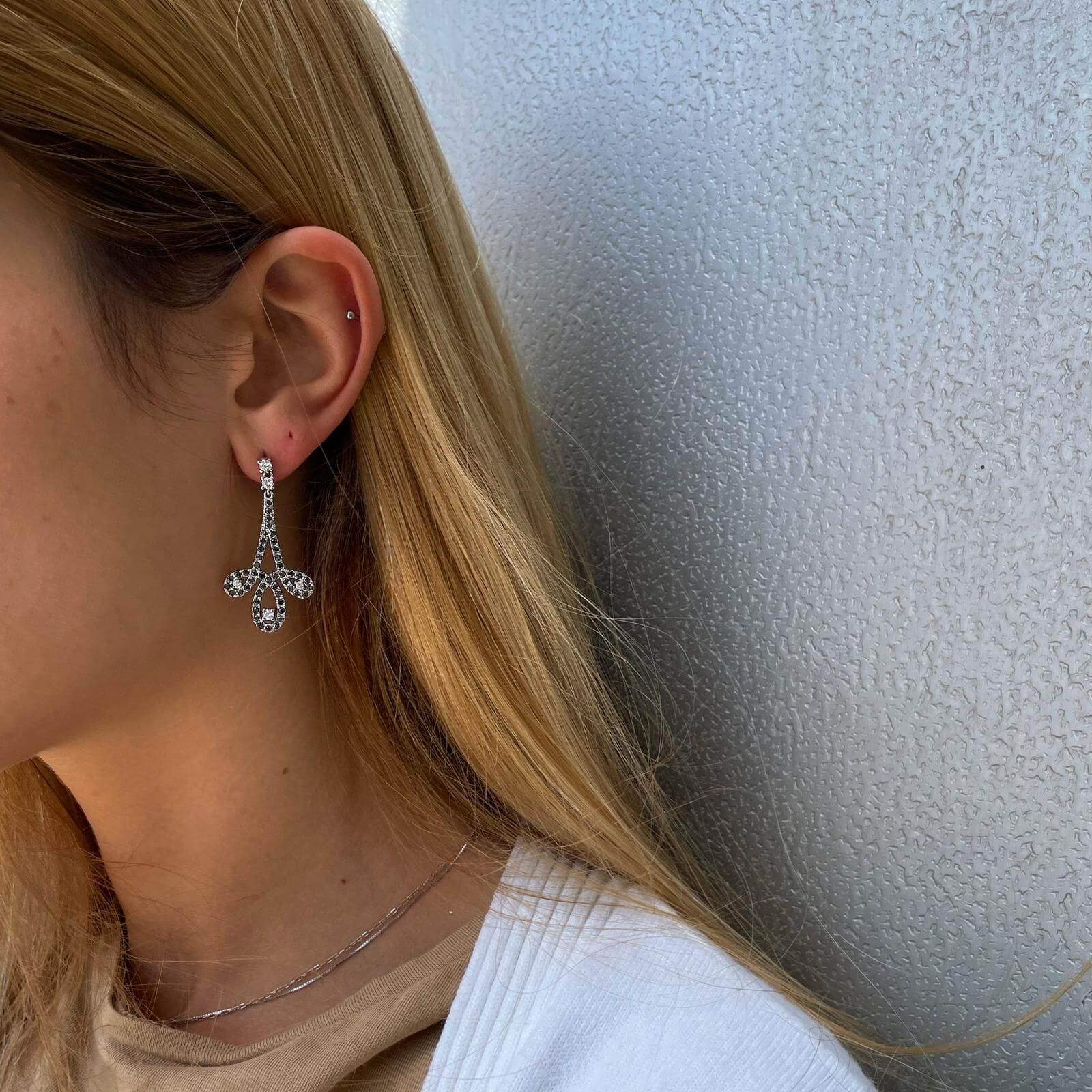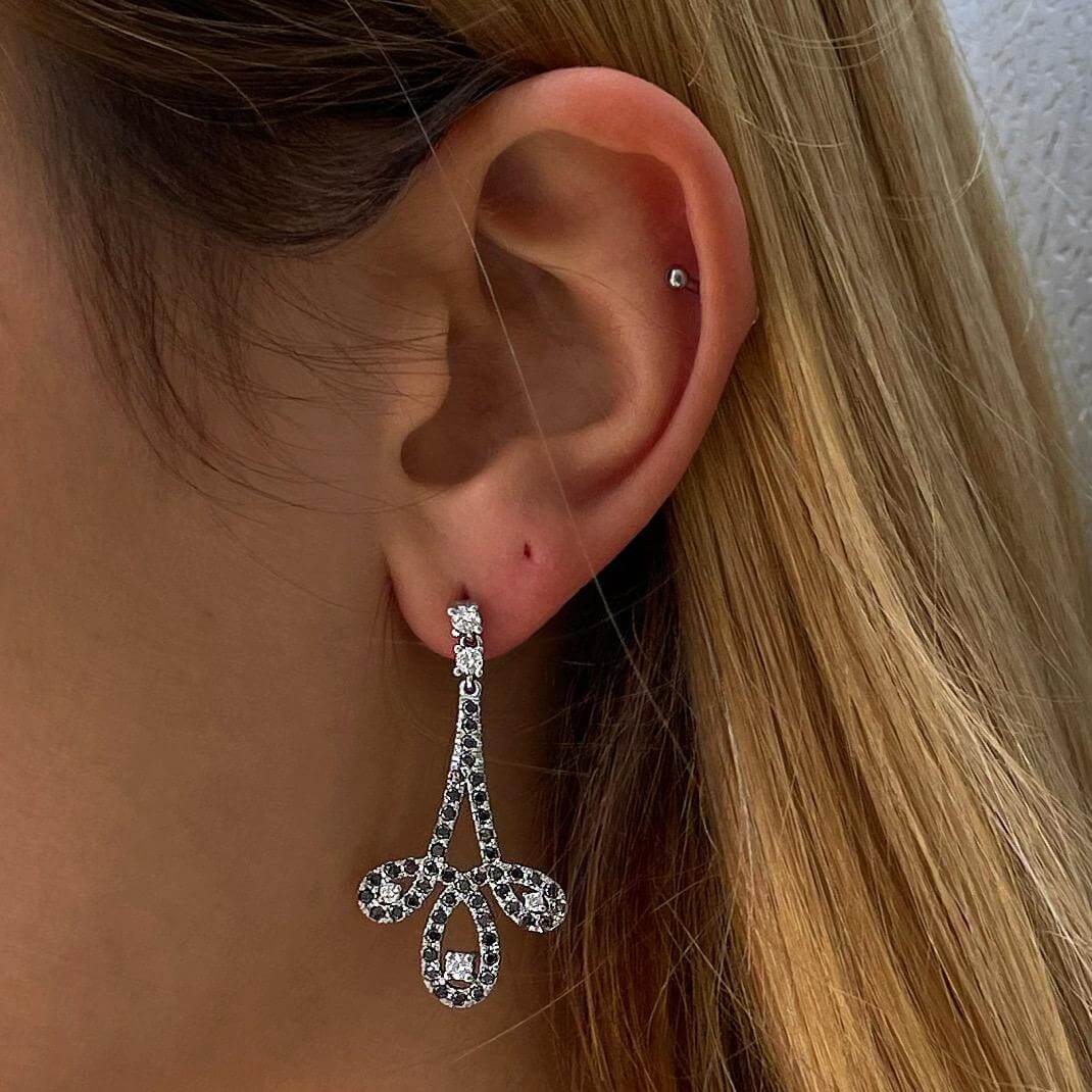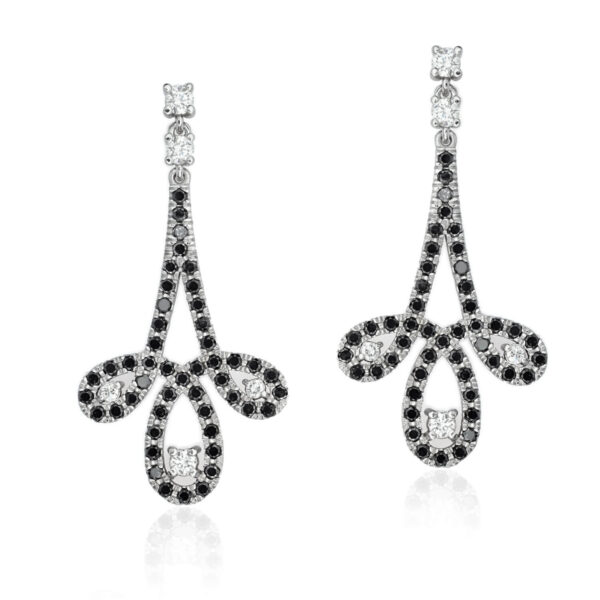 Unique diamond drop earrings set with 106 white and black diamonds weighing 1.87ct. 0.43 carats of white diamonds and 1.44 carats of black diamonds. These diamond earrings are elegant and impressive, designed for glamorous social events.