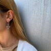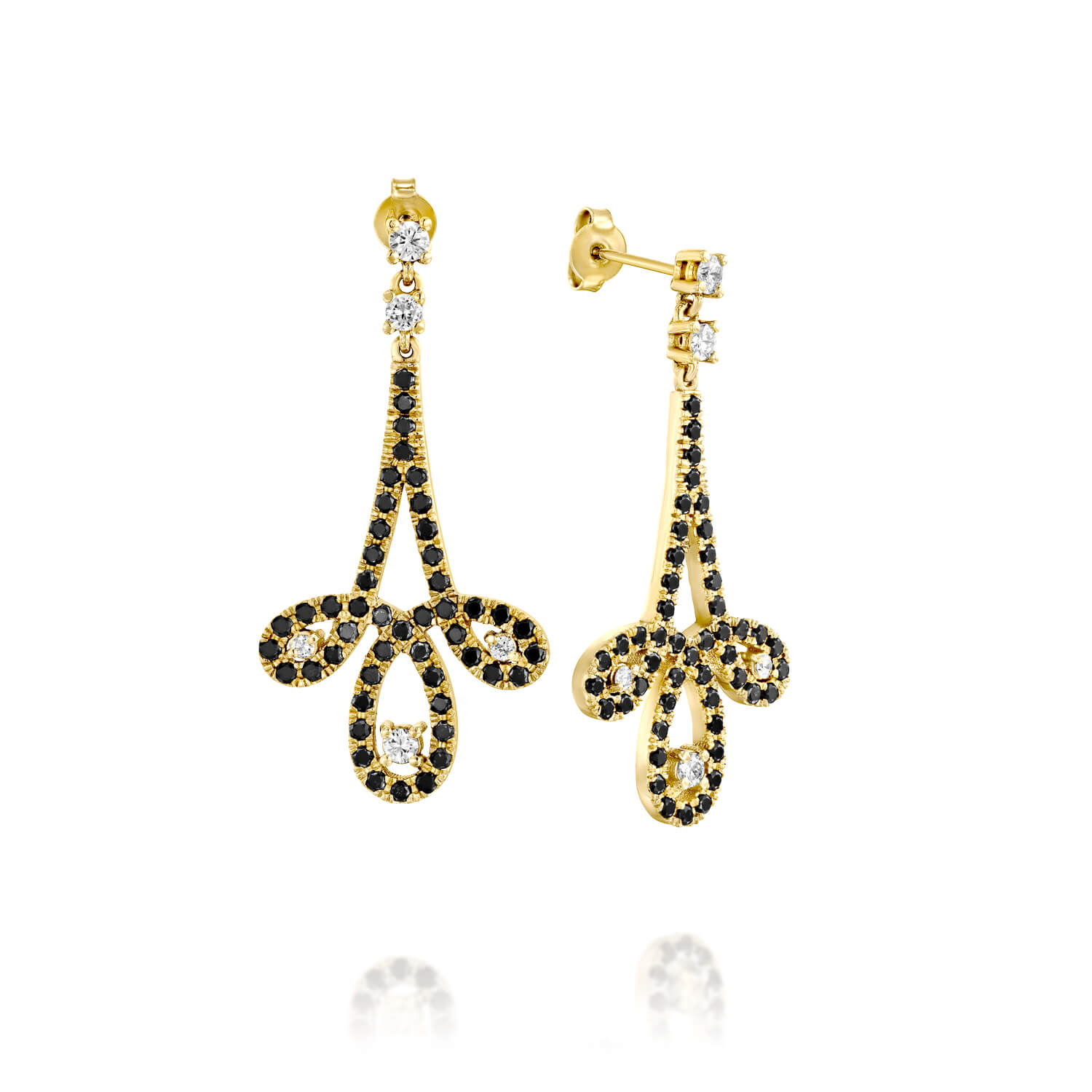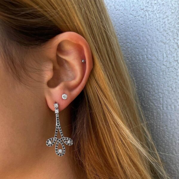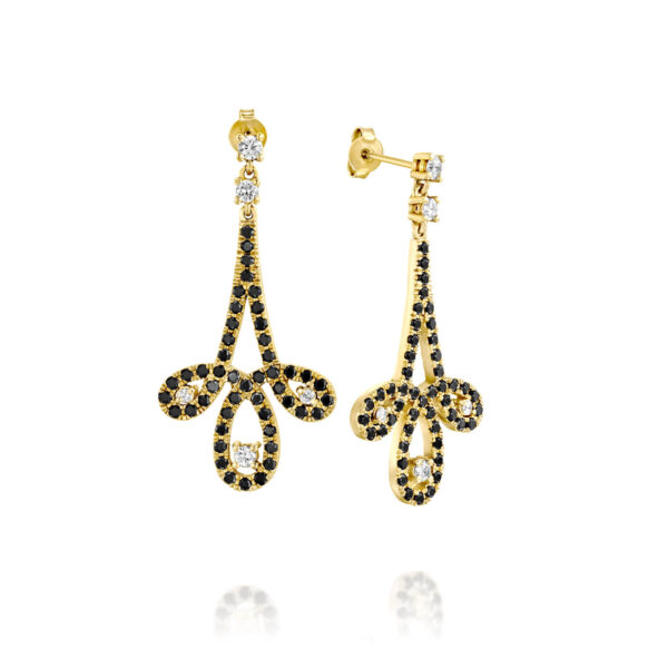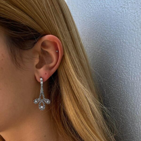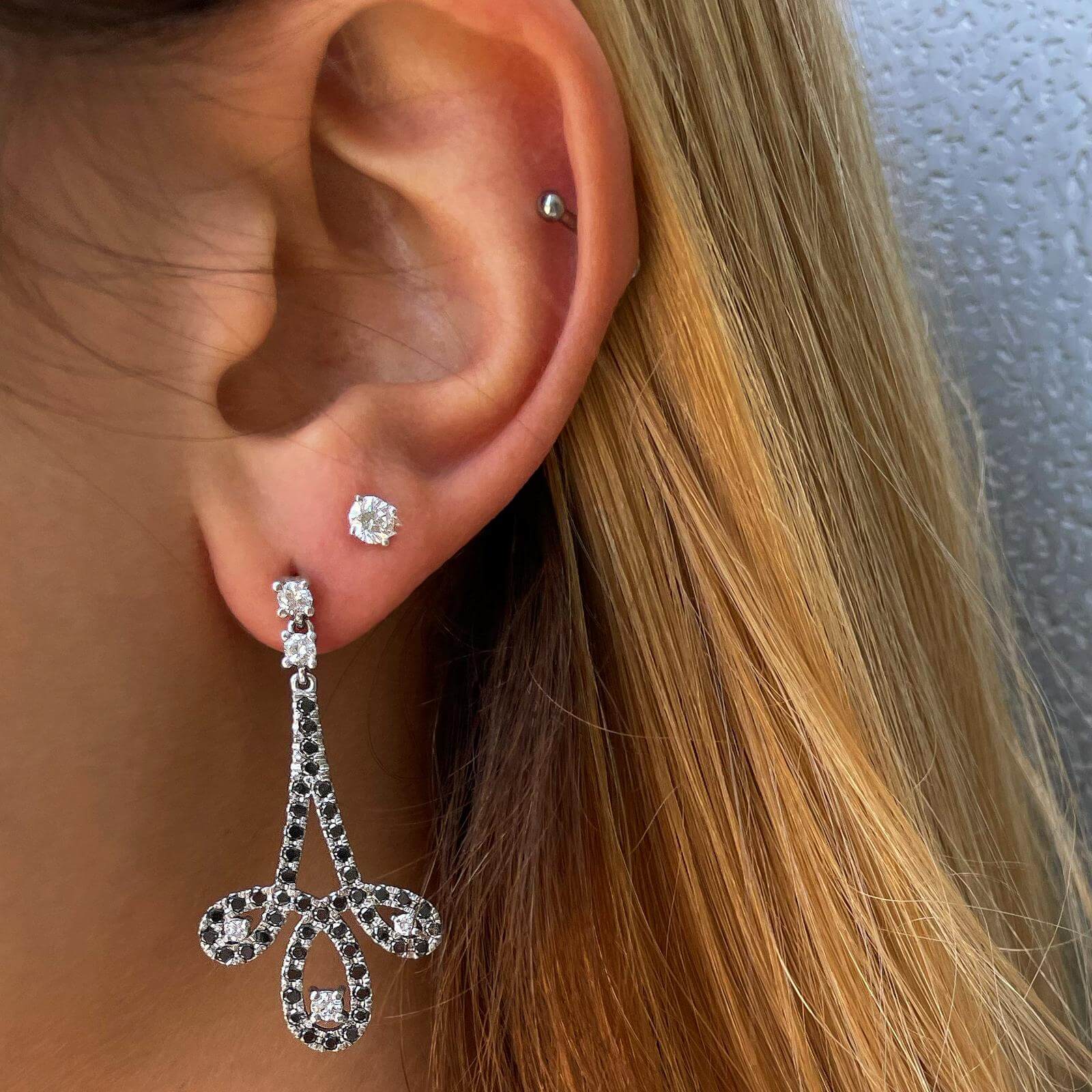 Unique diamond drop earrings set with 106 white and black diamonds weighing 1.87ct. 0.43 carats of white diamonds and 1.44 carats of black diamonds. These diamond earrings are elegant and impressive, designed for glamorous social events.