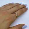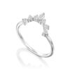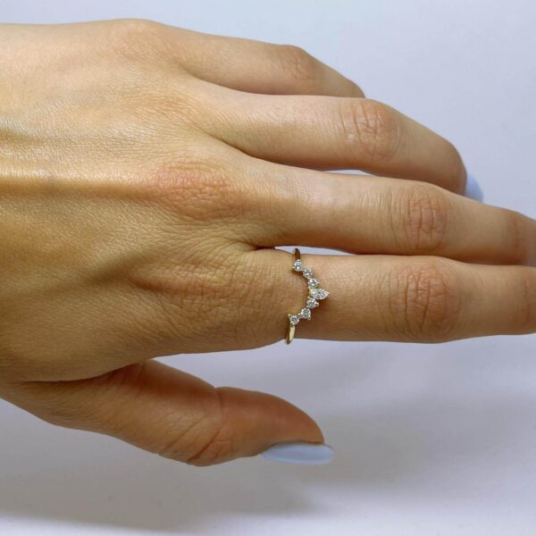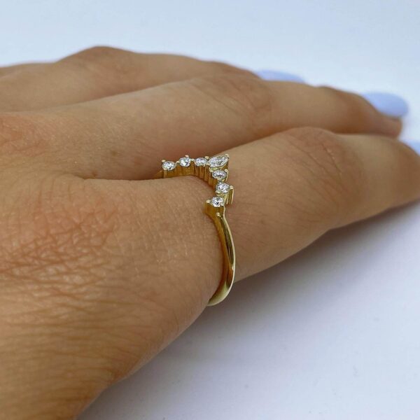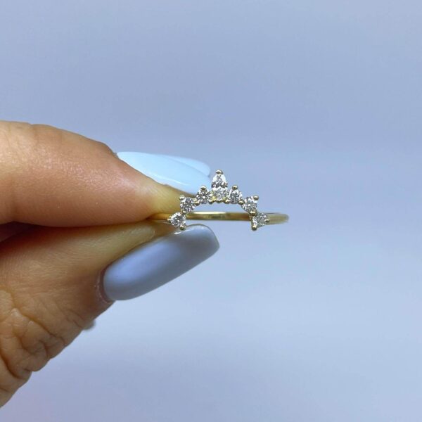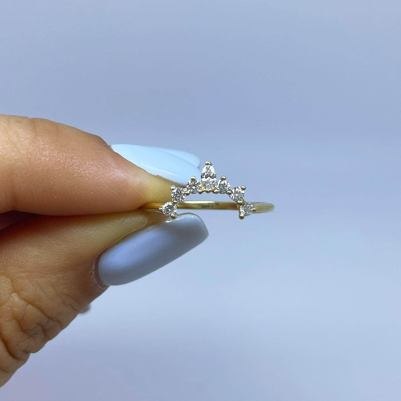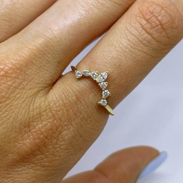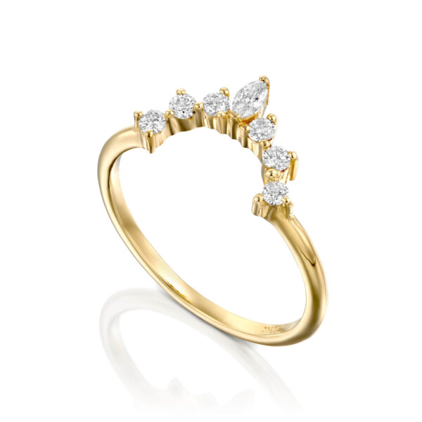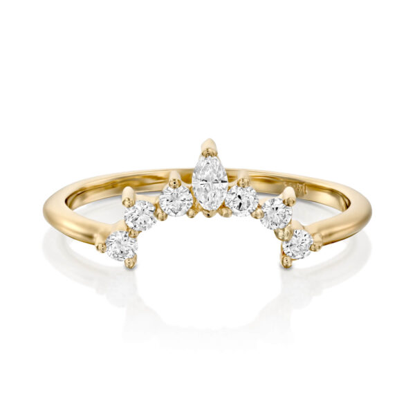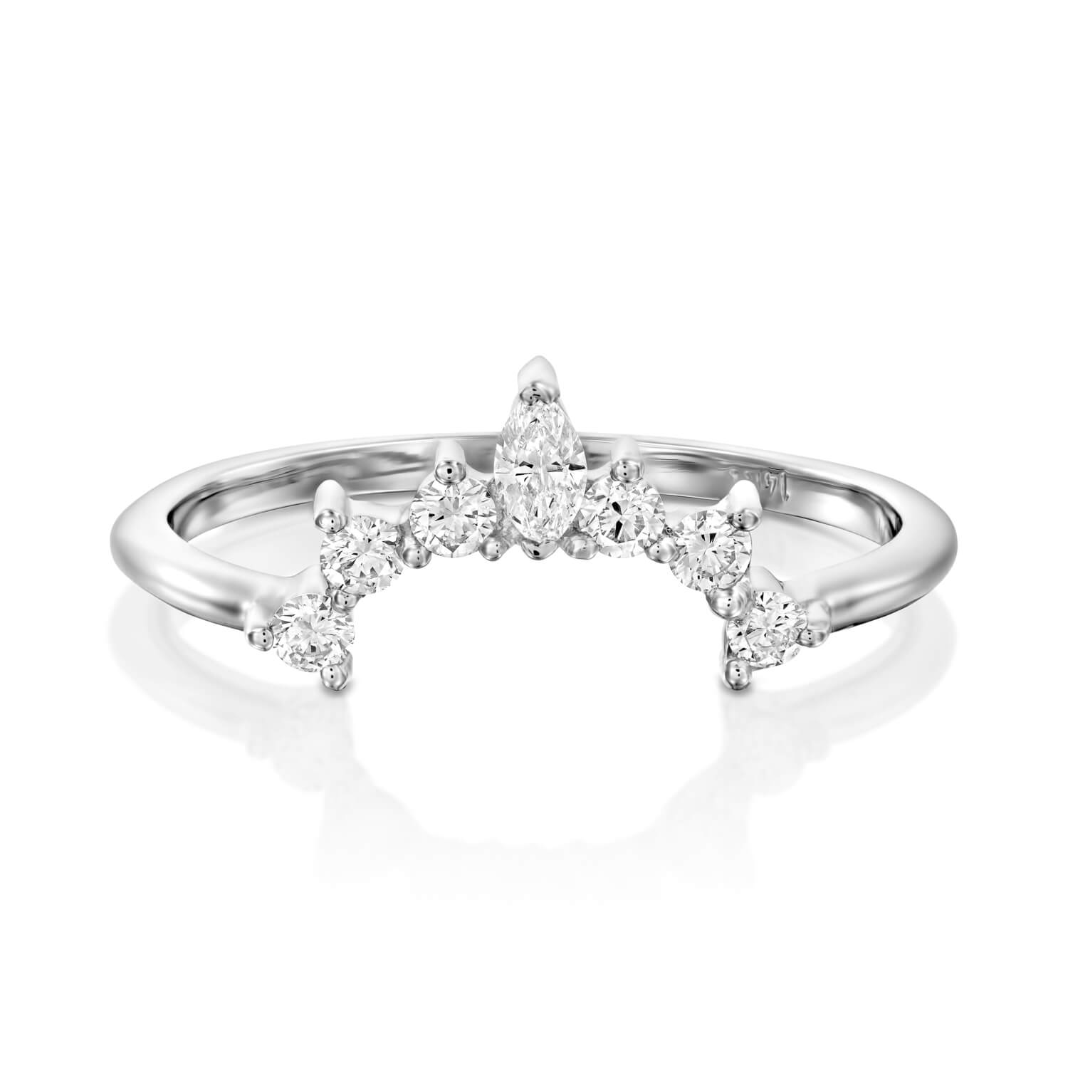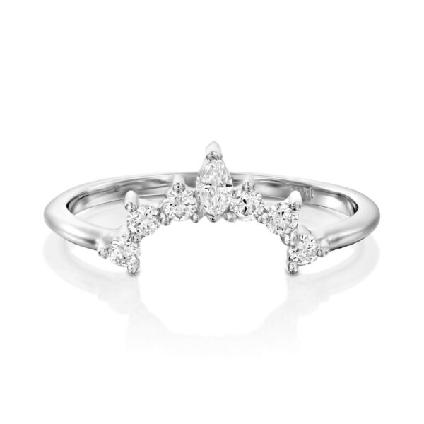 Trendy and delicate crown ring set with a marquise shape diamond weighing 0.06ct in the center and 6 white sparkling diamonds weighing 0.17 carats total. A designed diamond ring that can be worn alone on your finger or attached to an engagement ring.