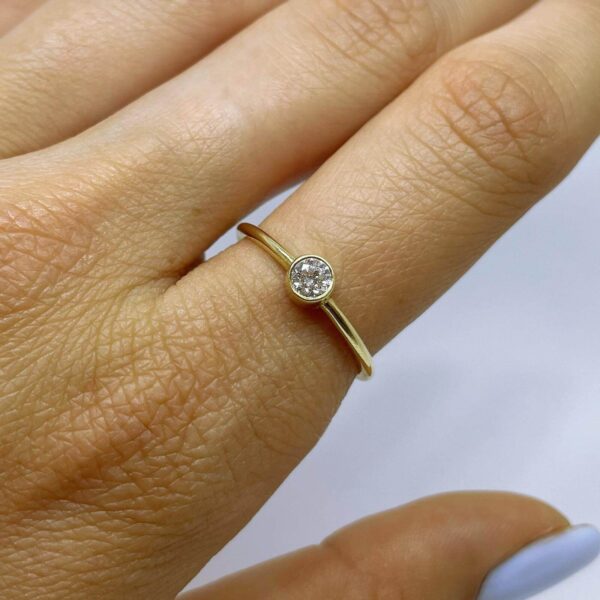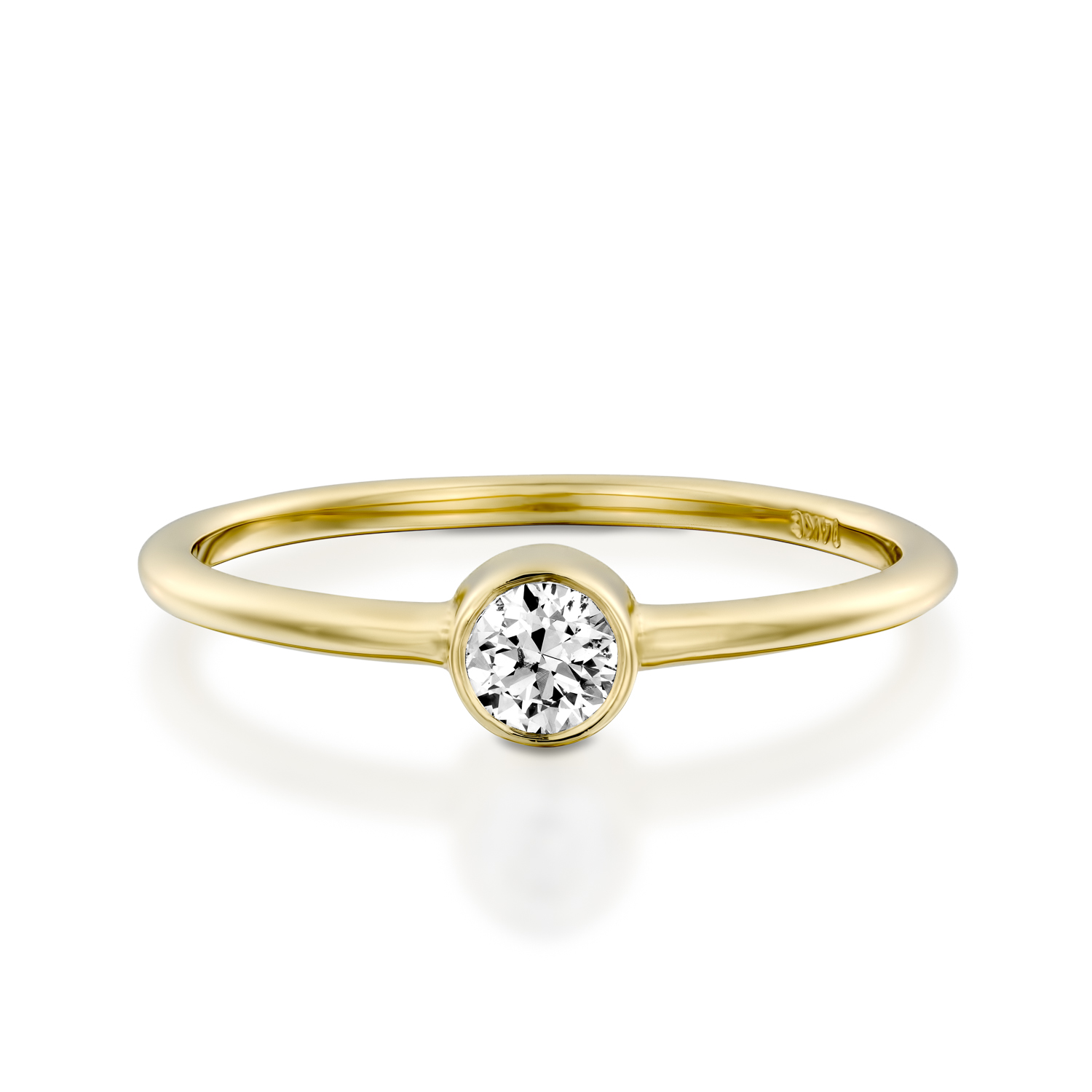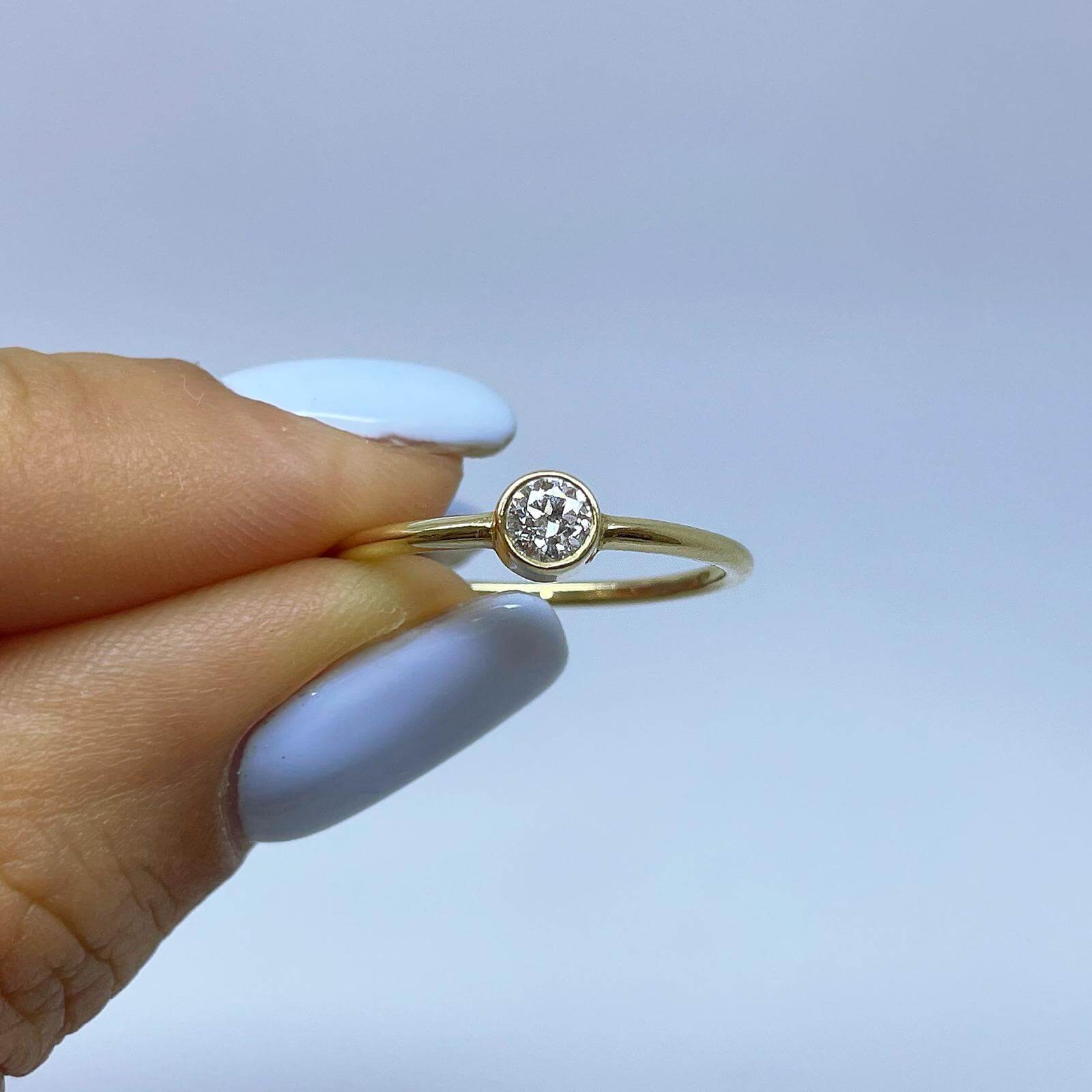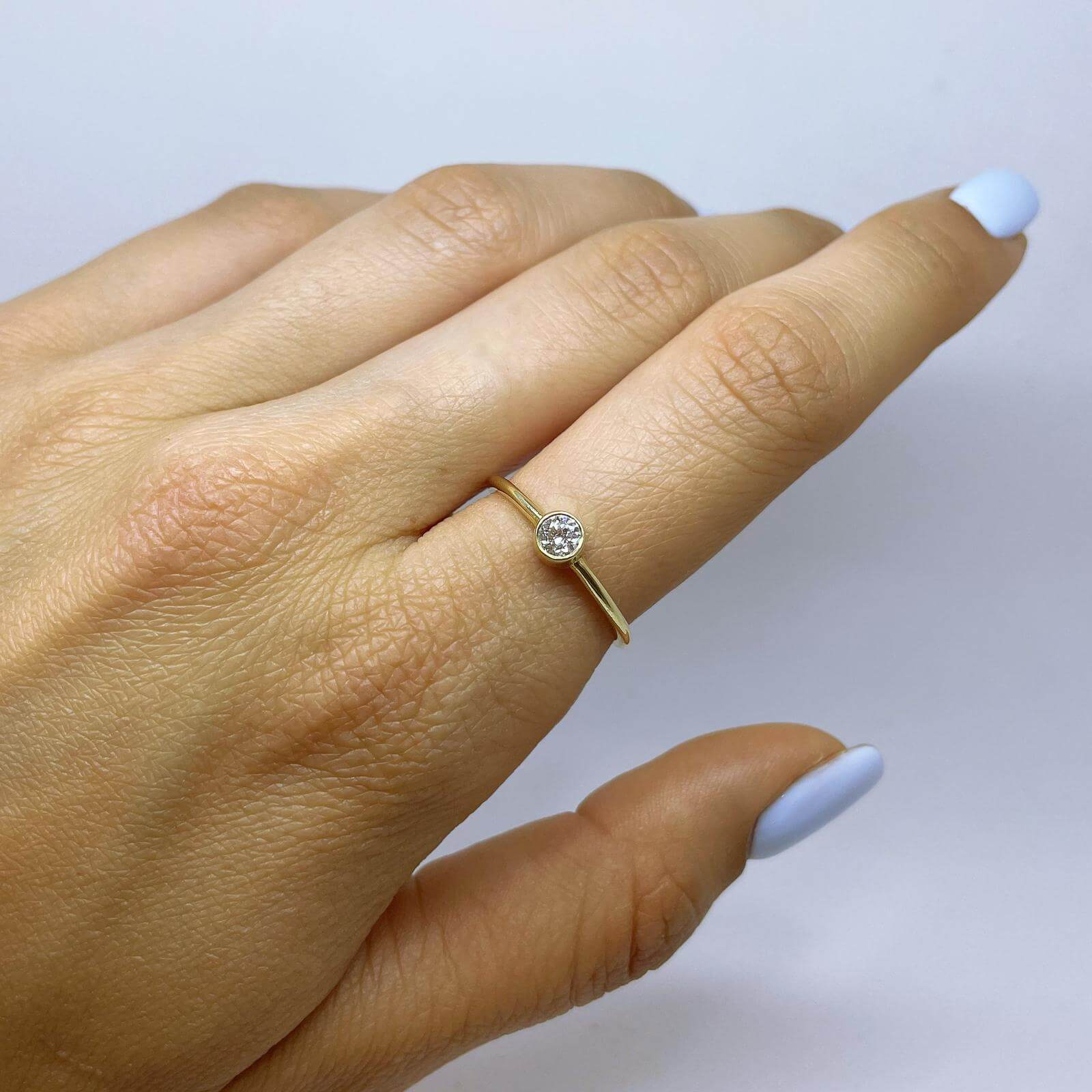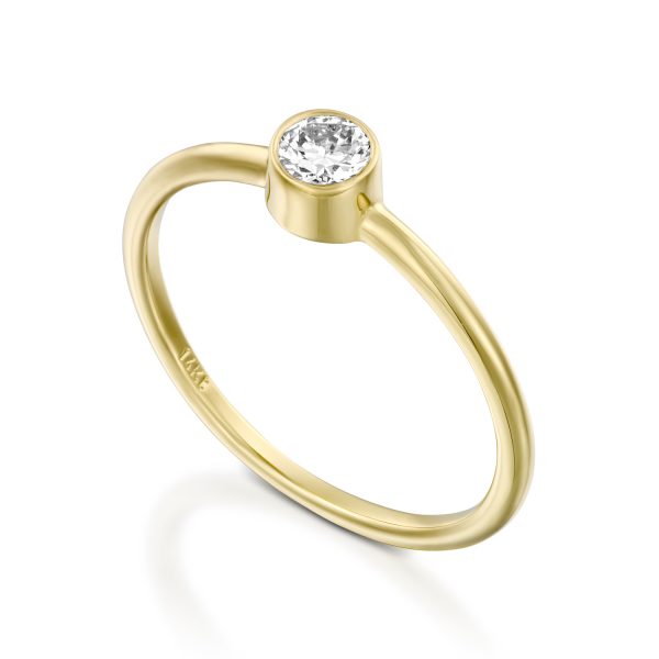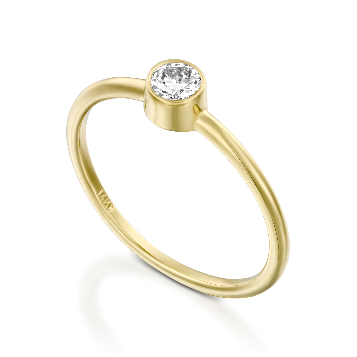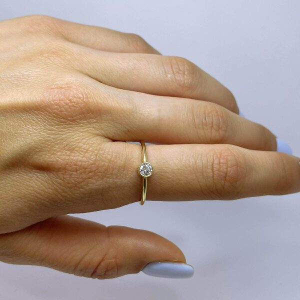 A delicate and modern ring features a 0.20ct center diamond. Around the diamond, there are delicate lines of gold that focus the attention on the diamond.