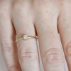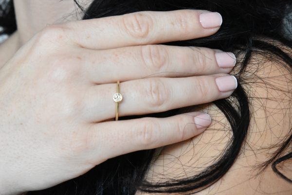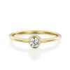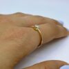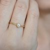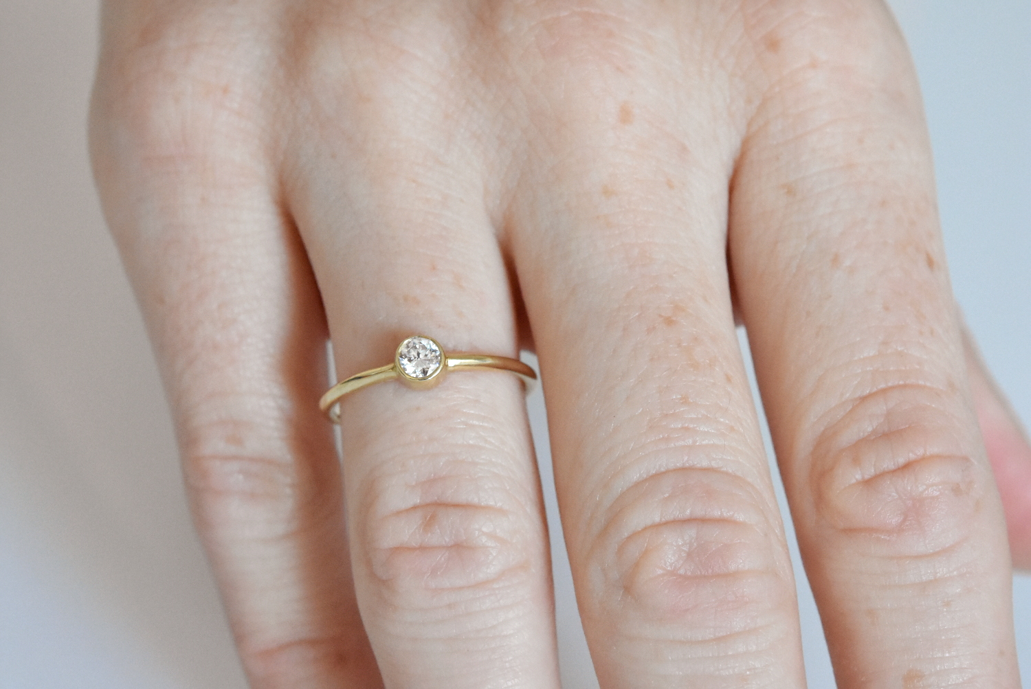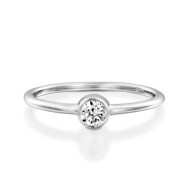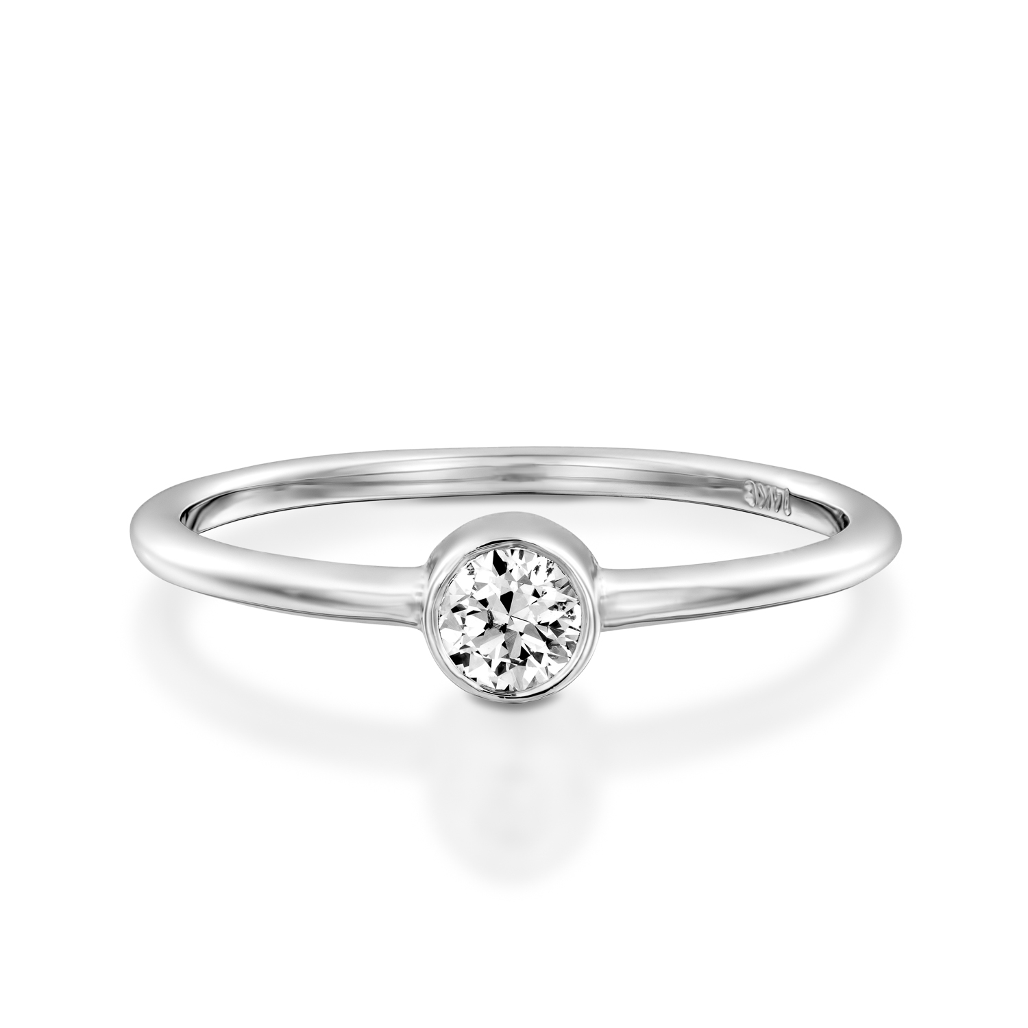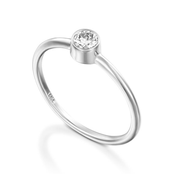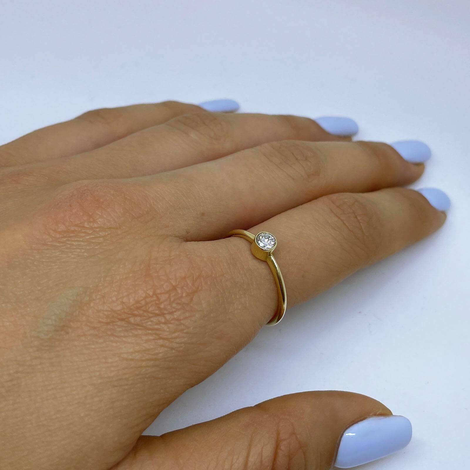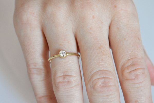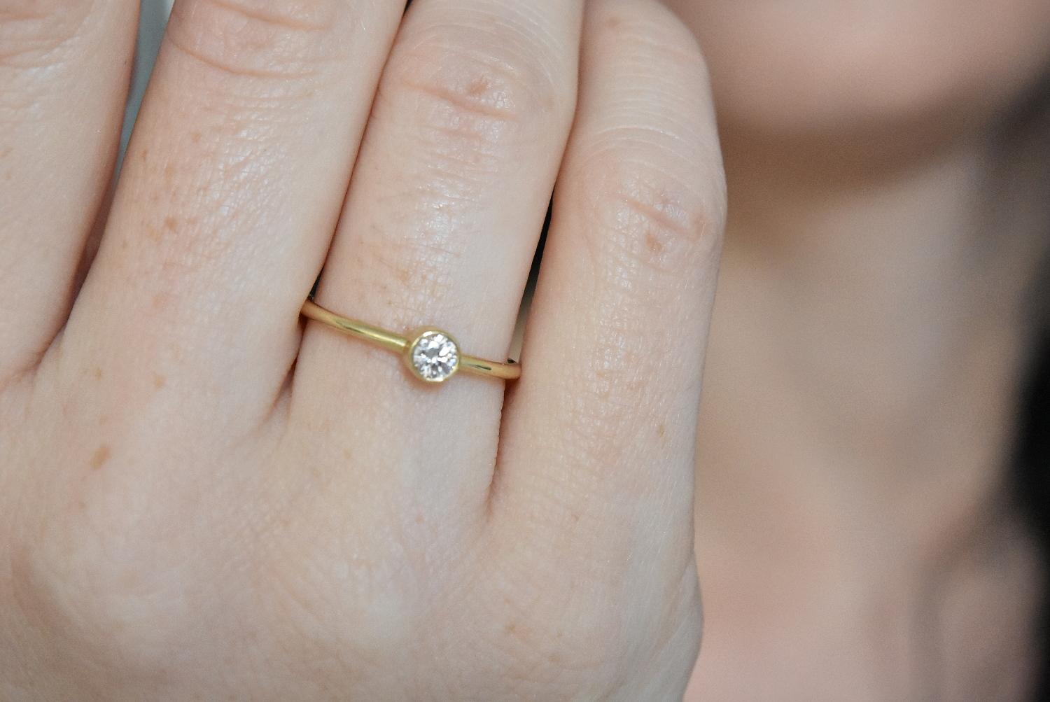 A delicate and modern ring features a 0.20ct center diamond. Around the diamond, there are delicate lines of gold that focus the attention on the diamond.