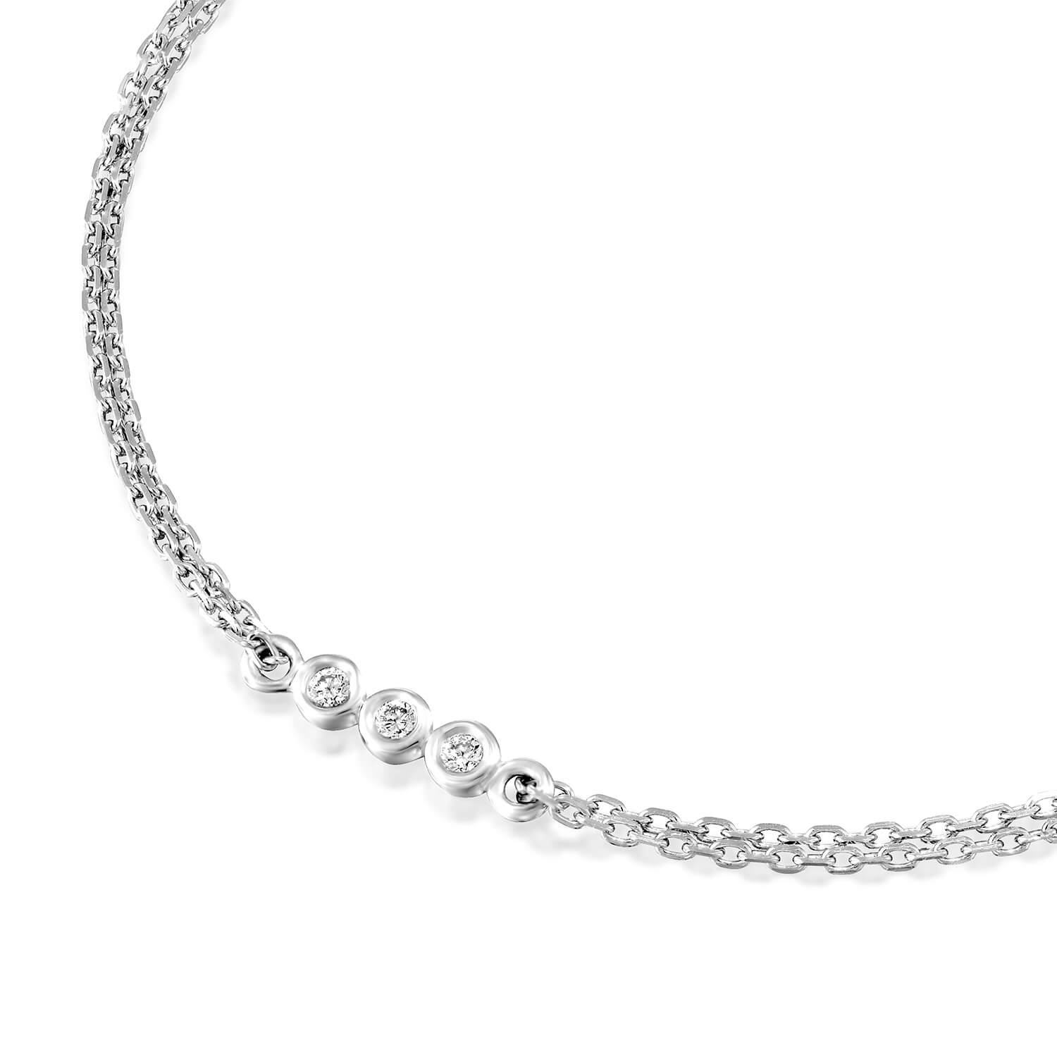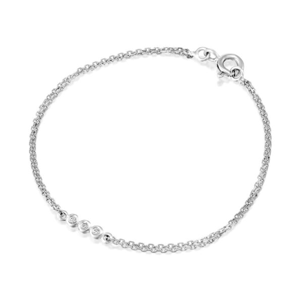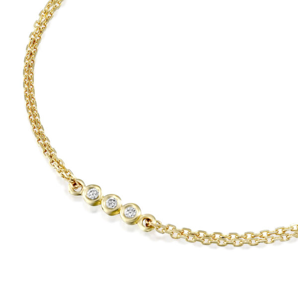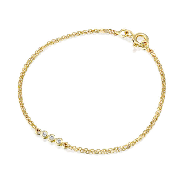 A delicate and fashionable diamond bracelet features three high quality diamonds weighing total 0.05 carats. A diamond bracelet made of three gold cups, each with a sparkling diamond.