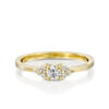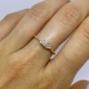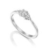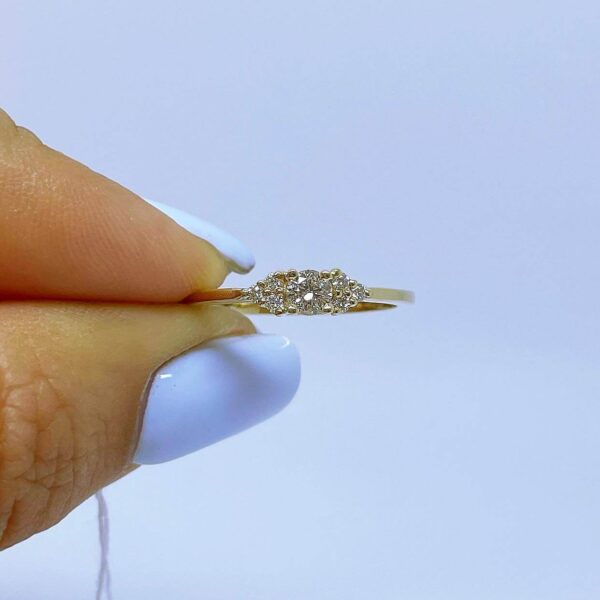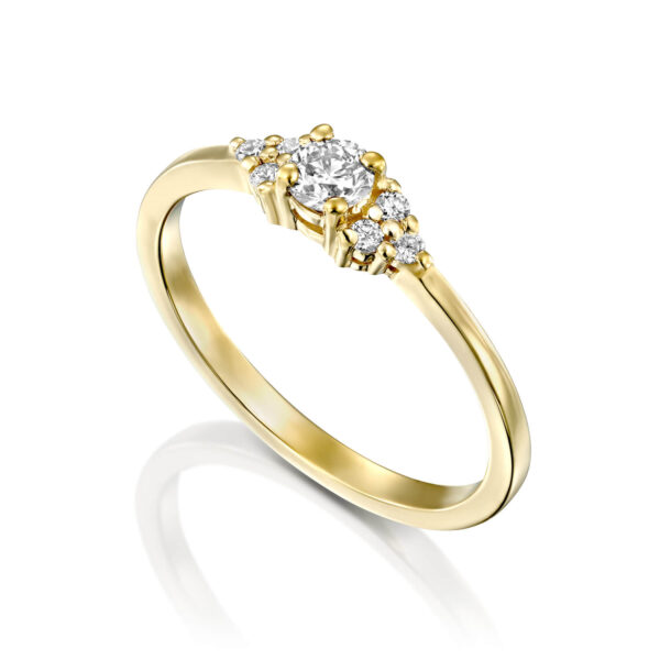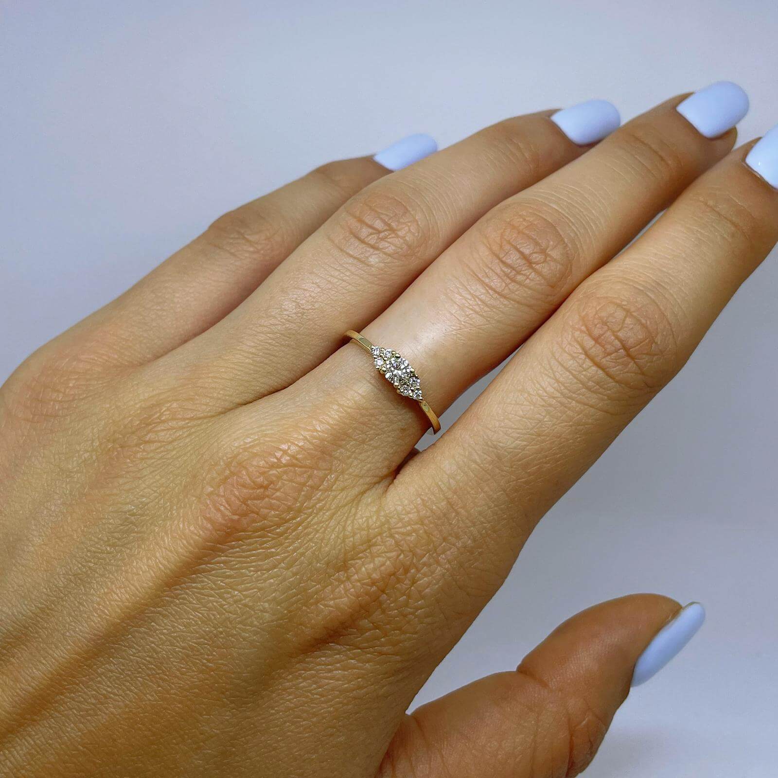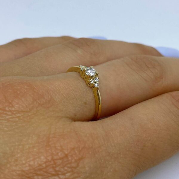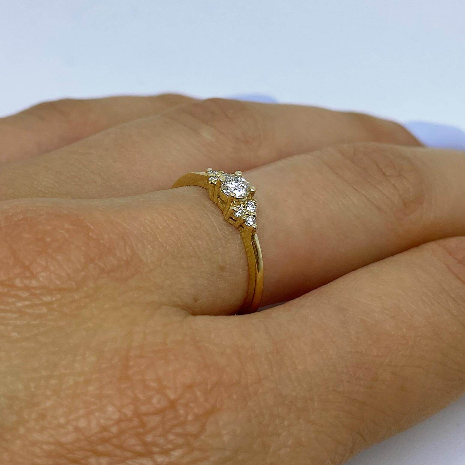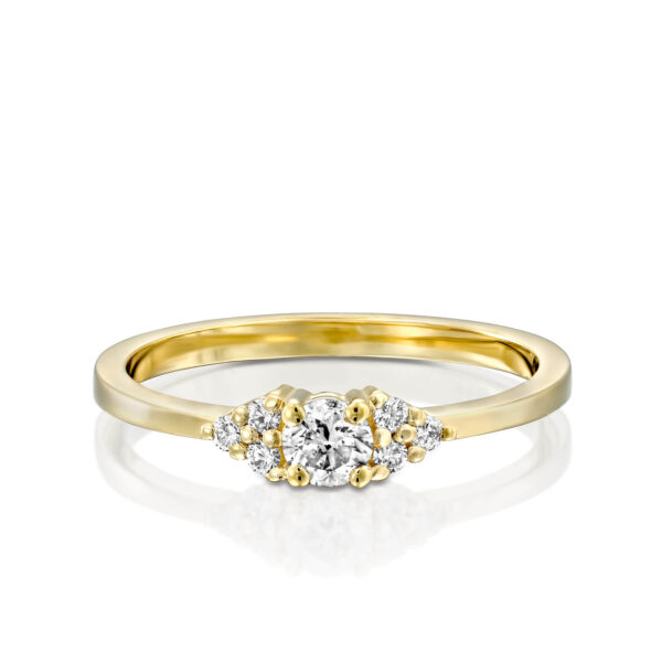 A delicate and fashionable engagement ring features a 0.15ct center diamond and 0.08ct side diamonds. An engagement ring that reminds you of a ring of three diamonds, on each side three small diamonds that form a triangle and the appearance of one large diamond.