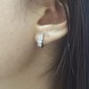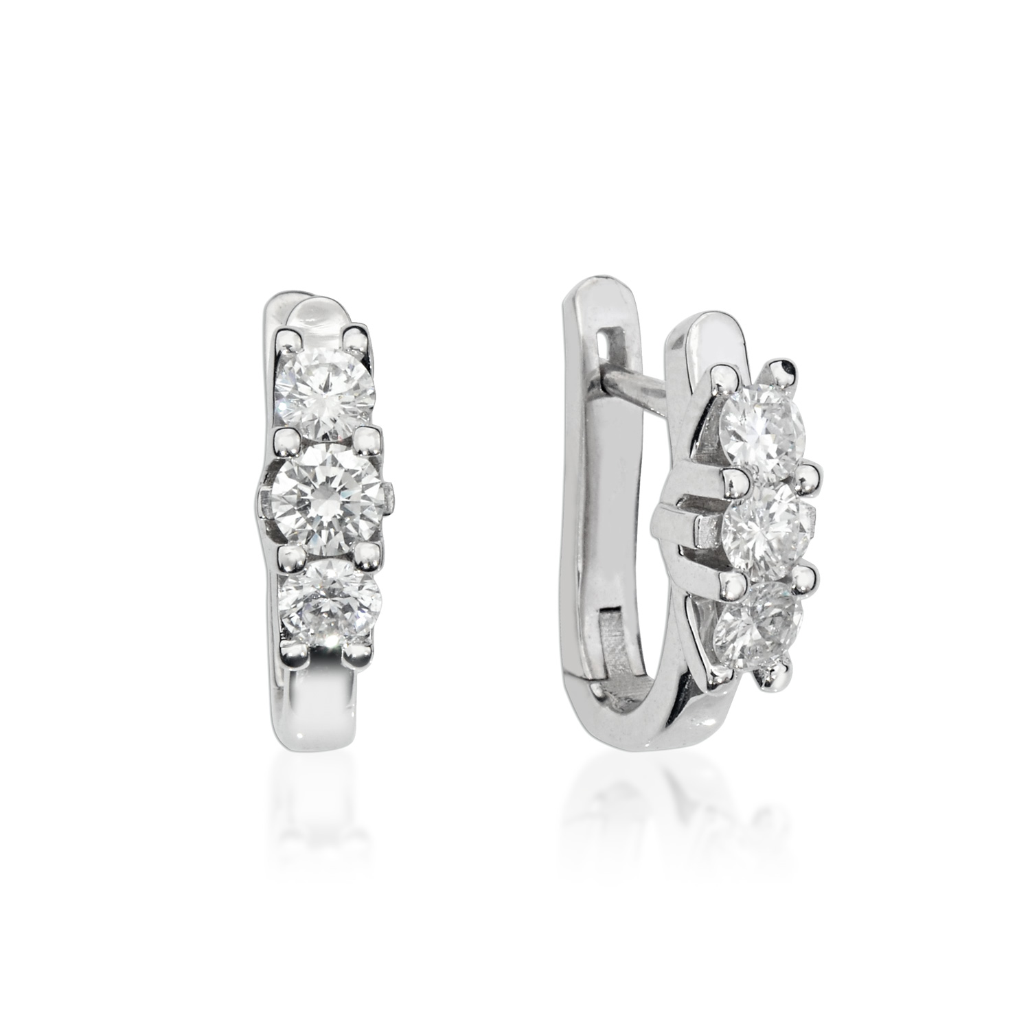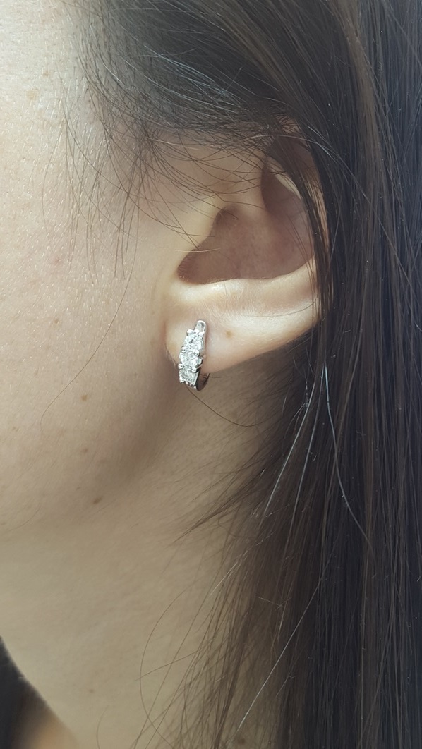 Diamond hoop earrings with three noticeable shiny diamonds in each earring. Elegant earrings with a glamorous look for the modern working woman