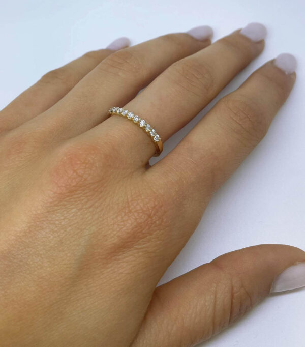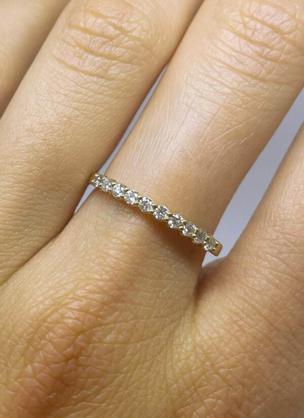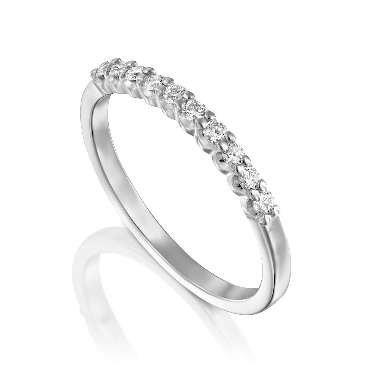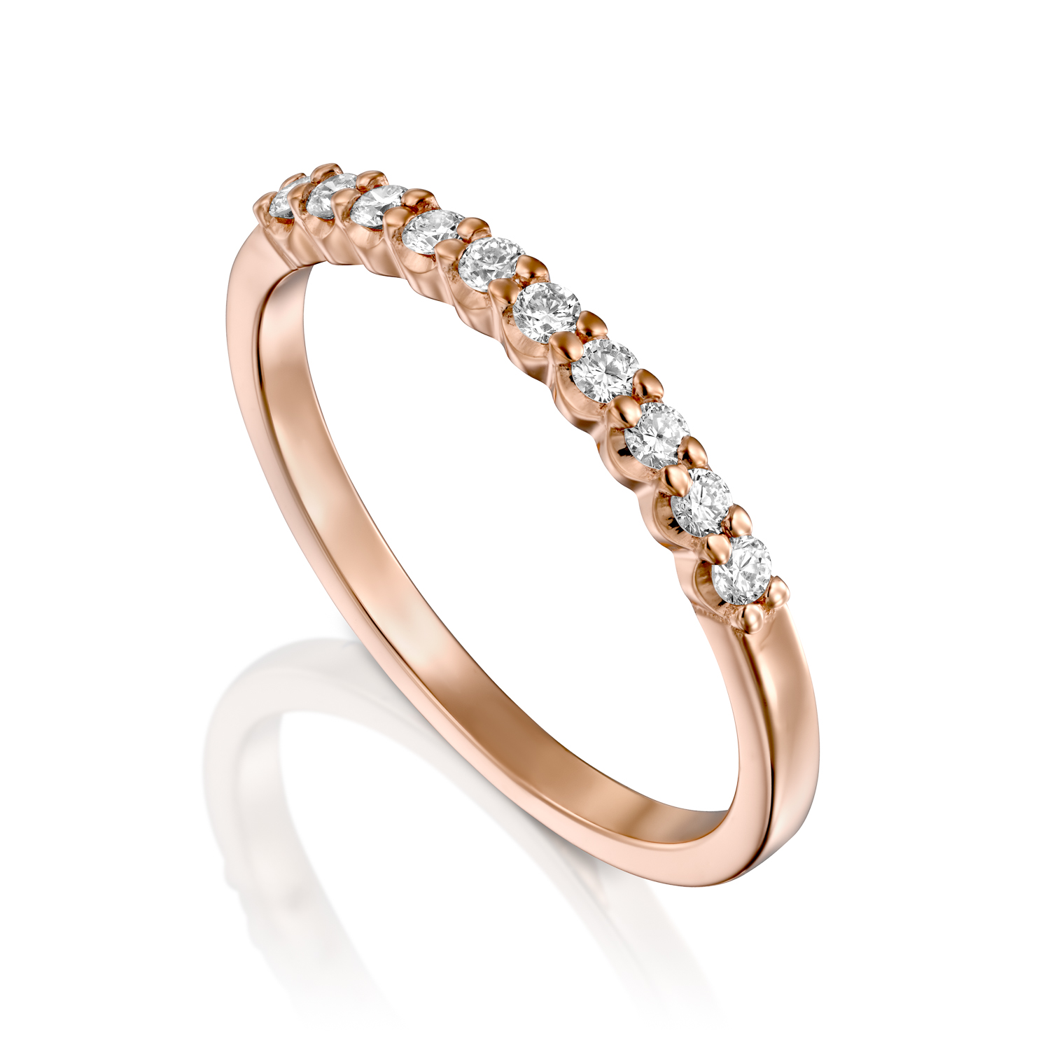 A fine and delicate row diamond ring set with 10 sparkling diamonds weighing 0.20 carats total. A diamond ring decorated with small inverted arches that can be seen from the side and that exposes the diamonds to maximum light and enhances their sparkle.