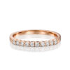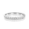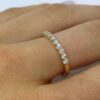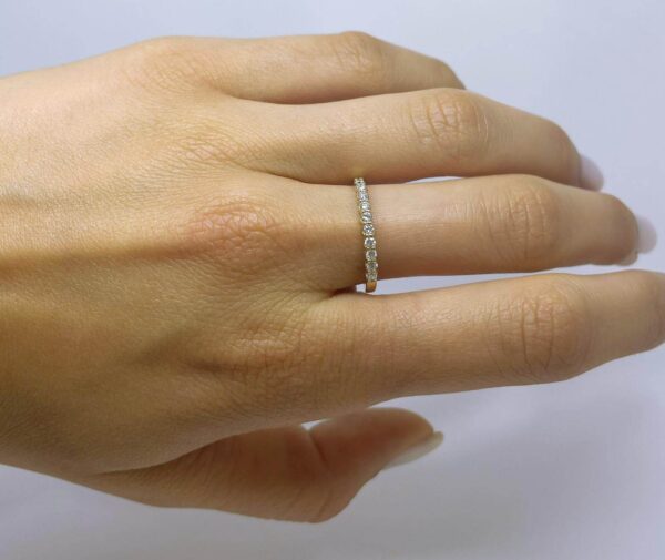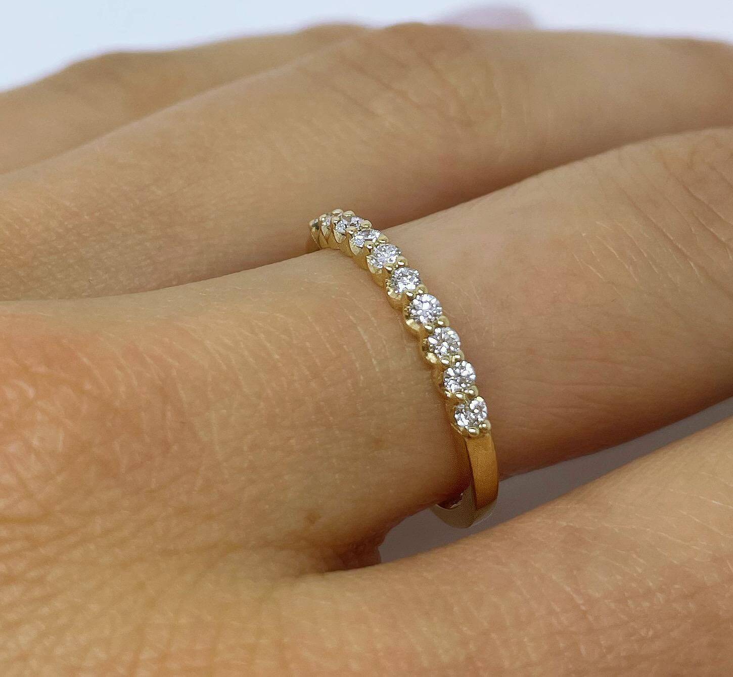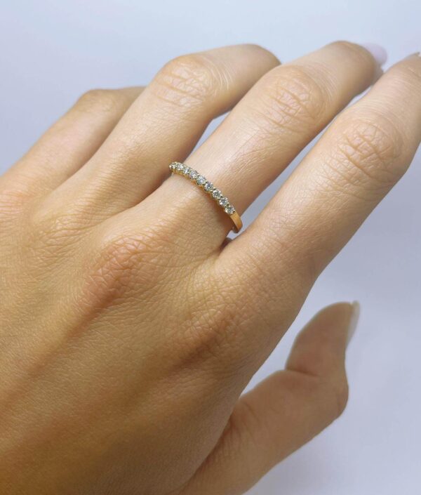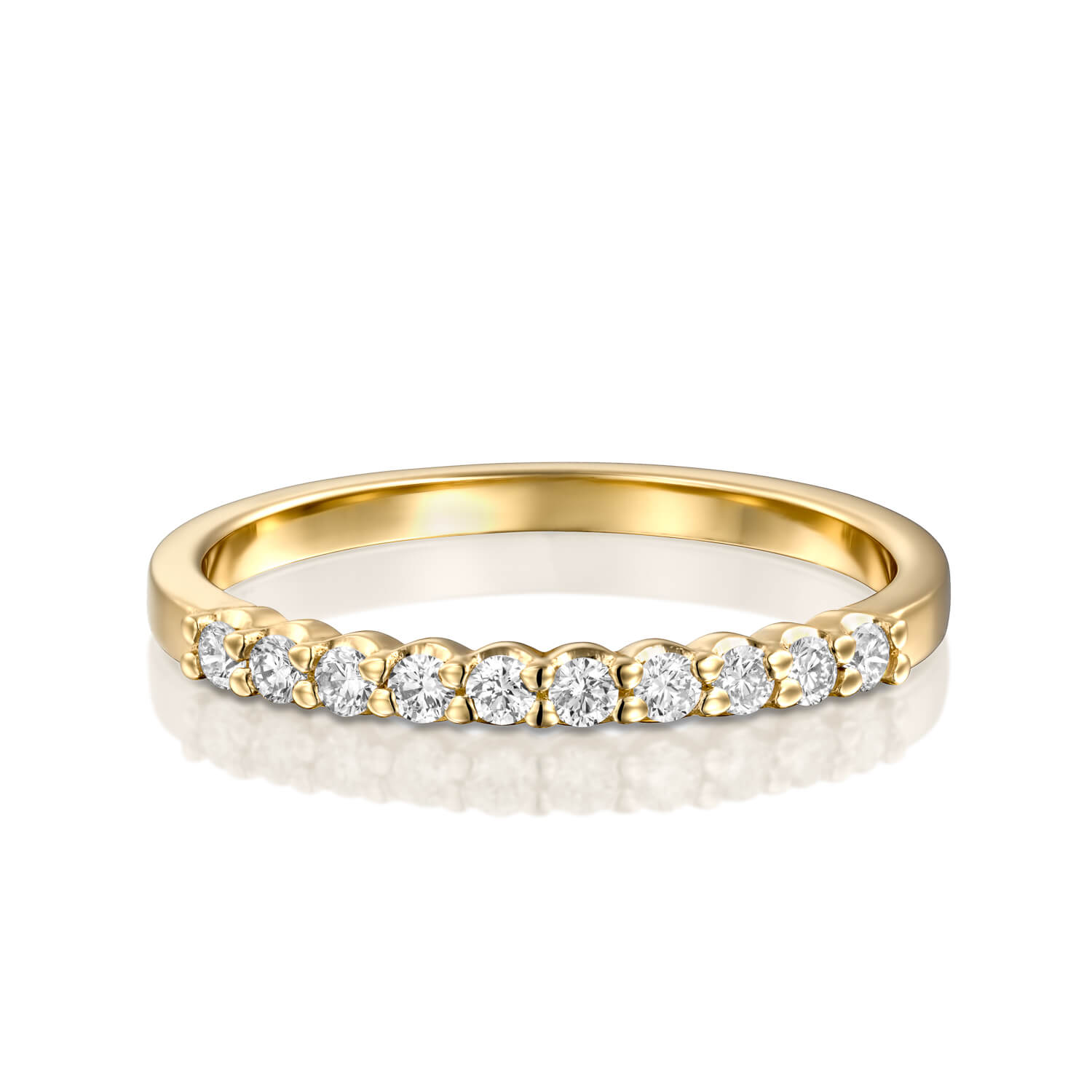 A fine and delicate row diamond ring set with 10 sparkling diamonds weighing 0.20 carats total. A diamond ring decorated with small inverted arches that can be seen from the side and that exposes the diamonds to maximum light and enhances their sparkle.