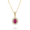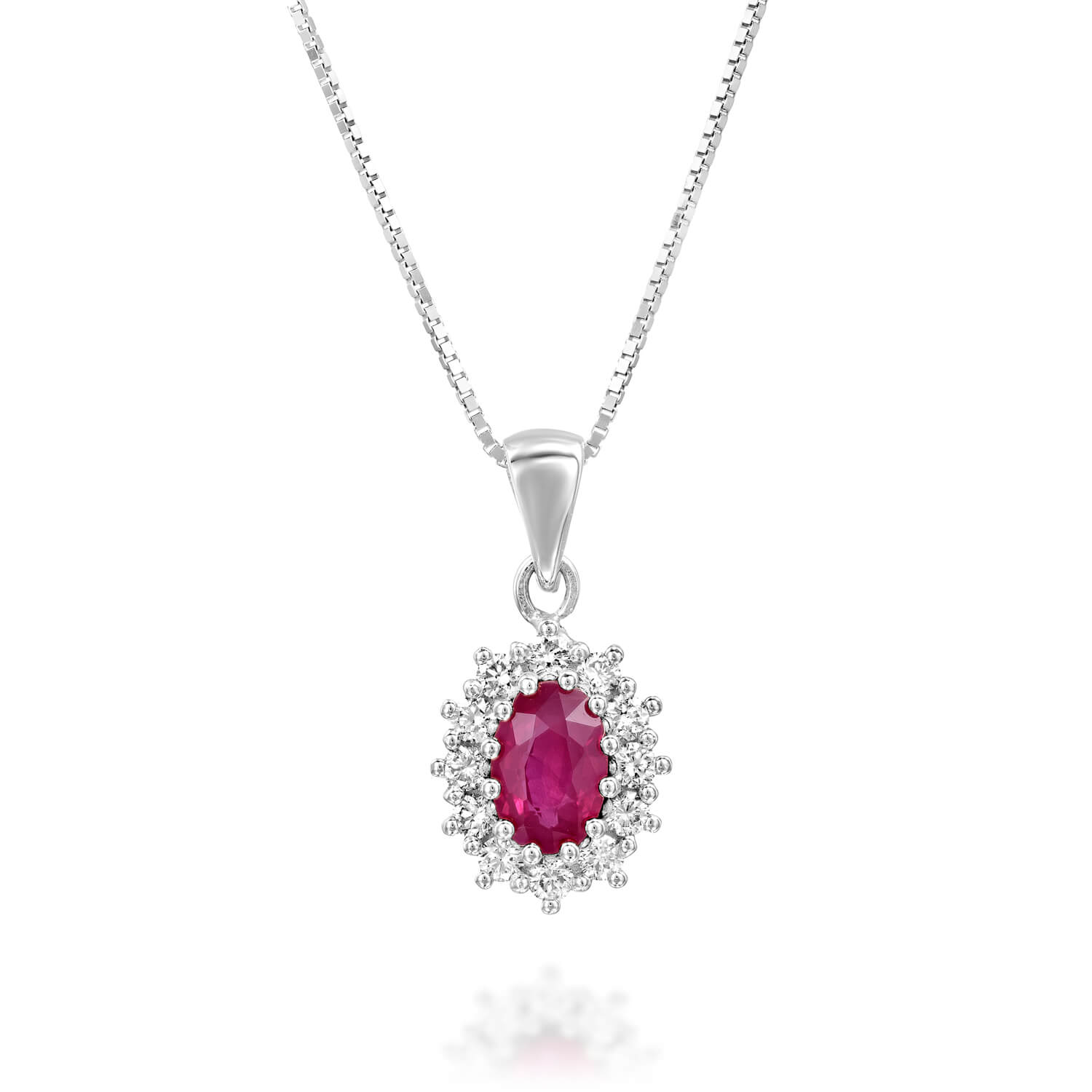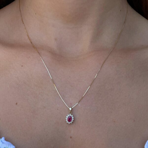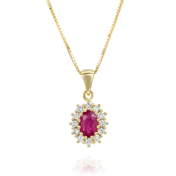 Stylish and special Diana pendant set with glittering and real 0.50 carat ruby in the center, surrounded by sparkling diamonds weighing 0.20 carats that enhance its prestige. This Diana pendant is carefully designed with an emphasis on the small details. The pendant stands out especially on the neckline, always fashionable and always fitting. Ideal for every day and special evenings.