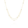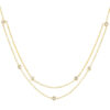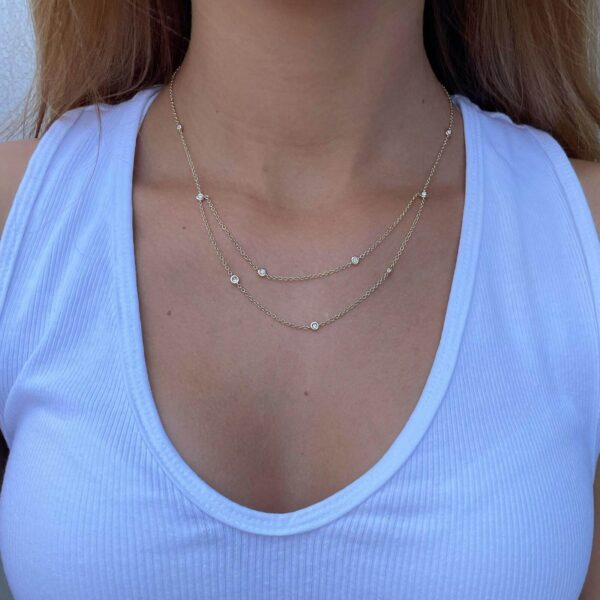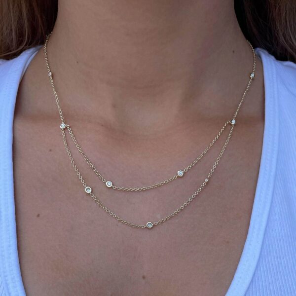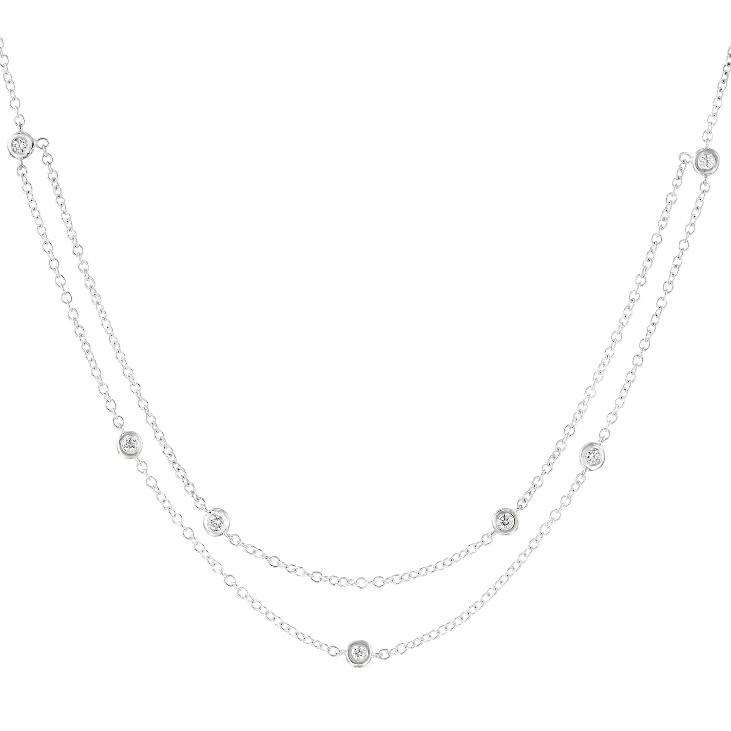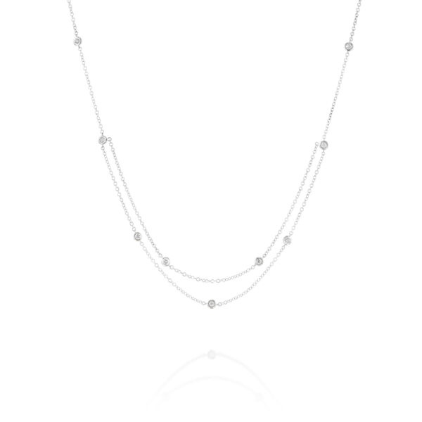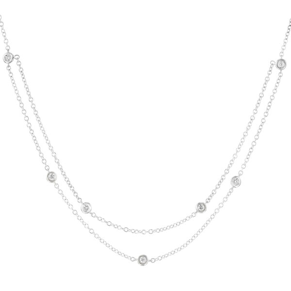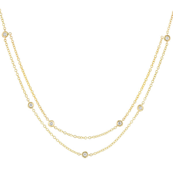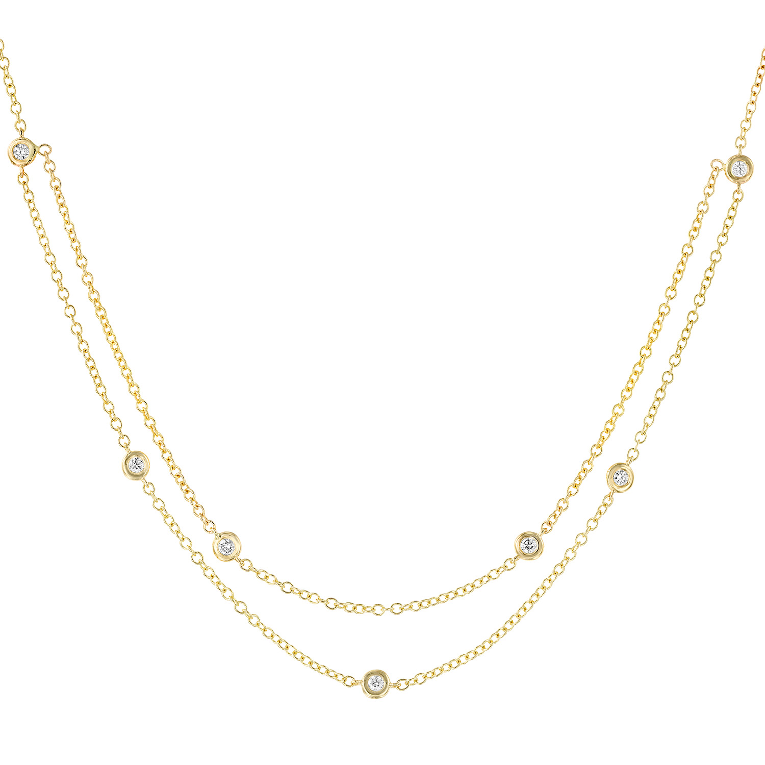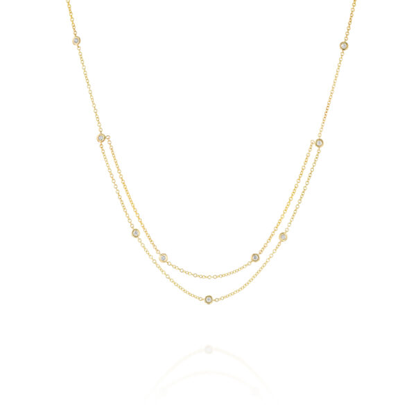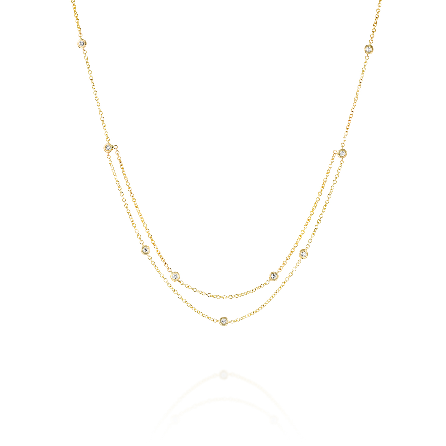 A stylish and delicate diamond necklace set with diamonds throughout the chain in a bezel set pattern. A double diamond necklace that sits perfectly on the neck and gives a stylish and sparkly look. It can be combined with another necklace on the neckline. Set with 9 diamonds weighing 0.27 carats total.