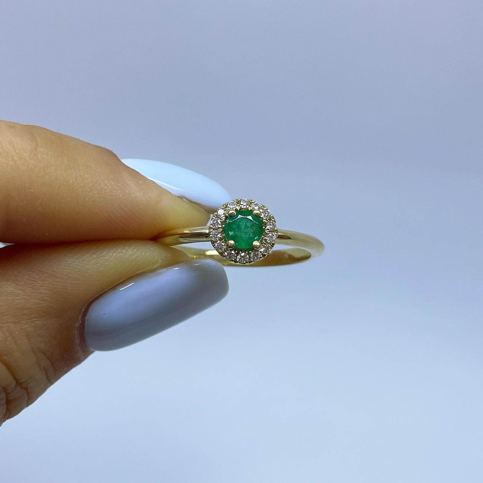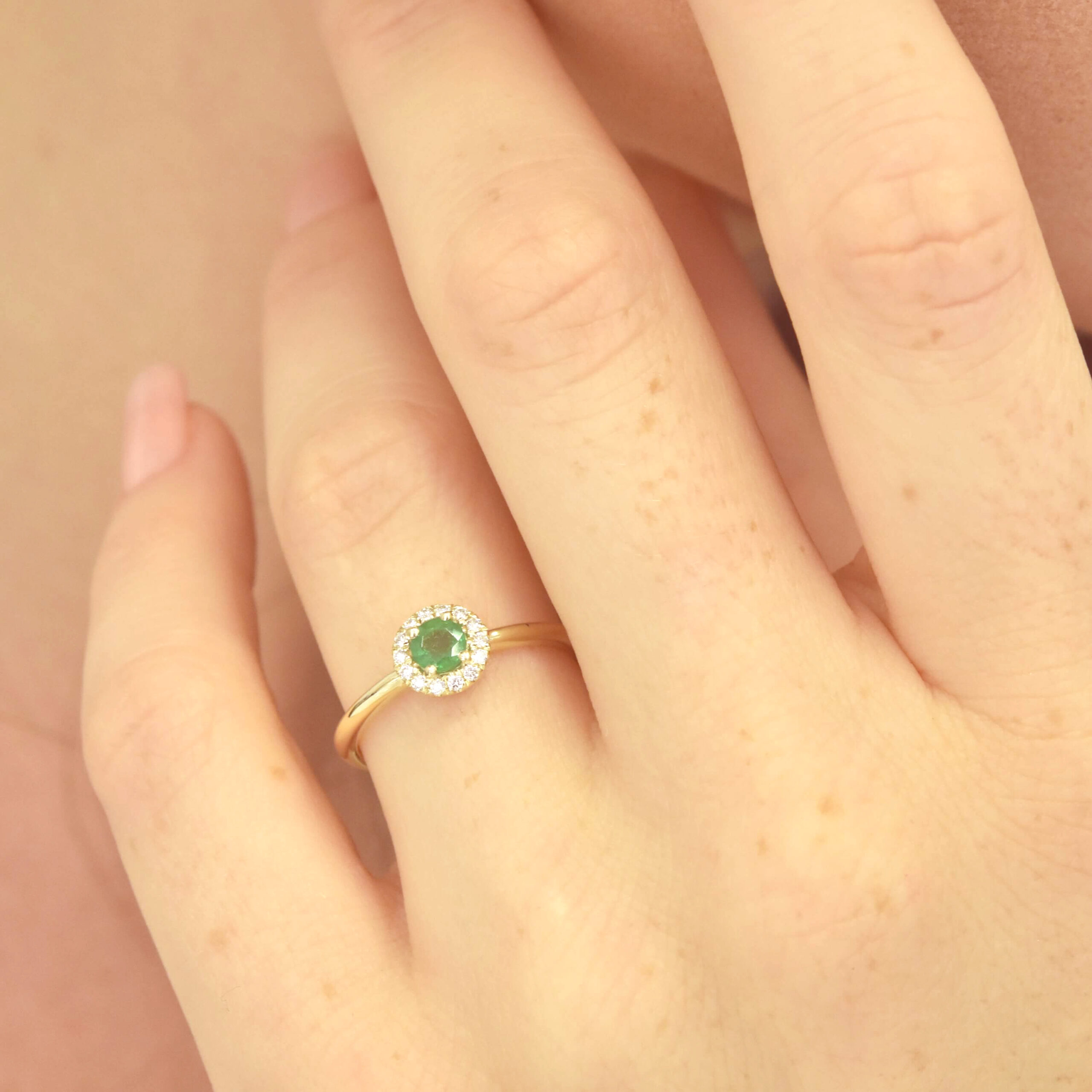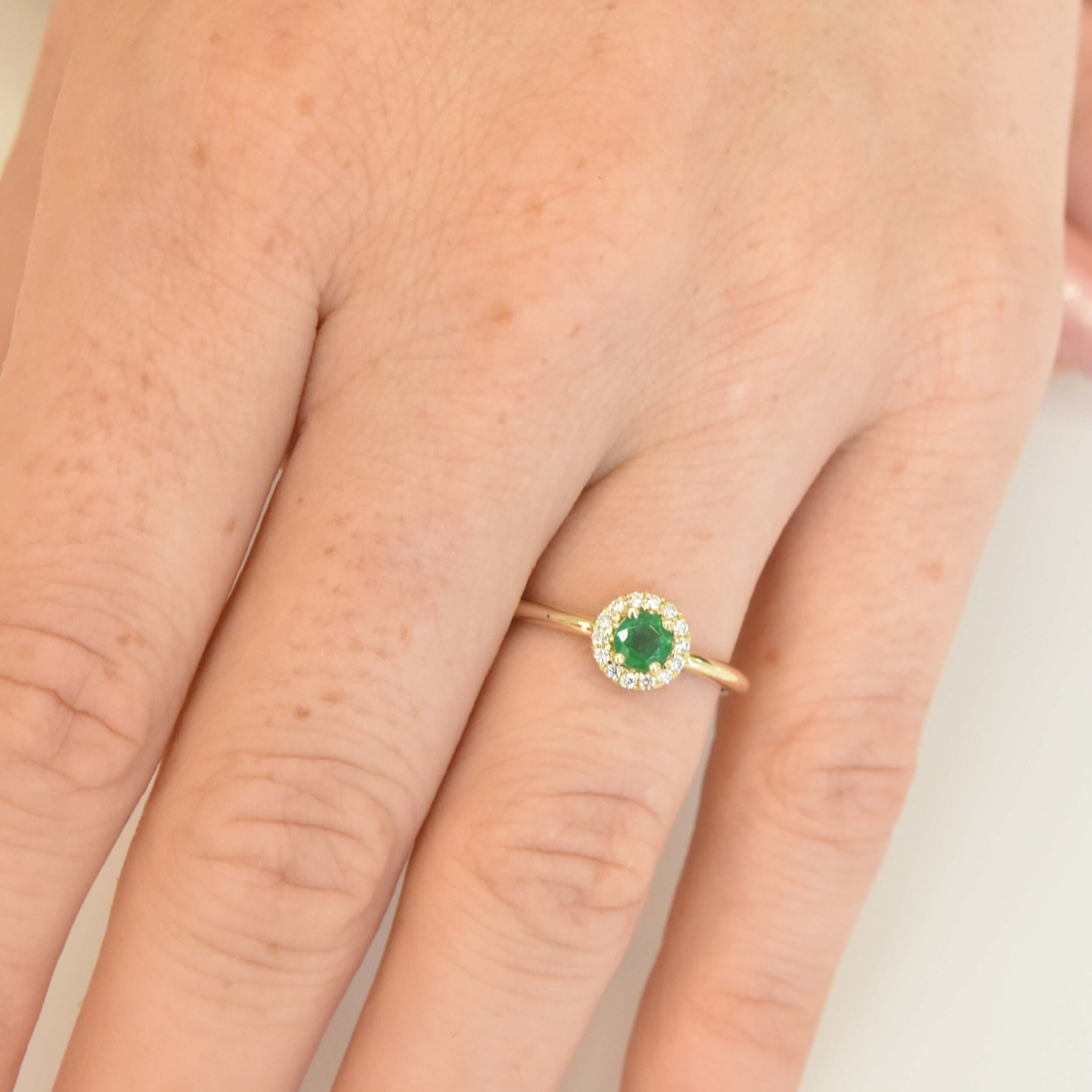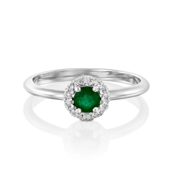An elegant and fashionable diamond halo ring set with 0.25ct glittering green emerald in the center and 14 sparkling diamonds around weighing 0.09 carats. A diamond and gemstone ring that serves as a colorful and graceful addition to the fingers and is suitable for everyday and special occasions.