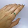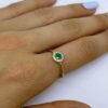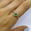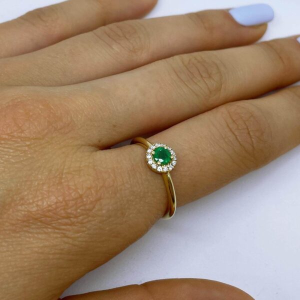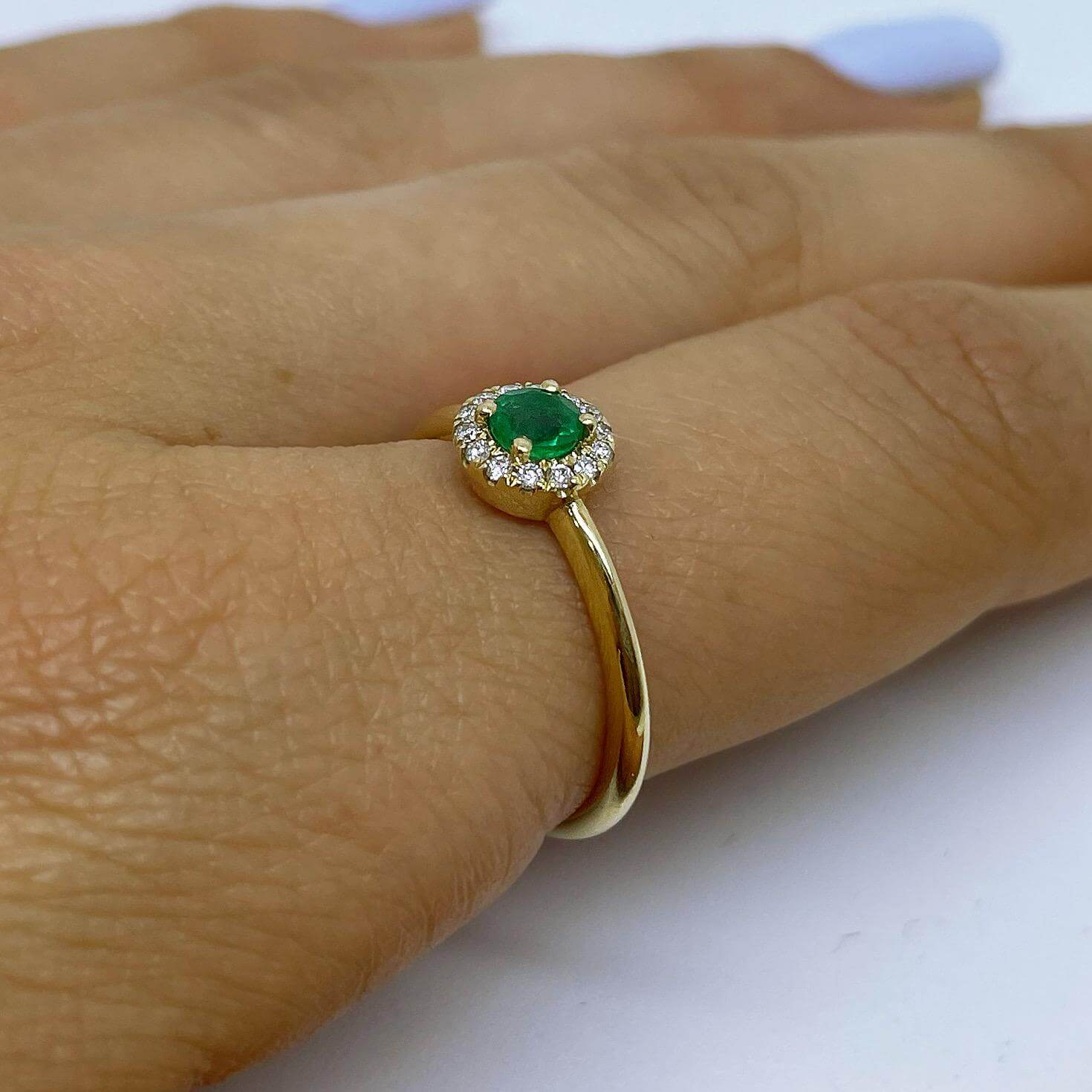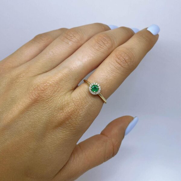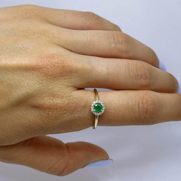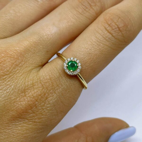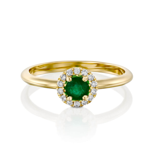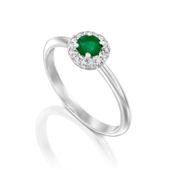 An elegant and fashionable diamond halo ring set with 0.25ct glittering green emerald in the center and 14 sparkling diamonds around weighing 0.09 carats. A diamond and gemstone ring that serves as a colorful and graceful addition to the fingers and is suitable for everyday and special occasions.