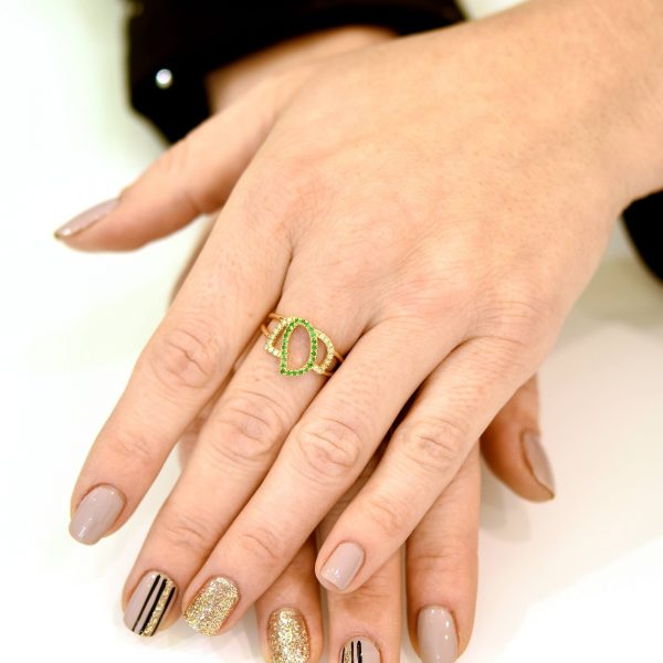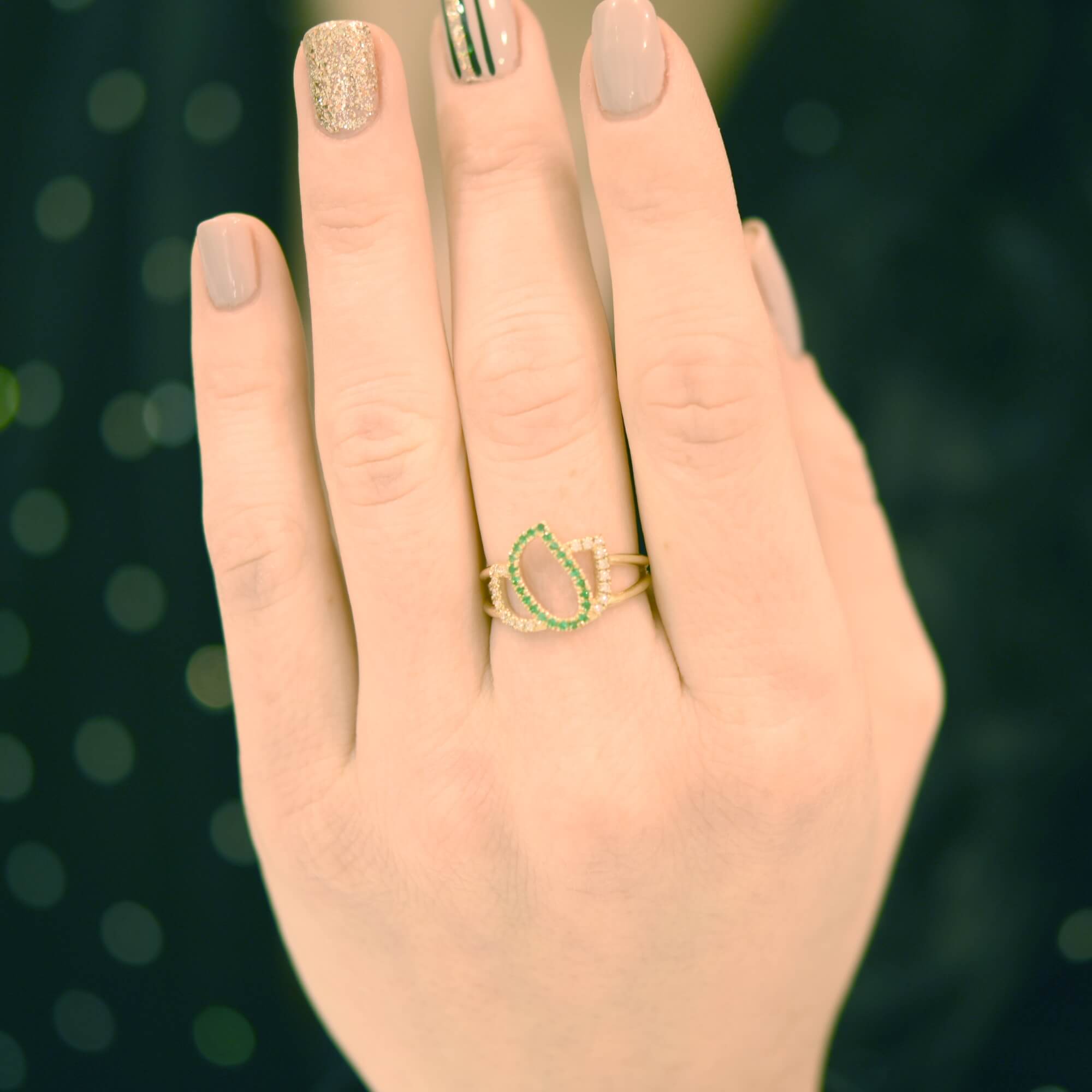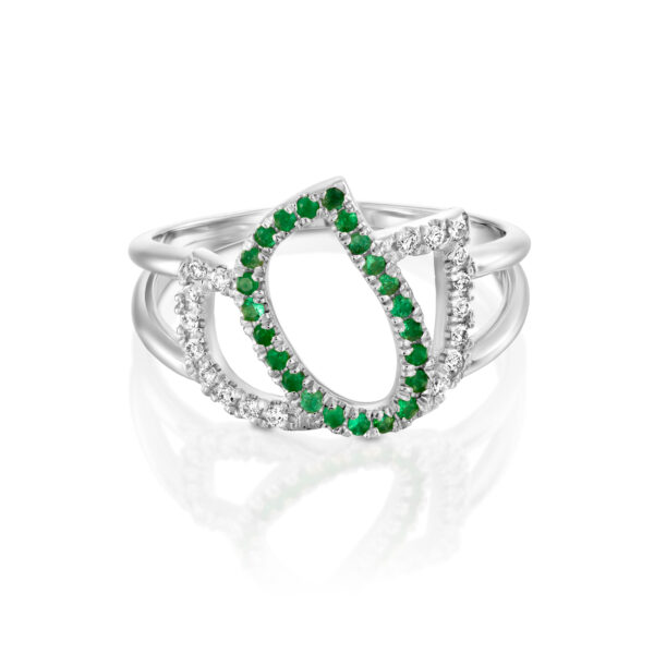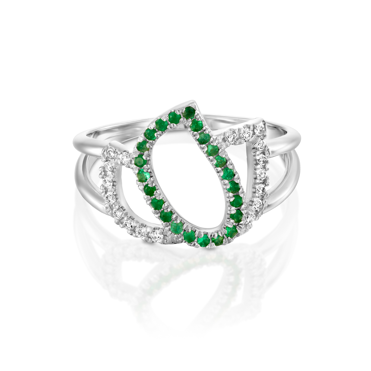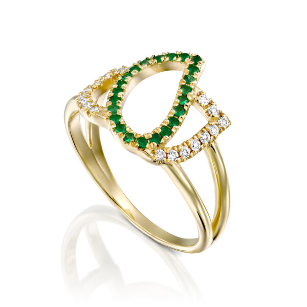 Diamond and emerald ring in the shape of leaves. This unique ring made of 3 leaves design features pave set dazzling natural diamonds and emeralds.