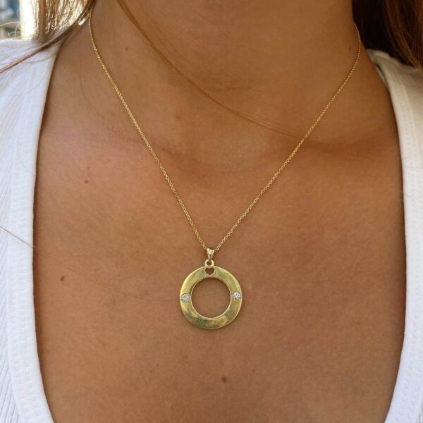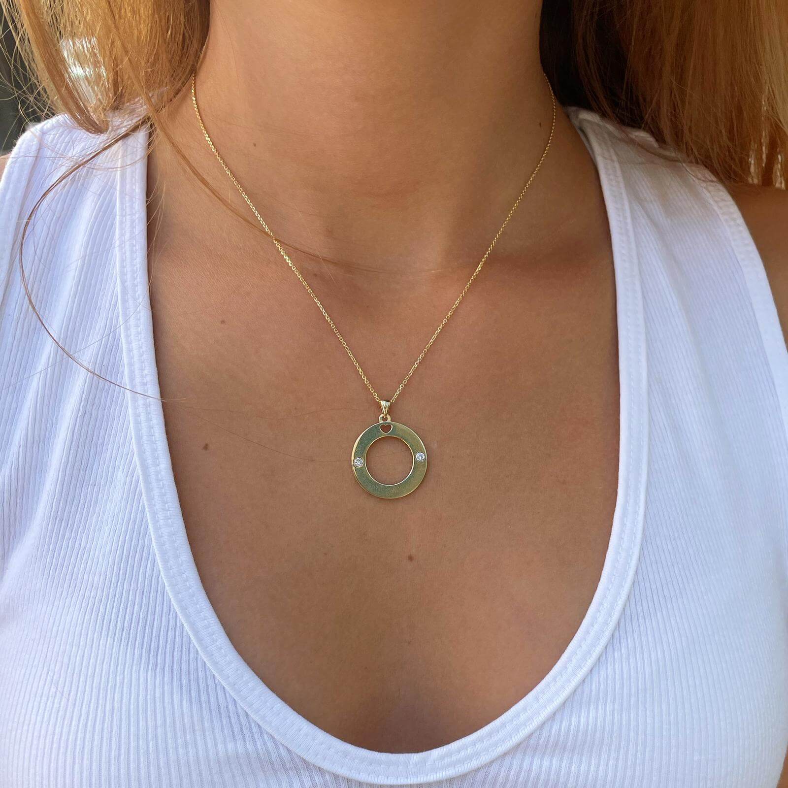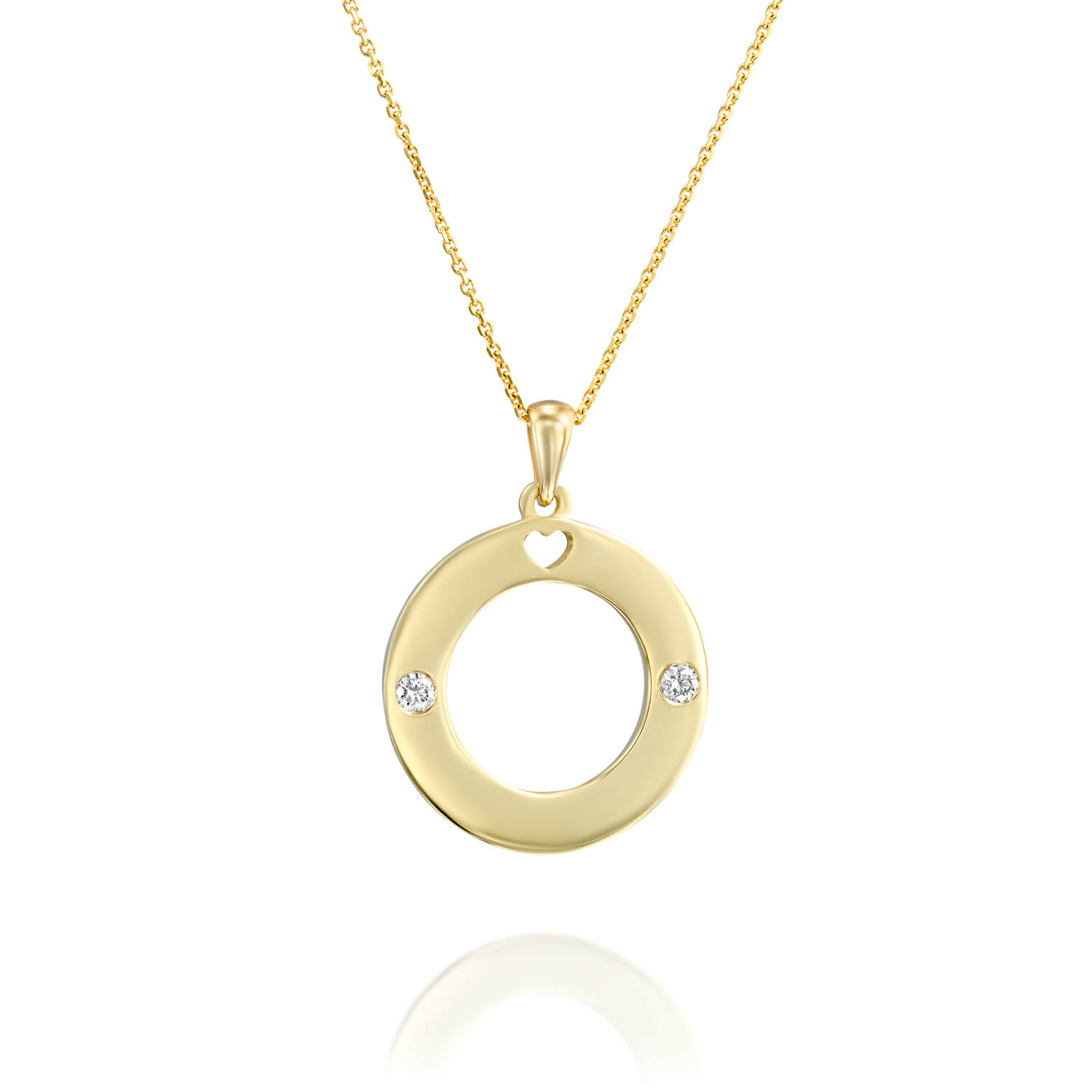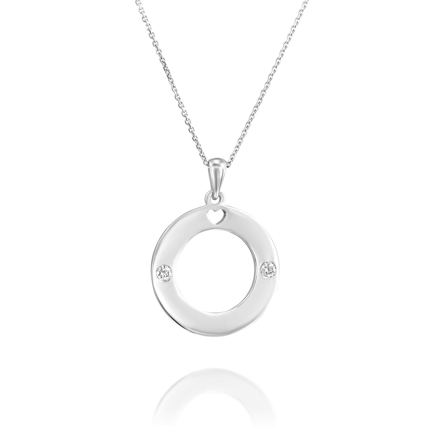 Impressive circle diamond pendant set with 2 inlaid diamonds weighing 0.14 carat. An engraved diamond pendant, making it a personal gift that will be close to the heart.