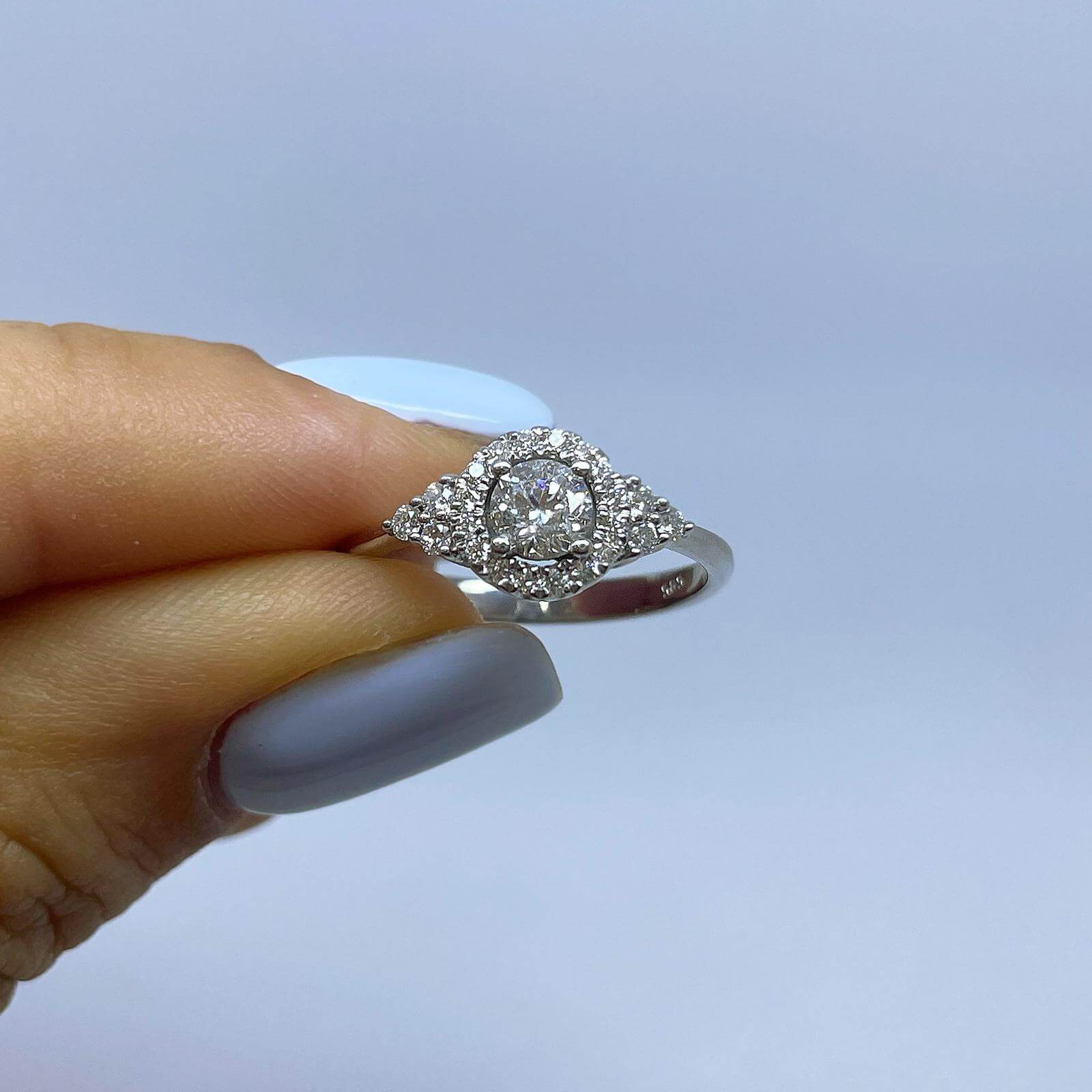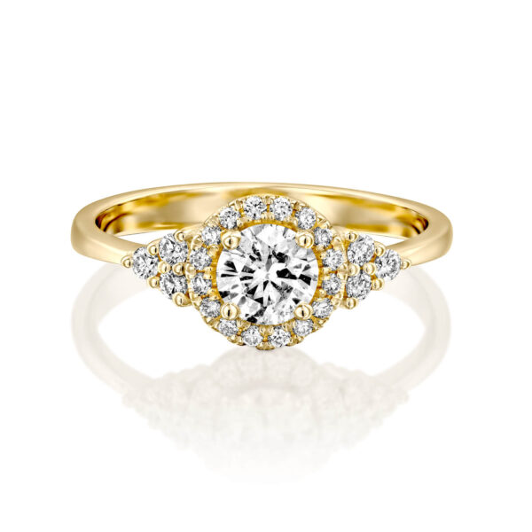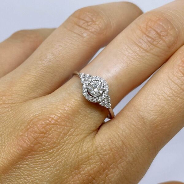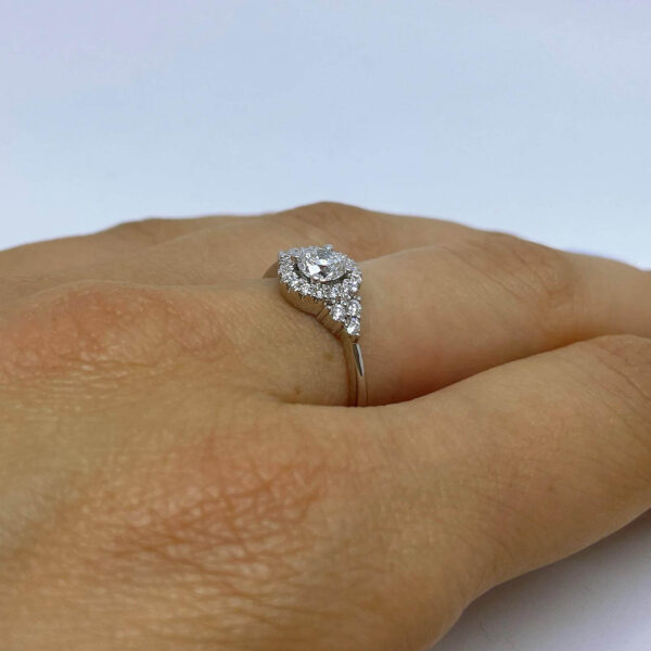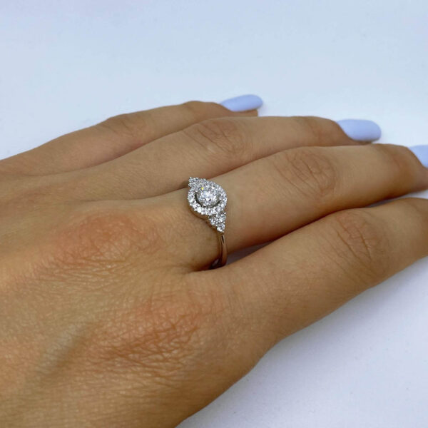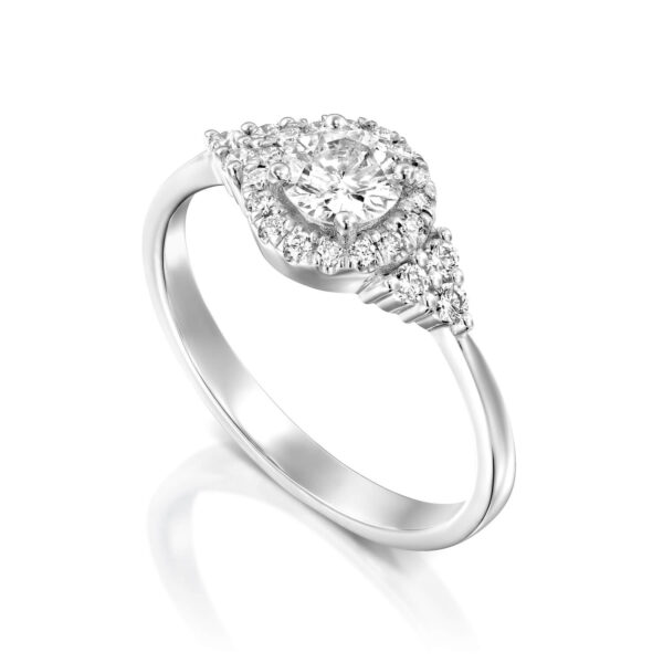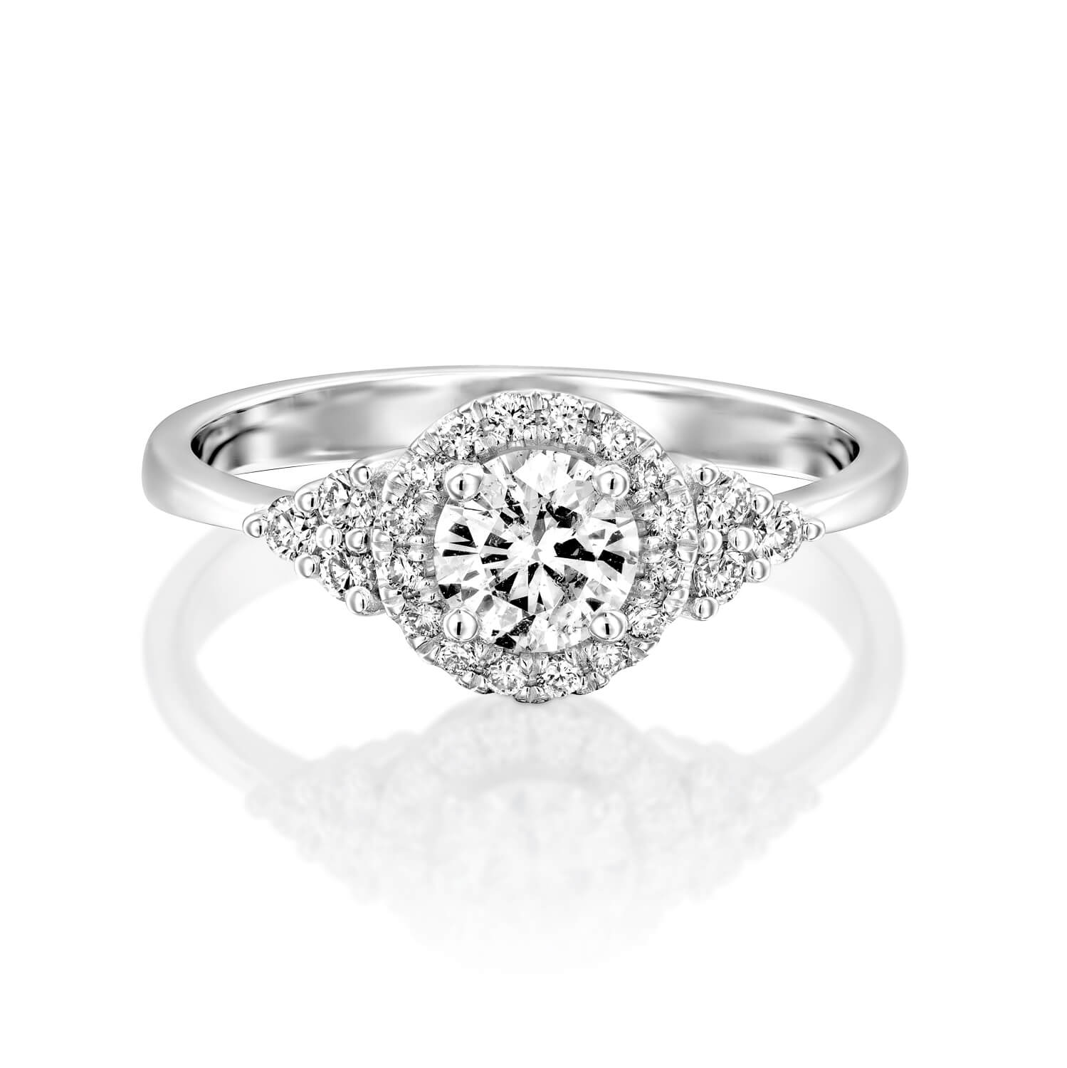 A fashionable and very sparkling engagement ring set with a 0.40ct center diamond and 22 diamonds on the side. This diamond engagement ring has a halo of diamonds around the center diamond that enhances its presence and prestige appearance.