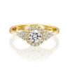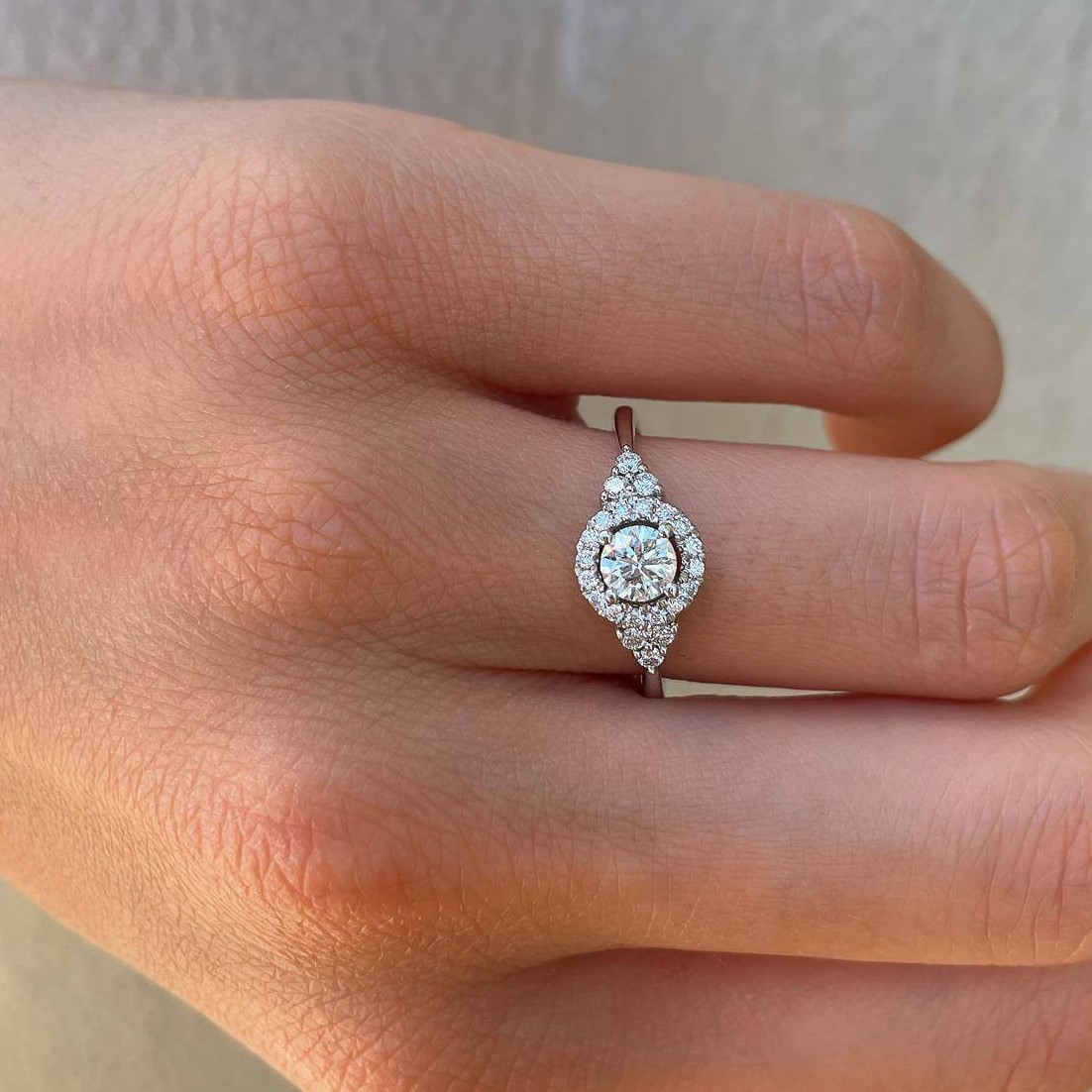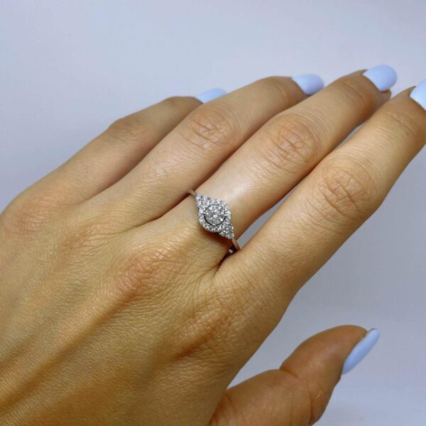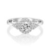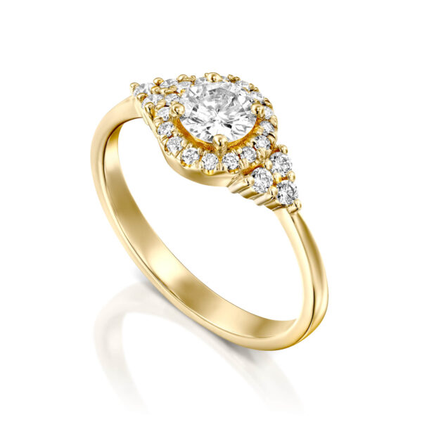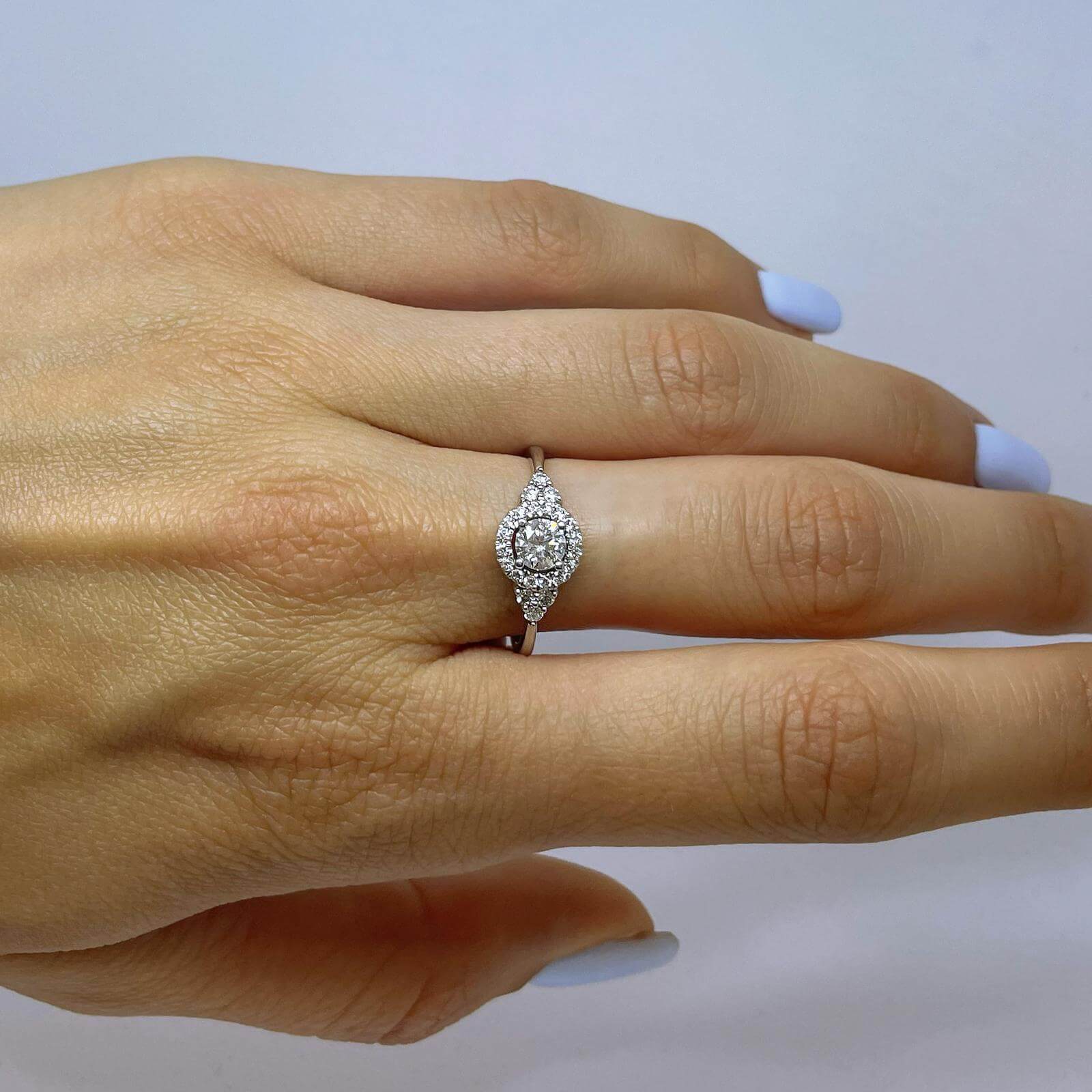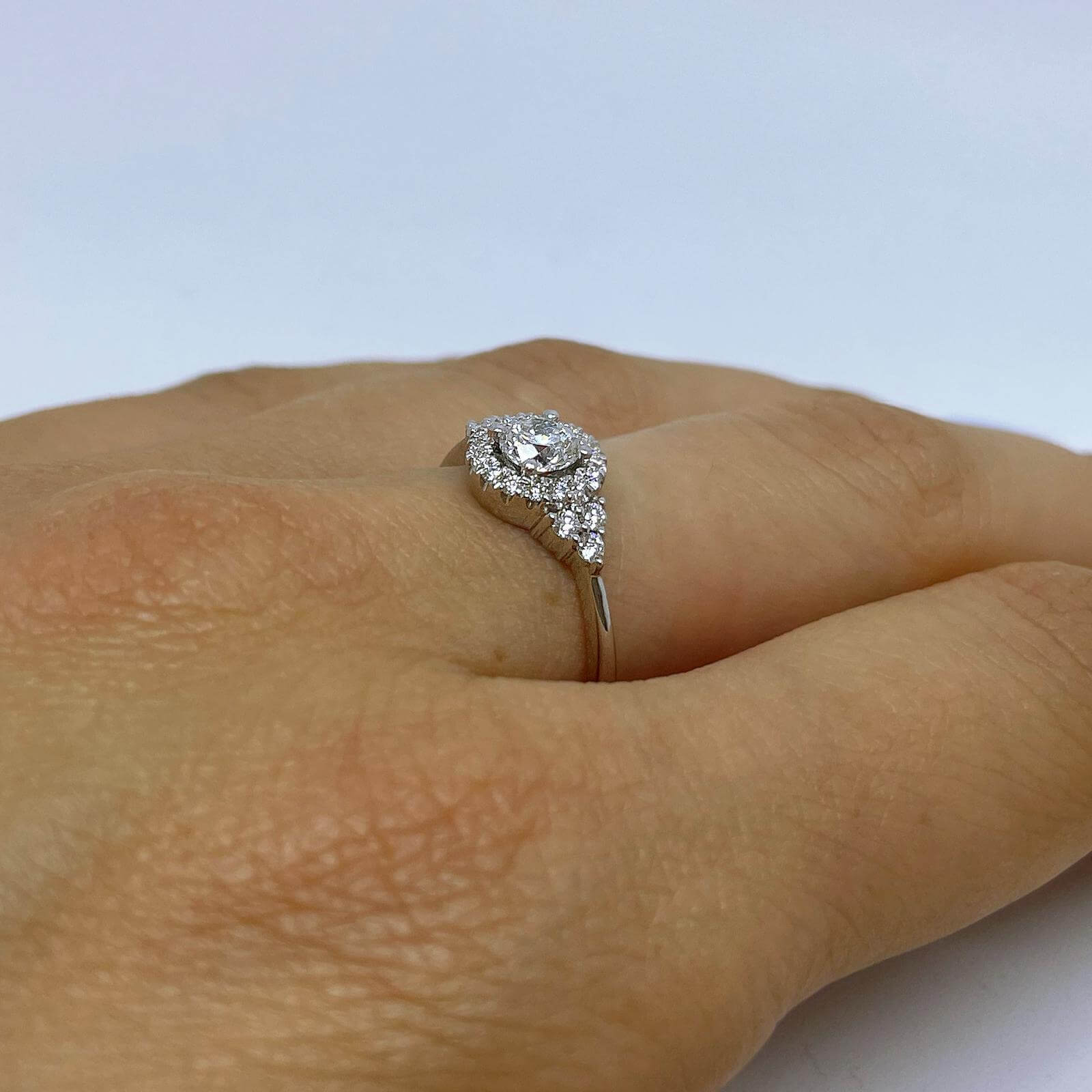 A fashionable and very sparkling engagement ring set with a 0.40ct center diamond and 22 diamonds on the side. This diamond engagement ring has a halo of diamonds around the center diamond that enhances its presence and prestige appearance.