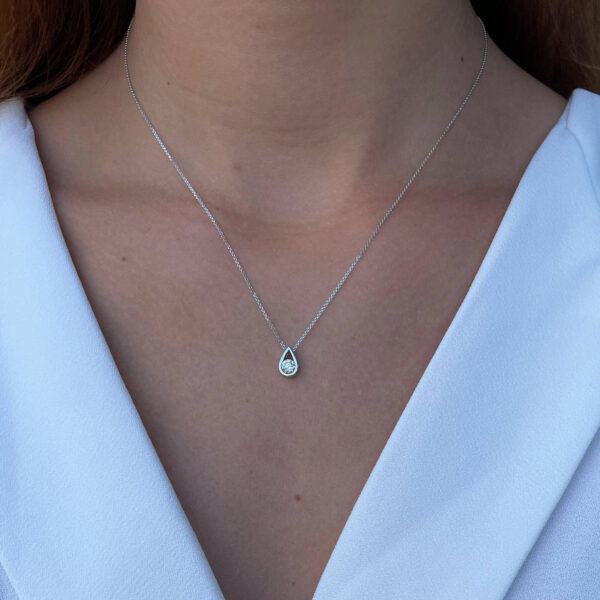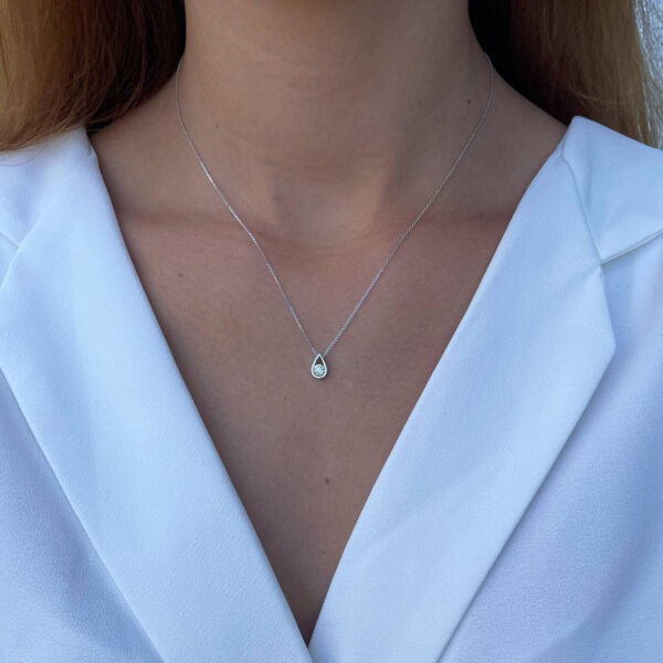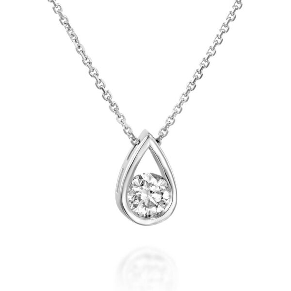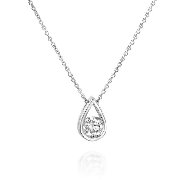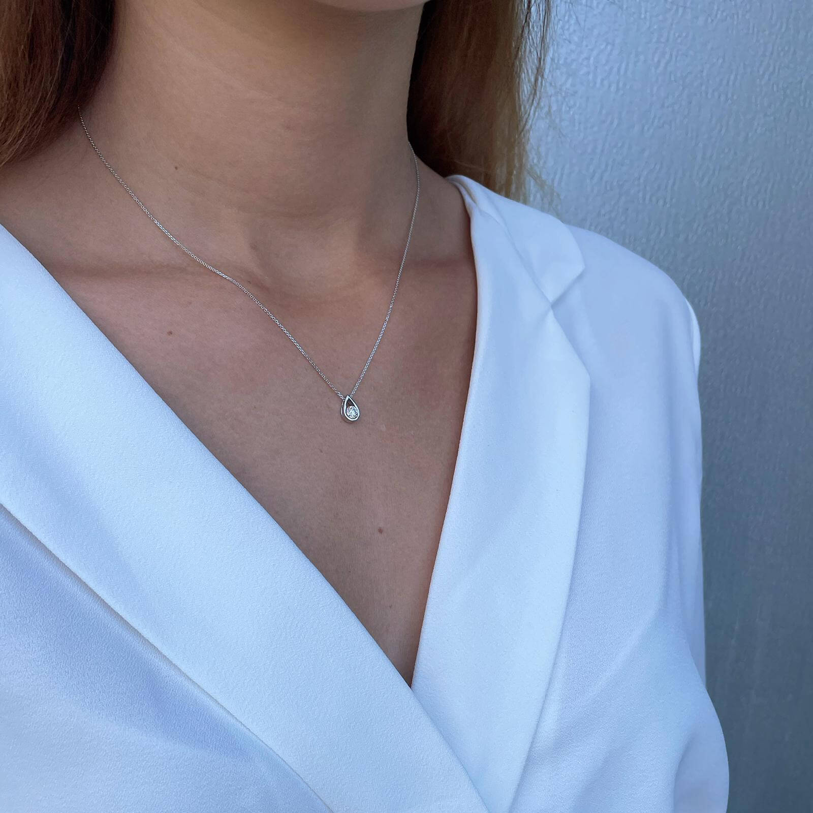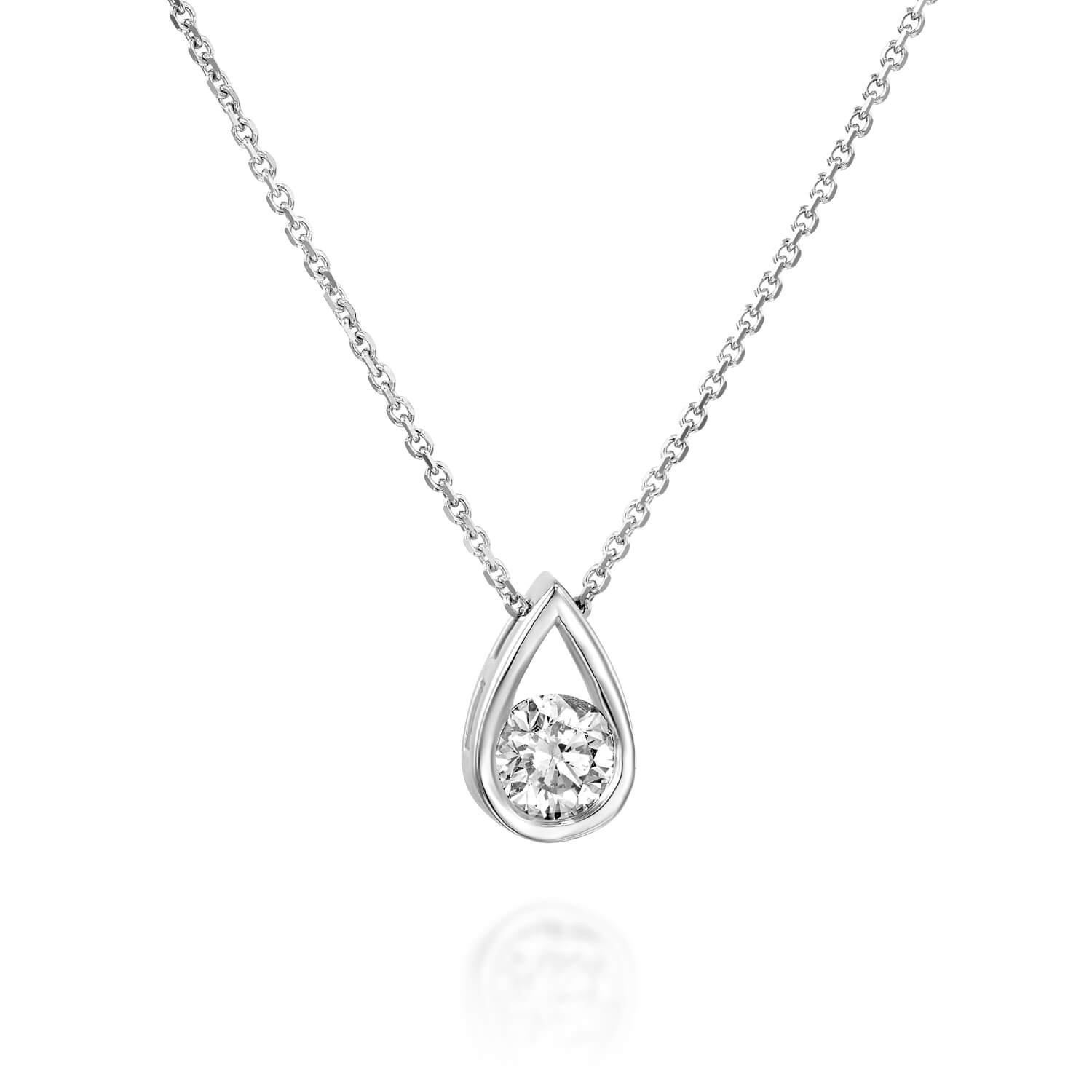 A delicate, youthful diamond necklace in a drop design set 0.25ct sparkling diamond. The chain goes through the pendant and gives it the freedom to move. The pendant adorns the neckline elegantly and magically.