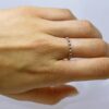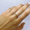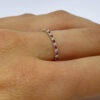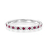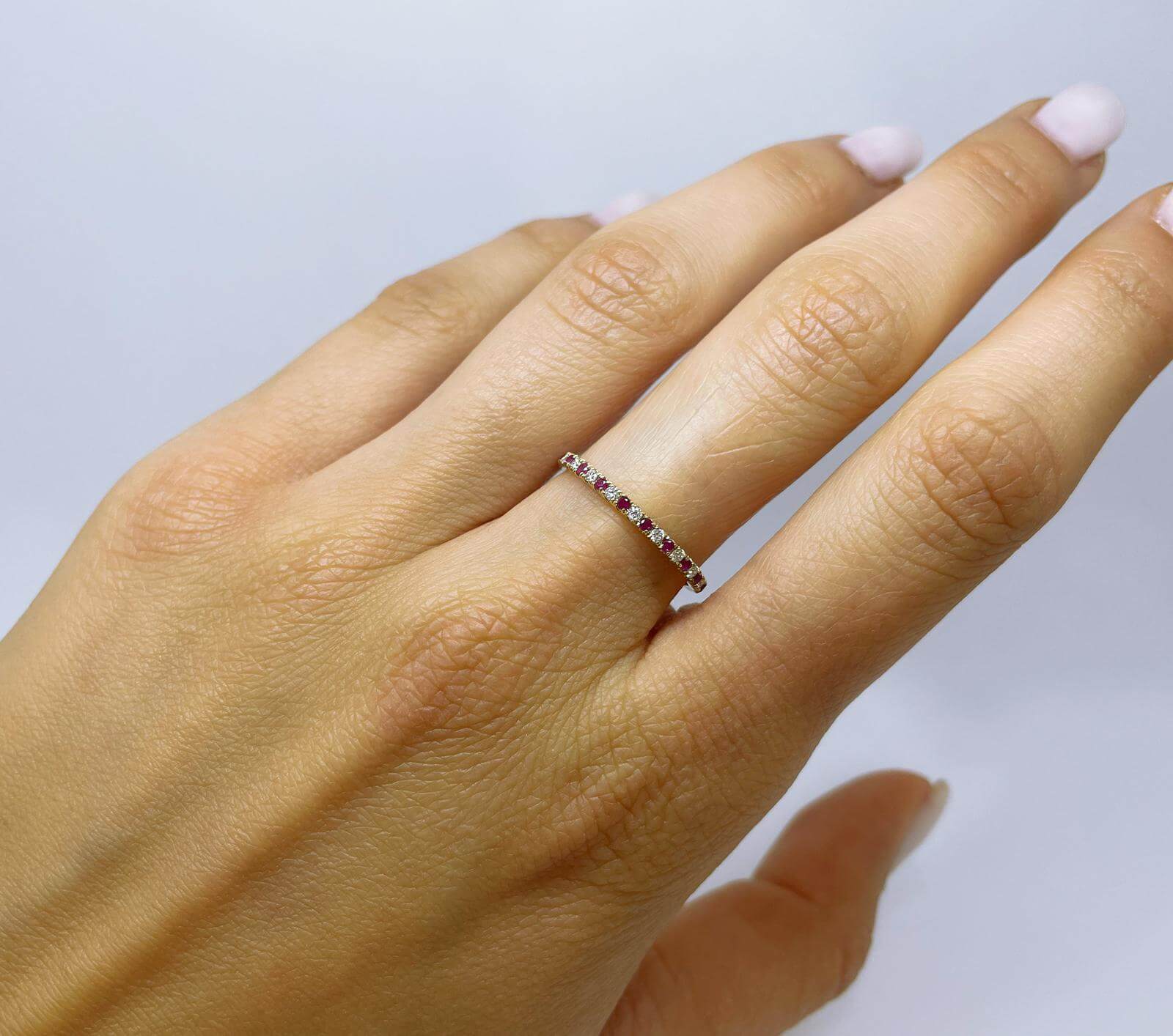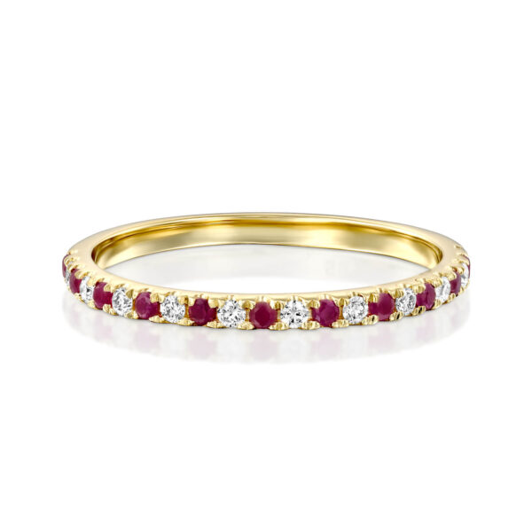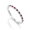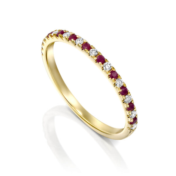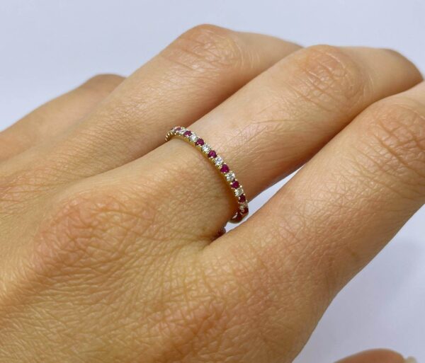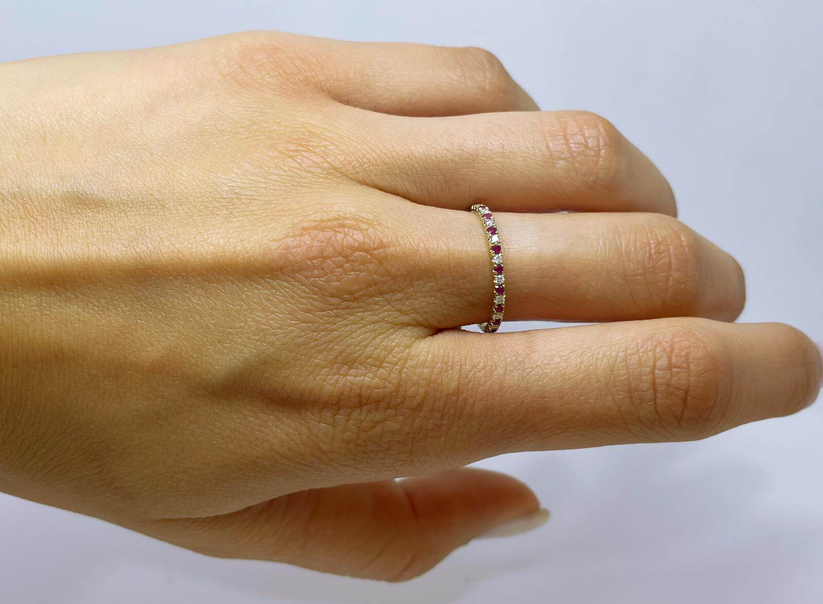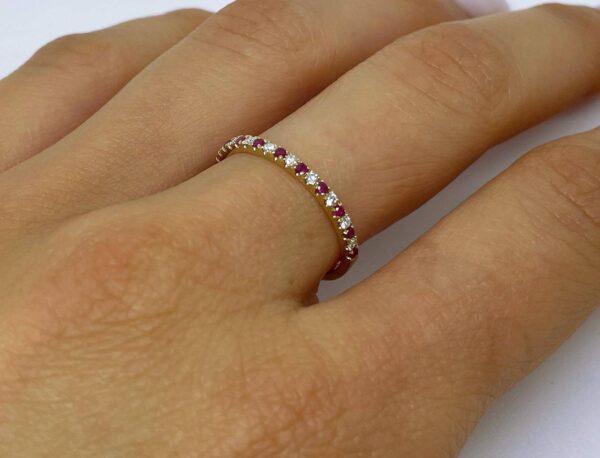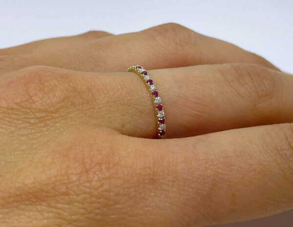Delicate and stylish half eternity ring set with white sparkling diamonds weighing 0.11ct and beautiful red ruby weighing 0.11ct. Classic and colorful half eternity wedding ring/