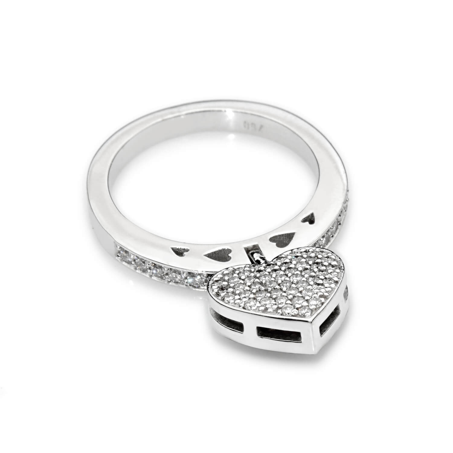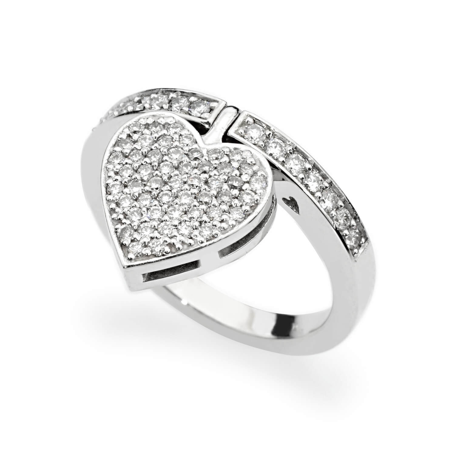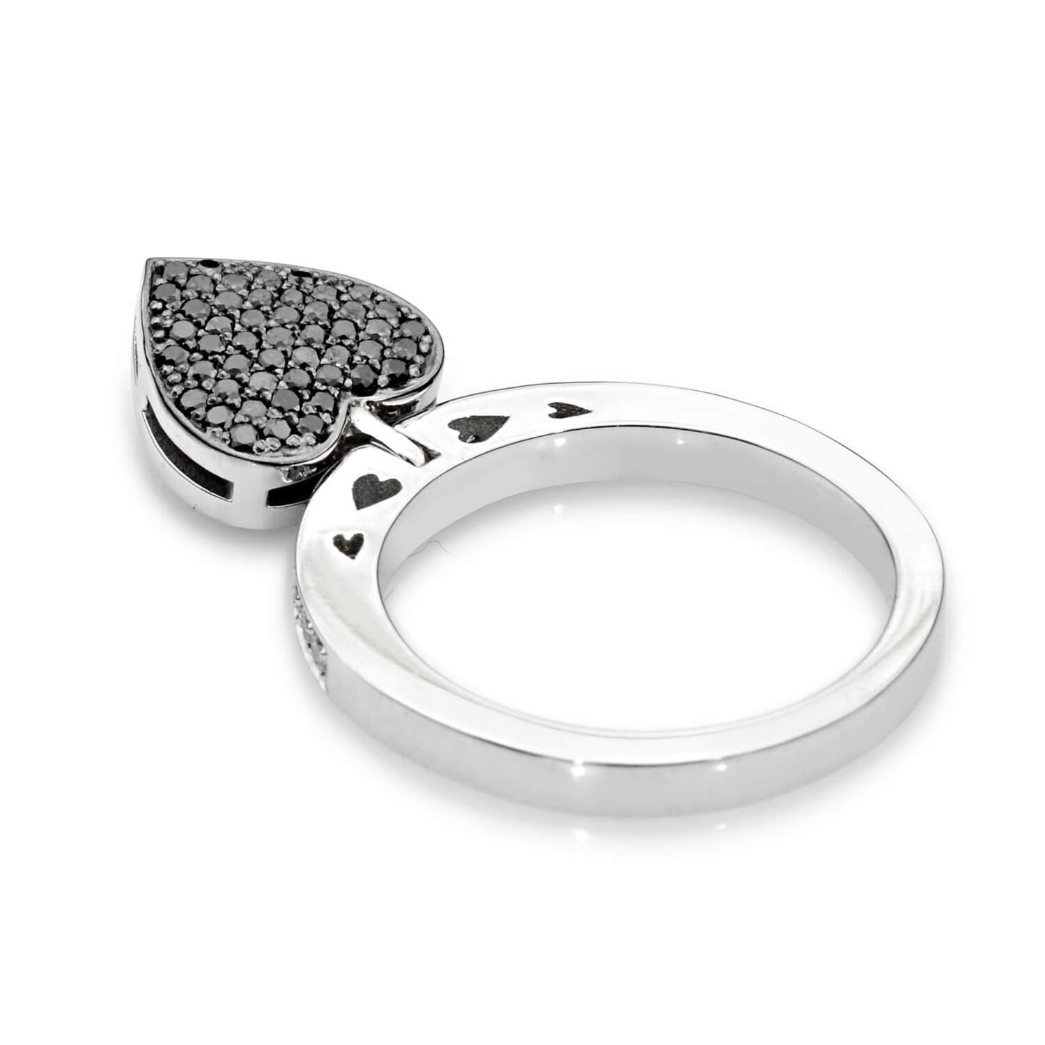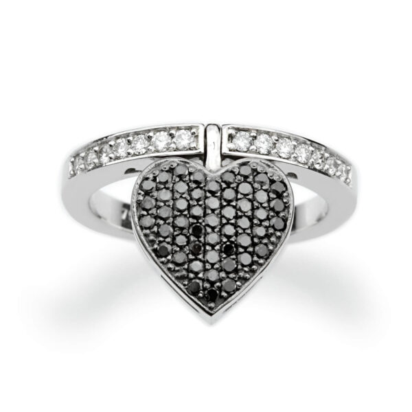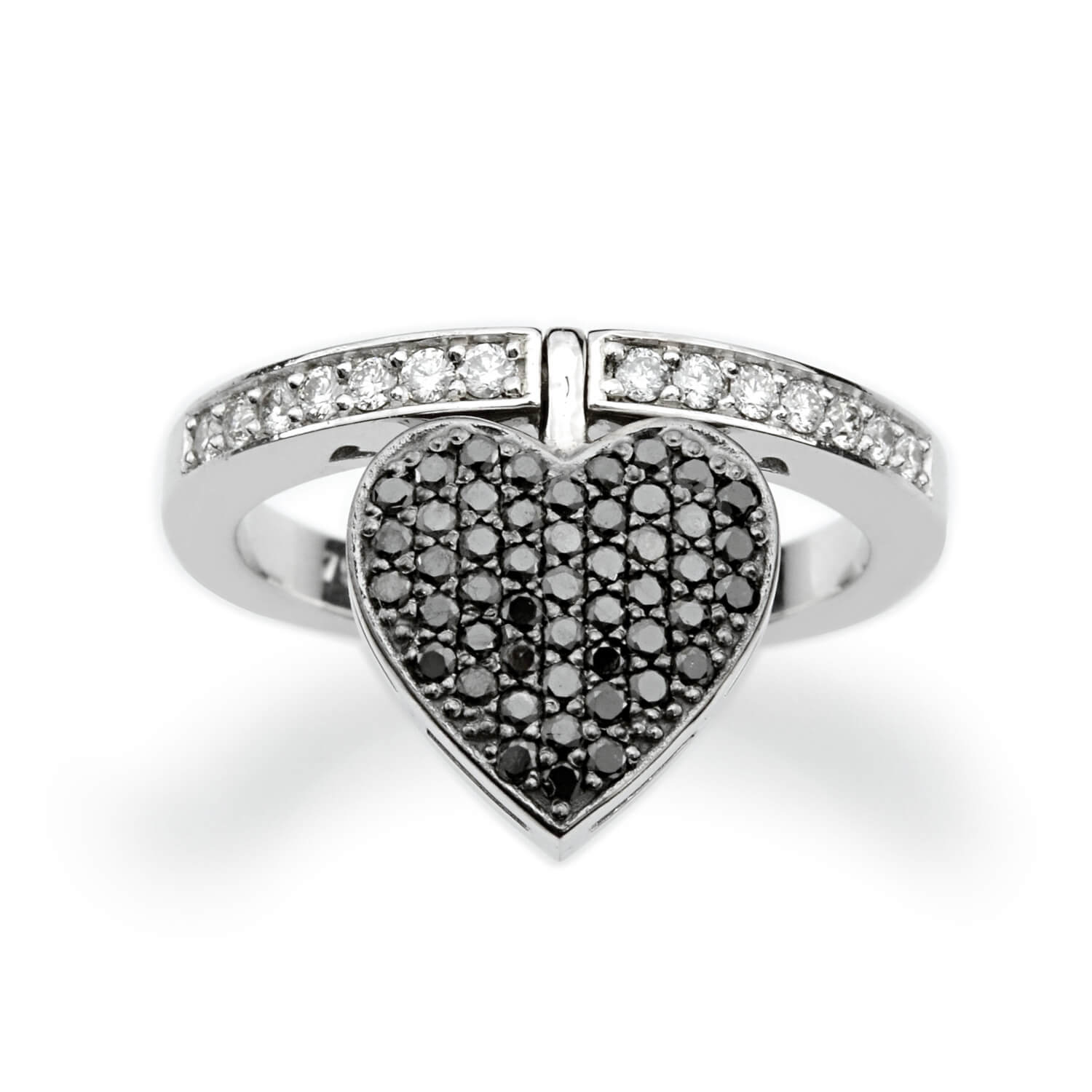 A very special and impressive diamond ring features 113 sparkling diamonds weighing 0.84 carats. This diamond ring has a different look, made of two parts, with one part shaped like a sparkling heart with white diamonds on one and on the other side black diamonds for you to decide.