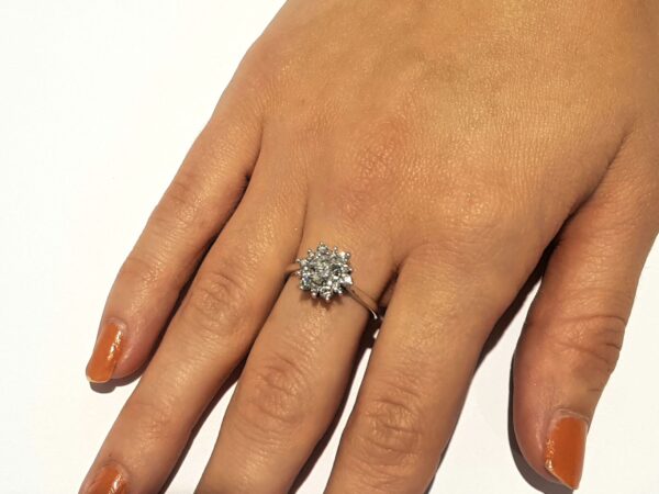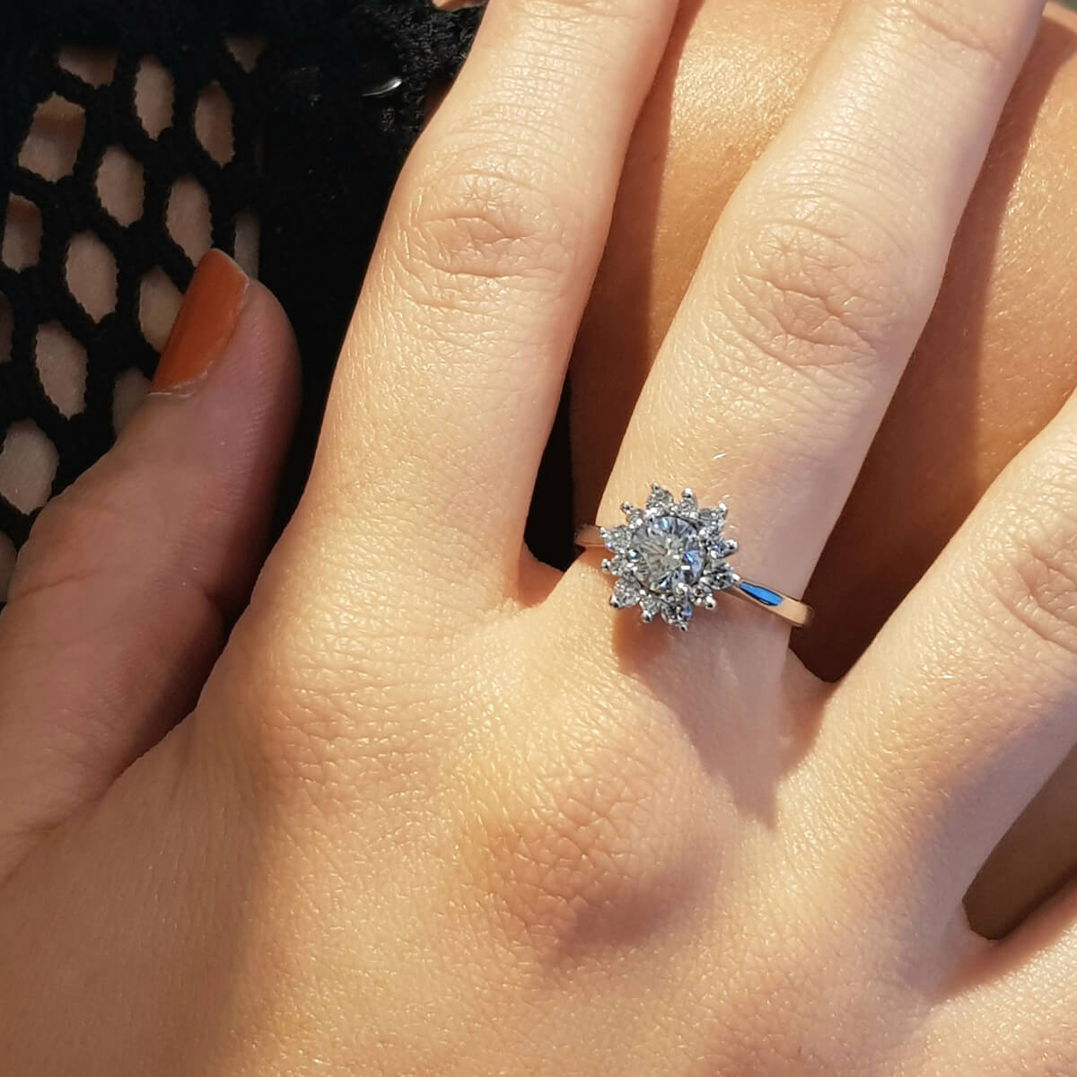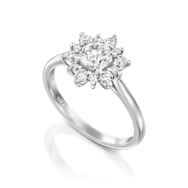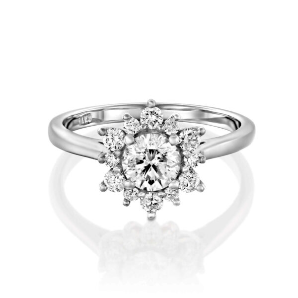 A prestigious and attractive engagement ring features a 0.60ct center diamond and an additional 12 diamonds on the sides weighing 0.31ct. An engagement ring designed as a sun rises in all its splendor in order to convey prestige and elegance. Total diamonds 0.91 carats.
