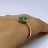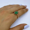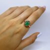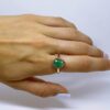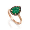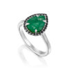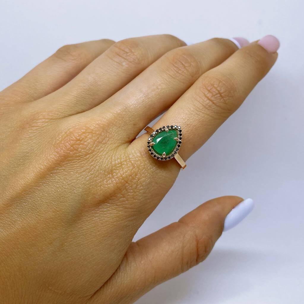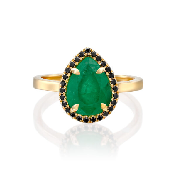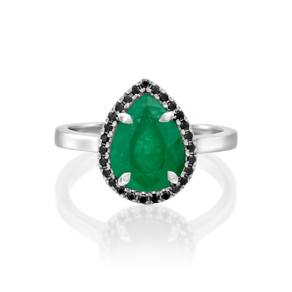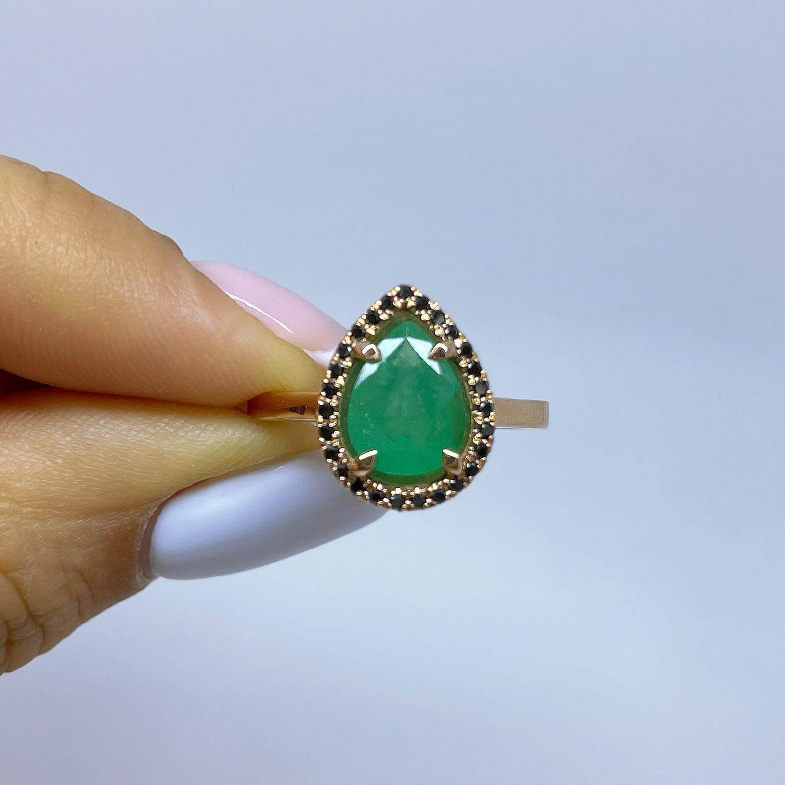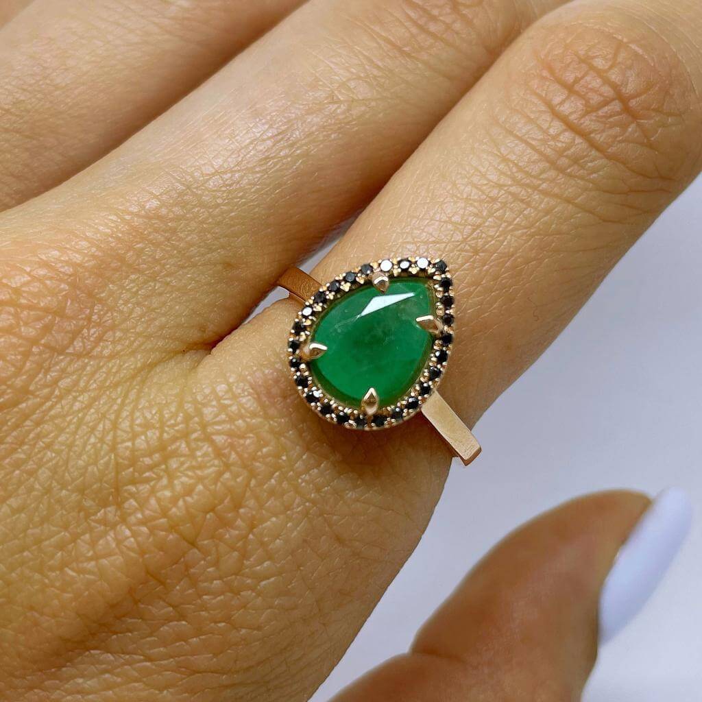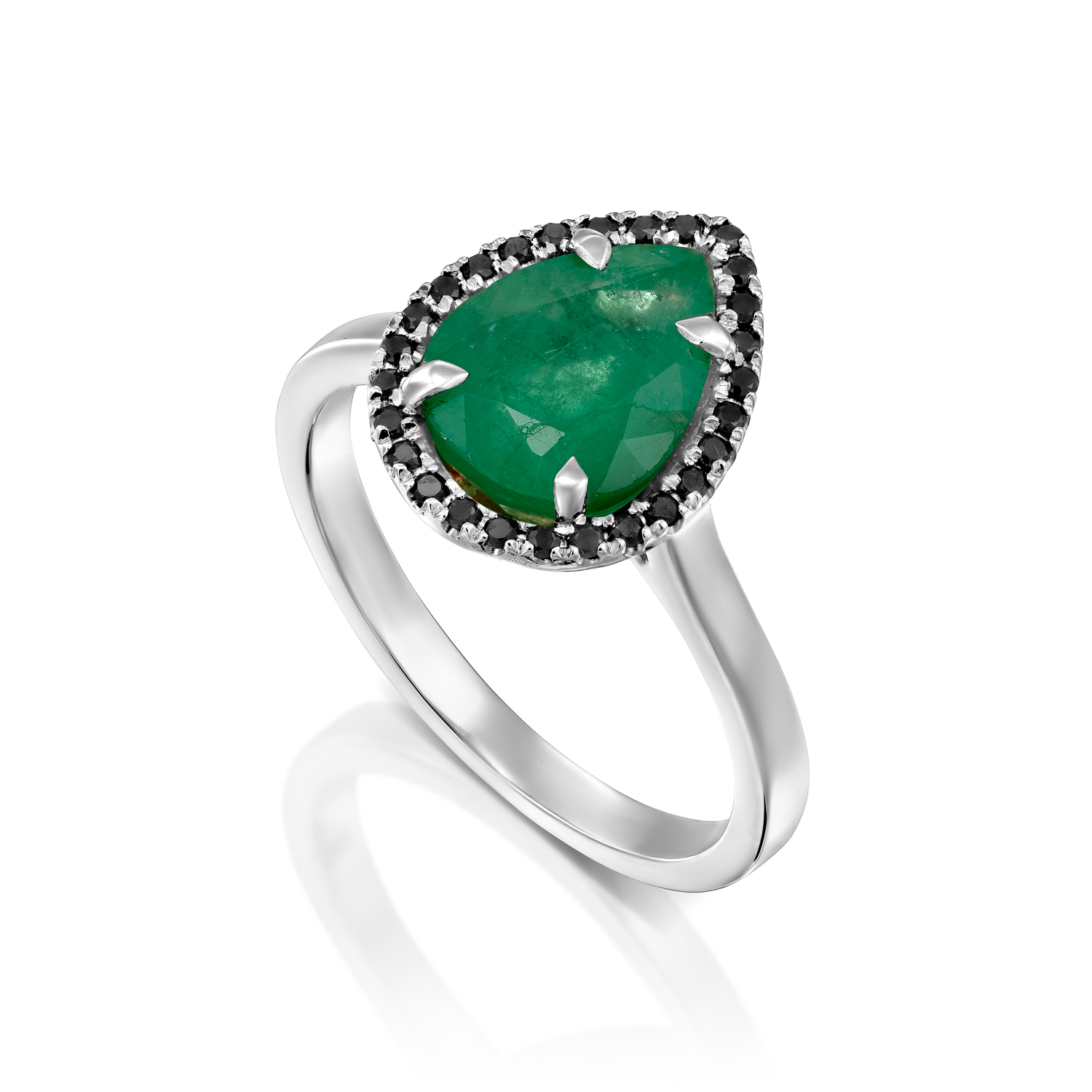 A designed and luxurious ring set with a green emerald gemstone in the shape of a drop in the center weighing 2 carats and black diamonds around weighing 0.13 carats in total. A special ring with a presence that can not be ignored. Emerald gemstone jewelry for those who want a luxurious and colorful ring.