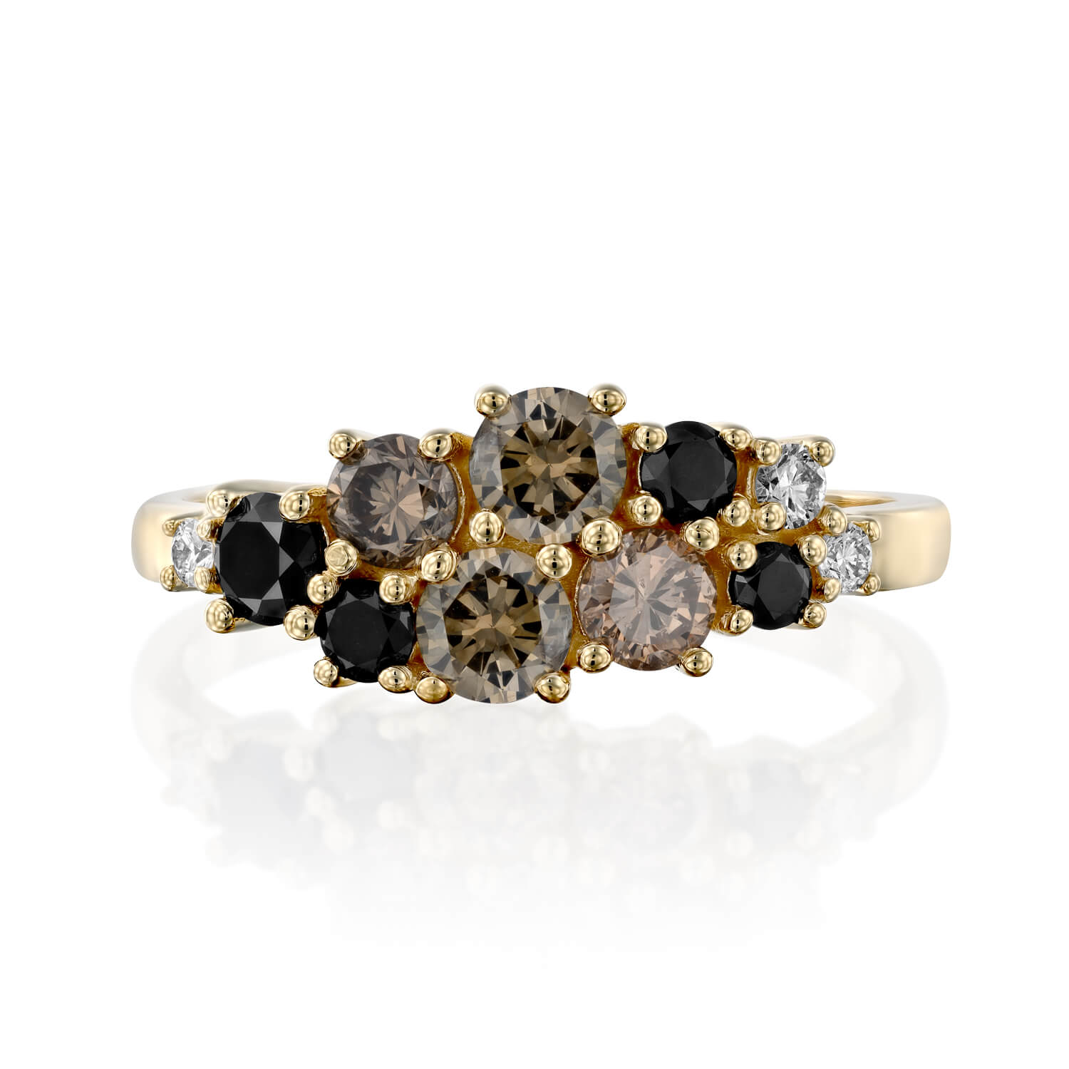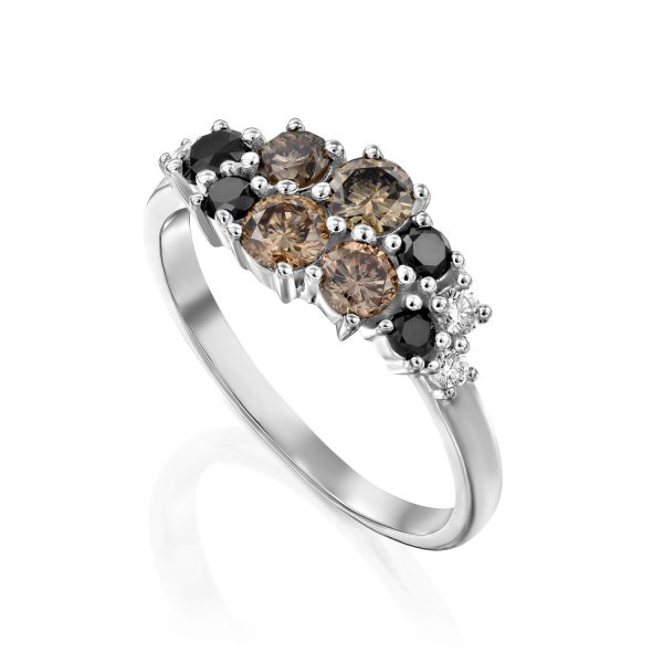 A fashionable and special multi-colored diamond ring set with large brown diamonds totaling 0.60 carats, medium black diamonds totaling 0.29 carats, and small white diamonds totaling 0.07 carats. A special diamond ring that gives a special and elegant look for everyday and for special occasions.