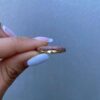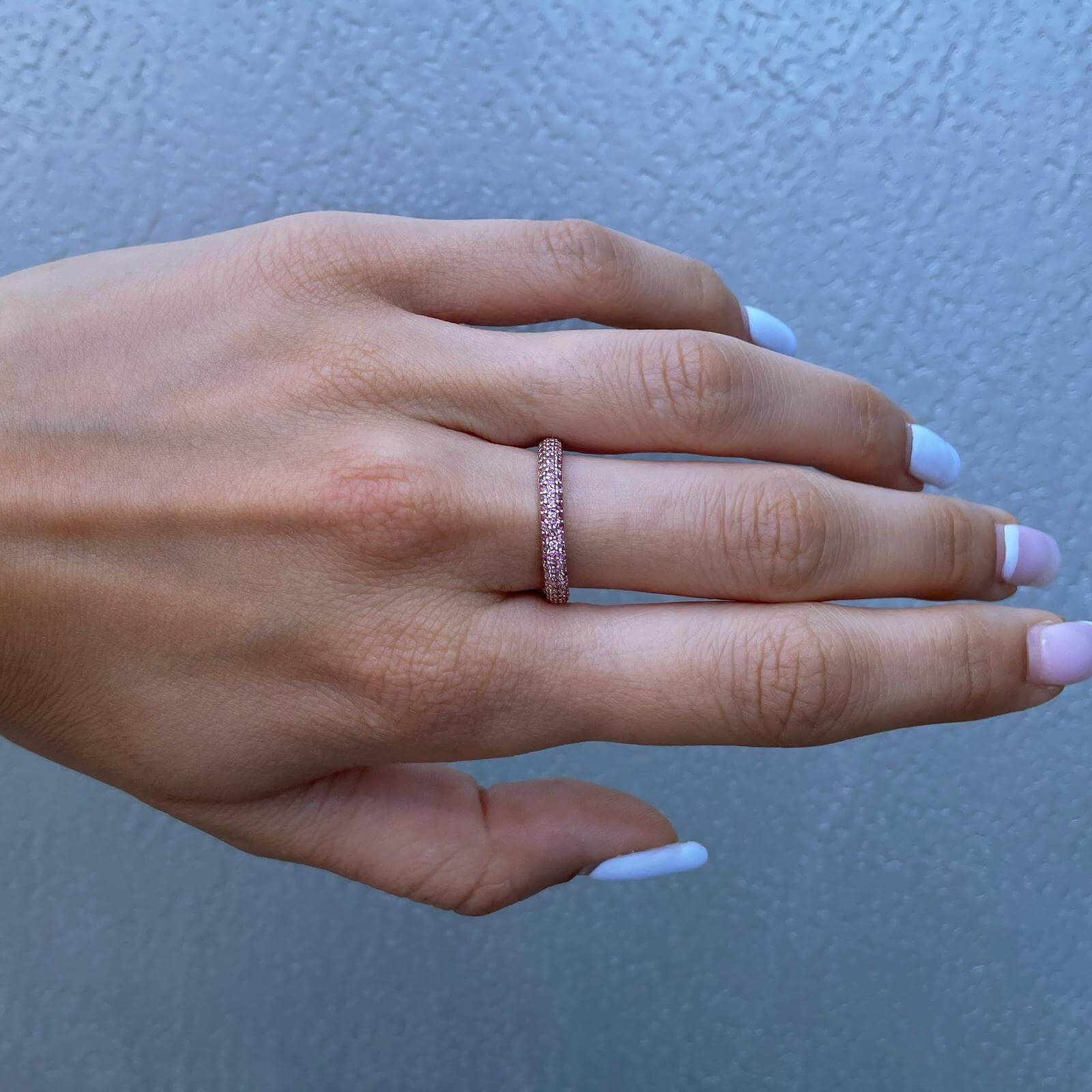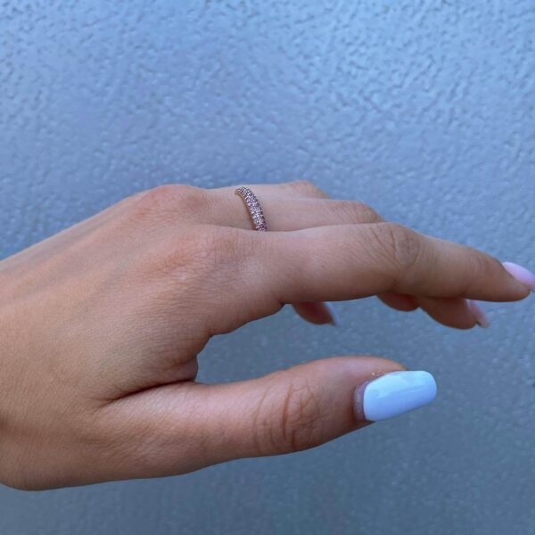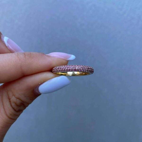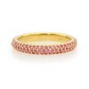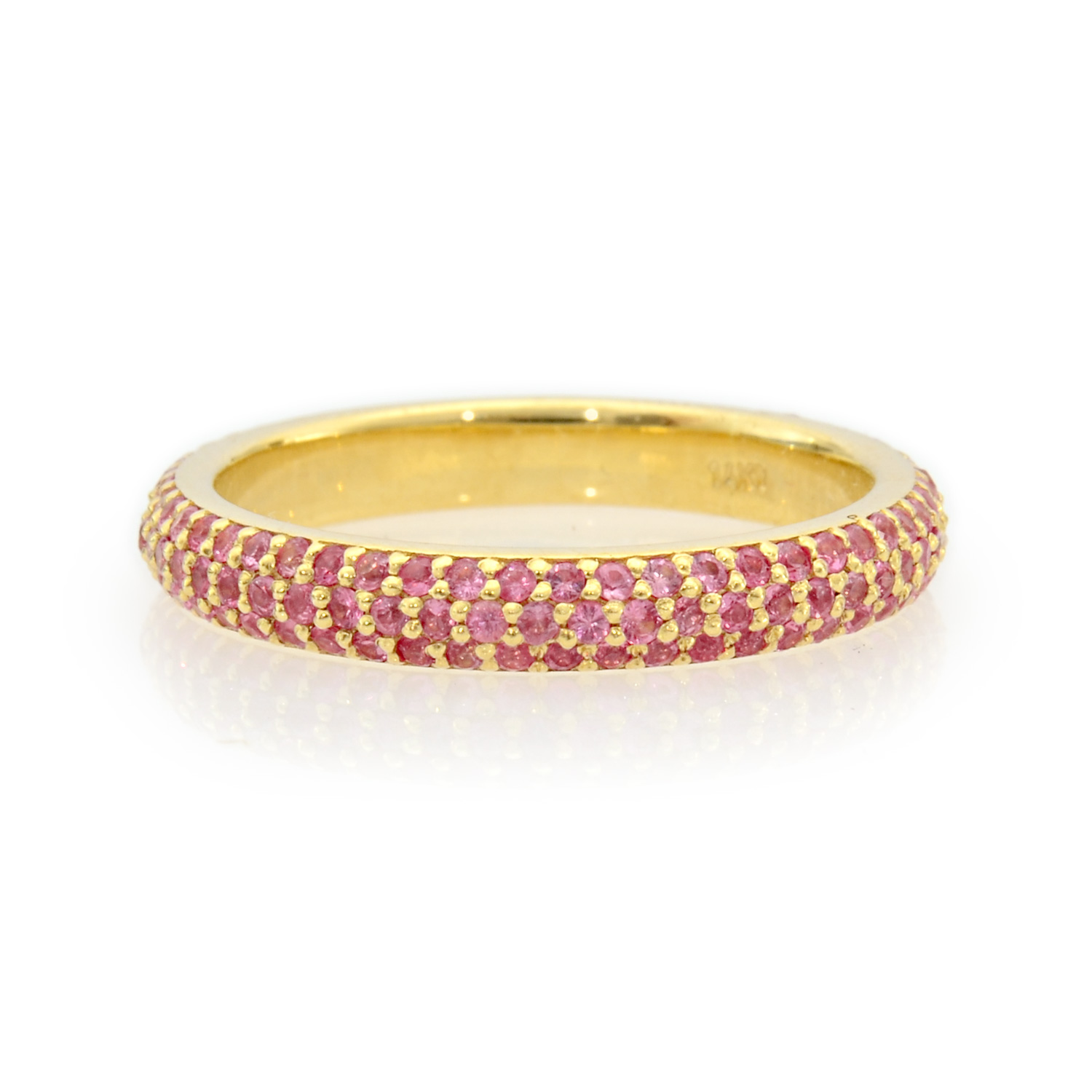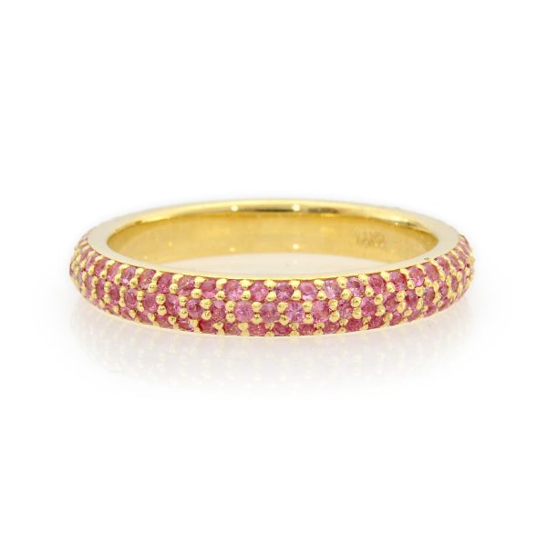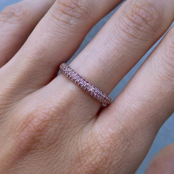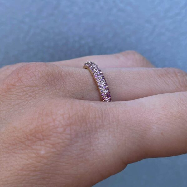 Pink sapphire half eternity ring. Clean and soft design with three rows pavé round sapphire set around more than half of the ring.