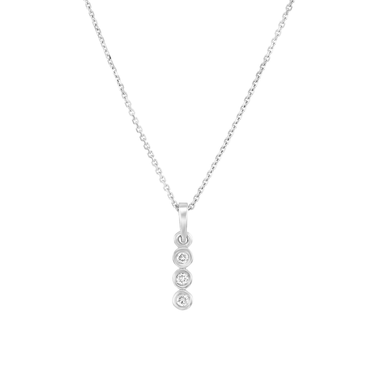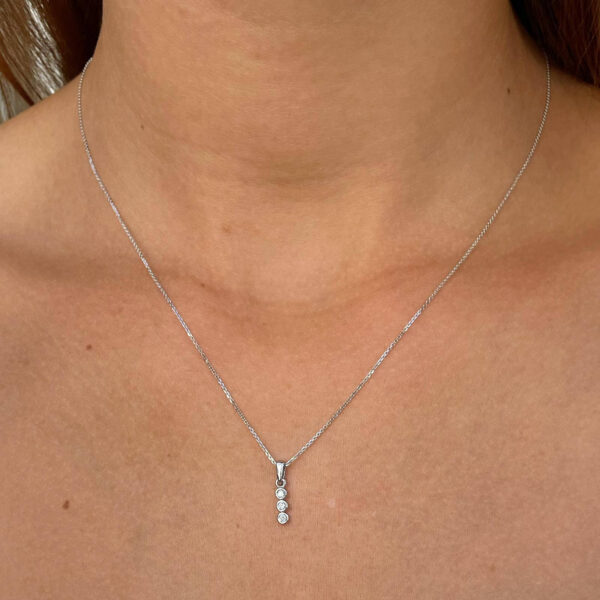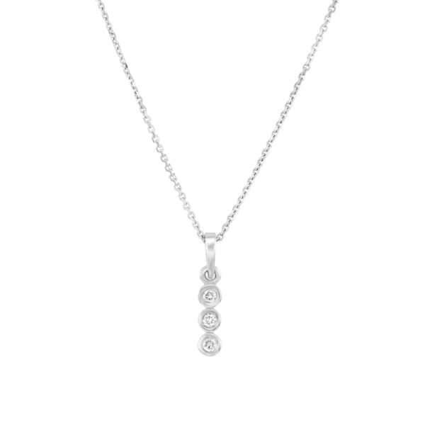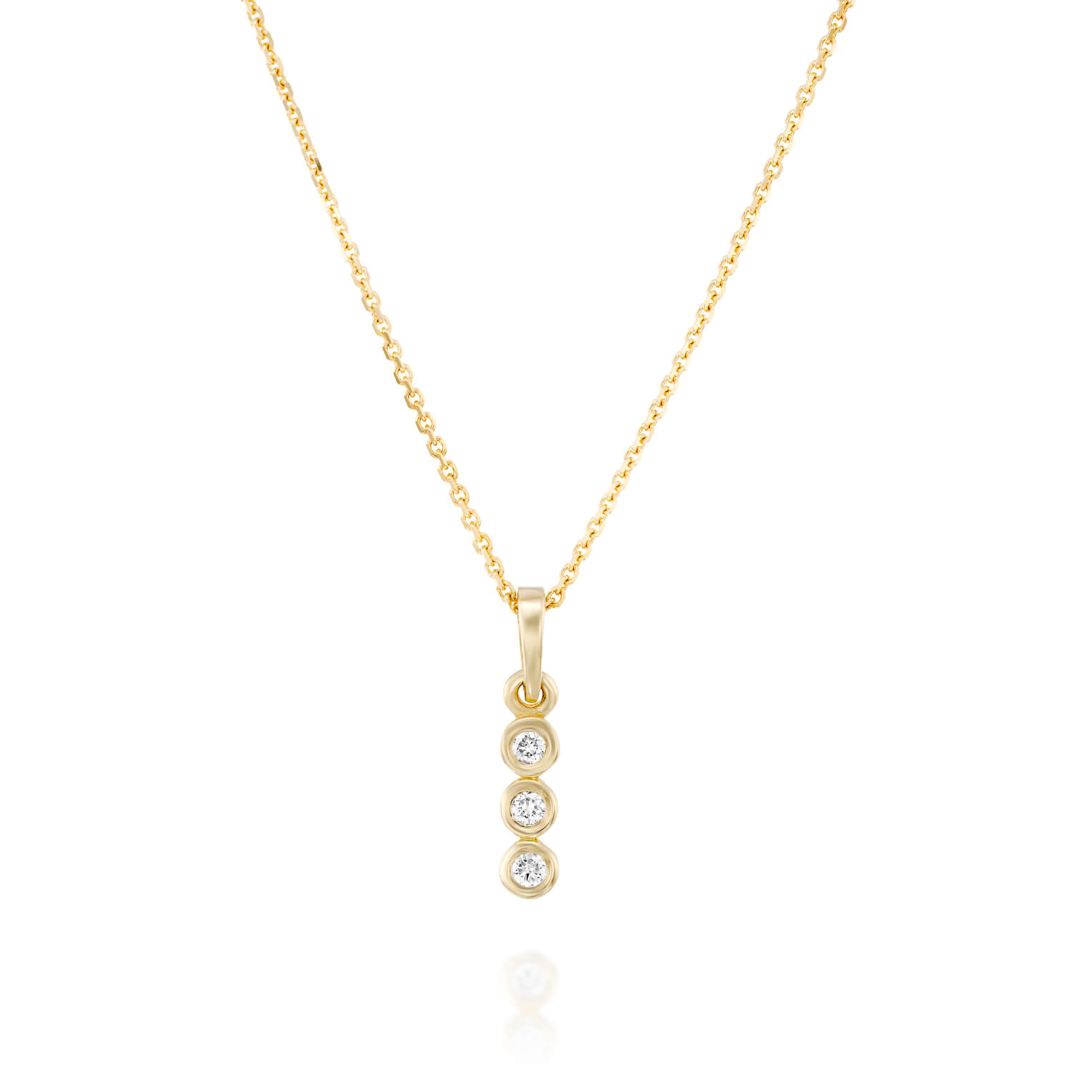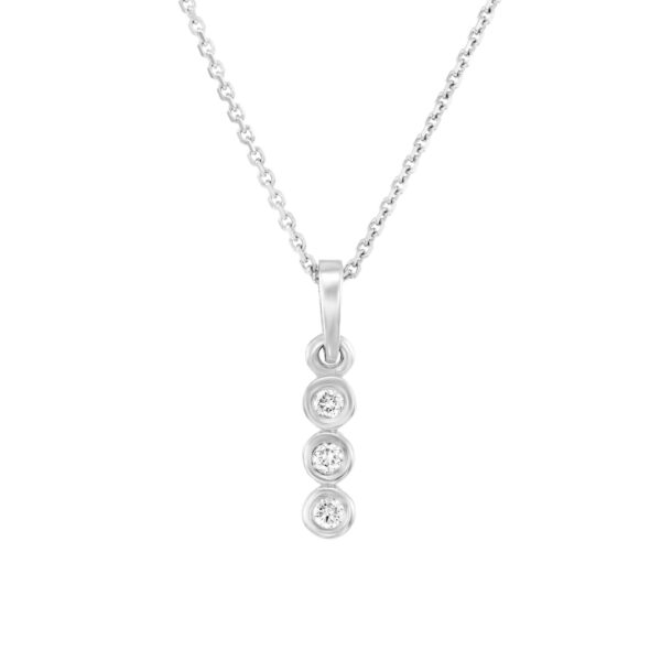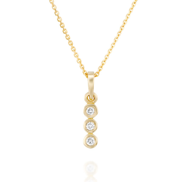 Delicate bezel diamond pendant set with 3 glittering 0.05 carat diamonds. A delicate diamond pendant with gold margins that give the diamond a bigger appearance.