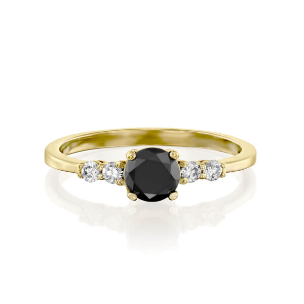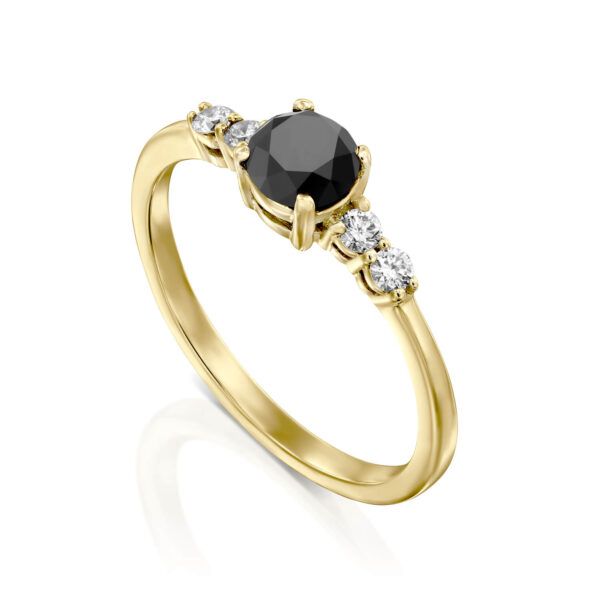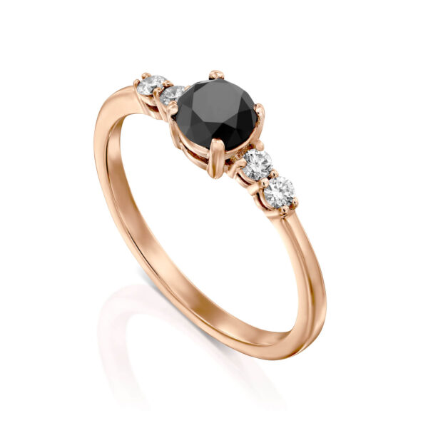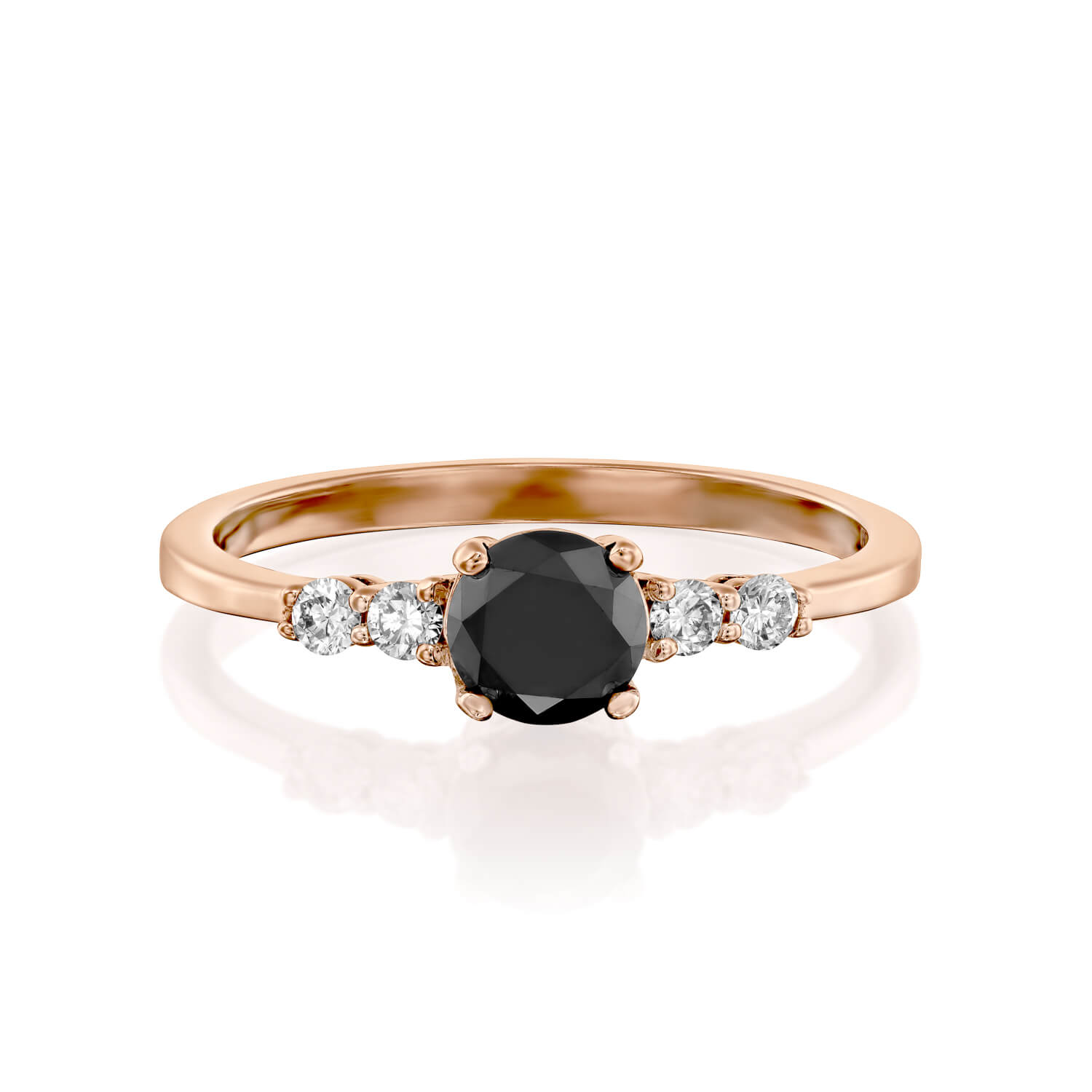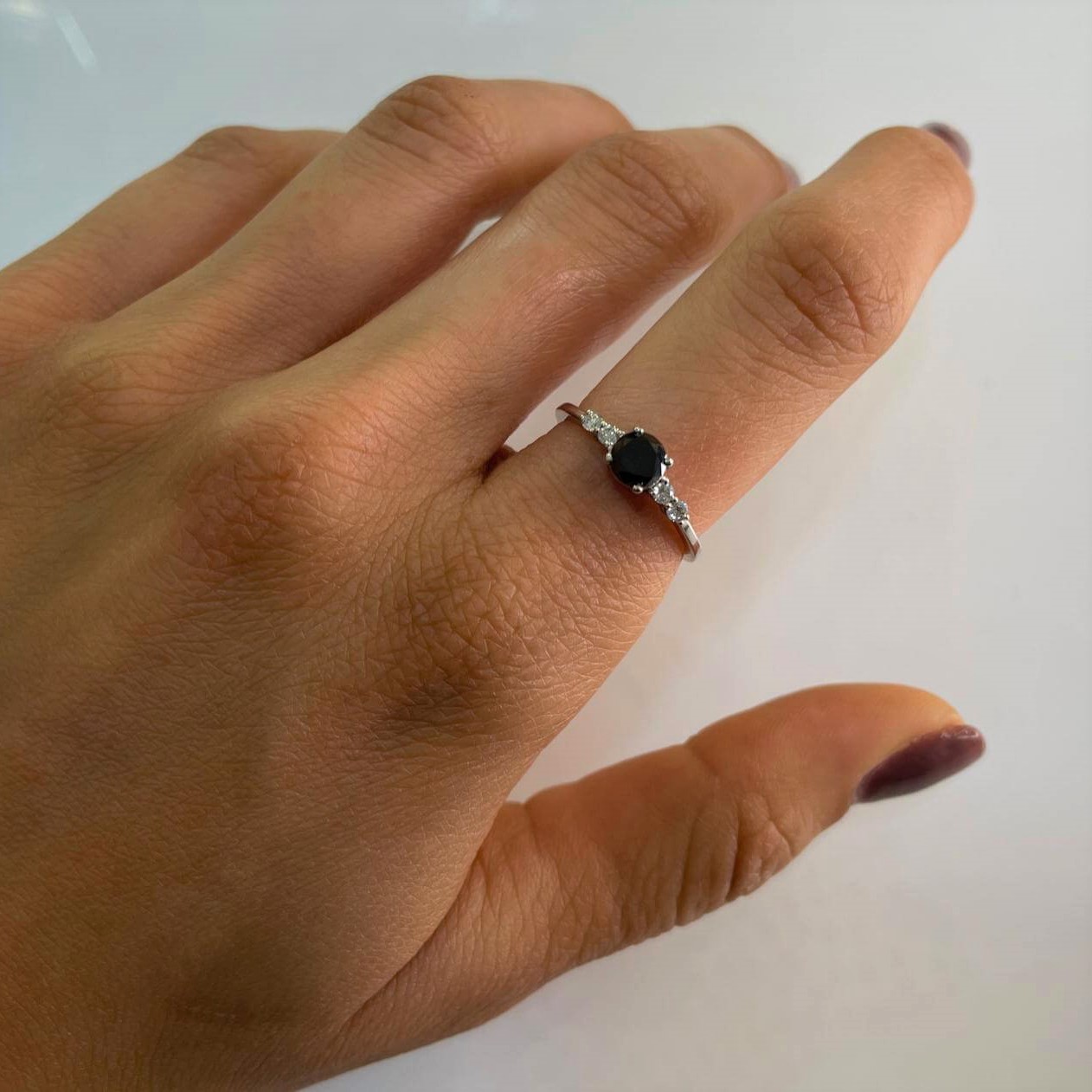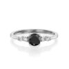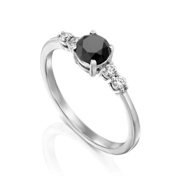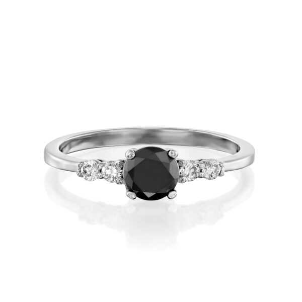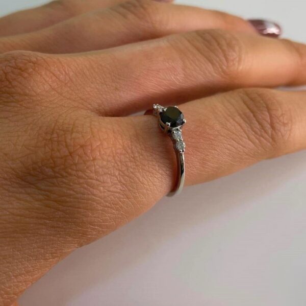 A fashionable and delicate black diamond ring set with a shiny 0.55 carat black diamond in the center and a pair of shiny white diamonds weighing 0.11 carats in total. A black diamond ring is filled with elegant chic, and the white diamonds enhance the black diamond in the center and give it a special look.