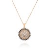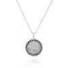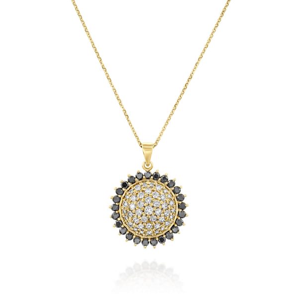 A sun diamond pendant with black rays is set with 43 sparkling white diamonds in the center 0.90 carat total and around black diamonds that create an interesting contrast weighing 0.85 carat total.