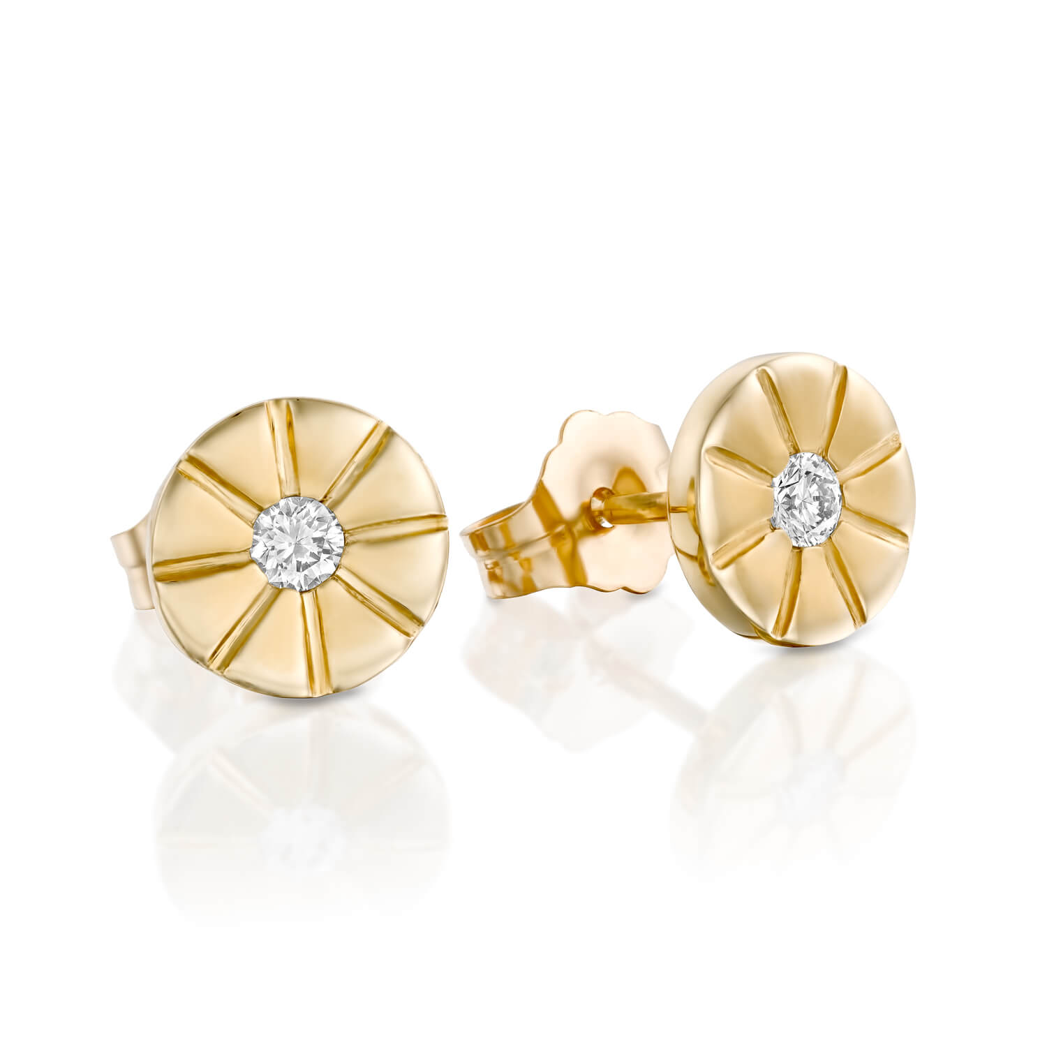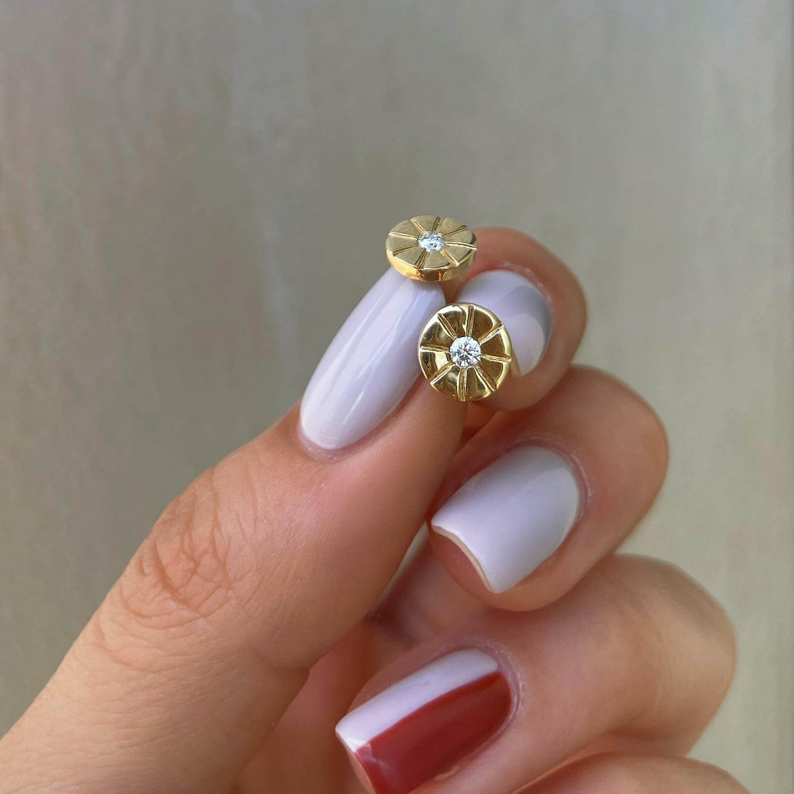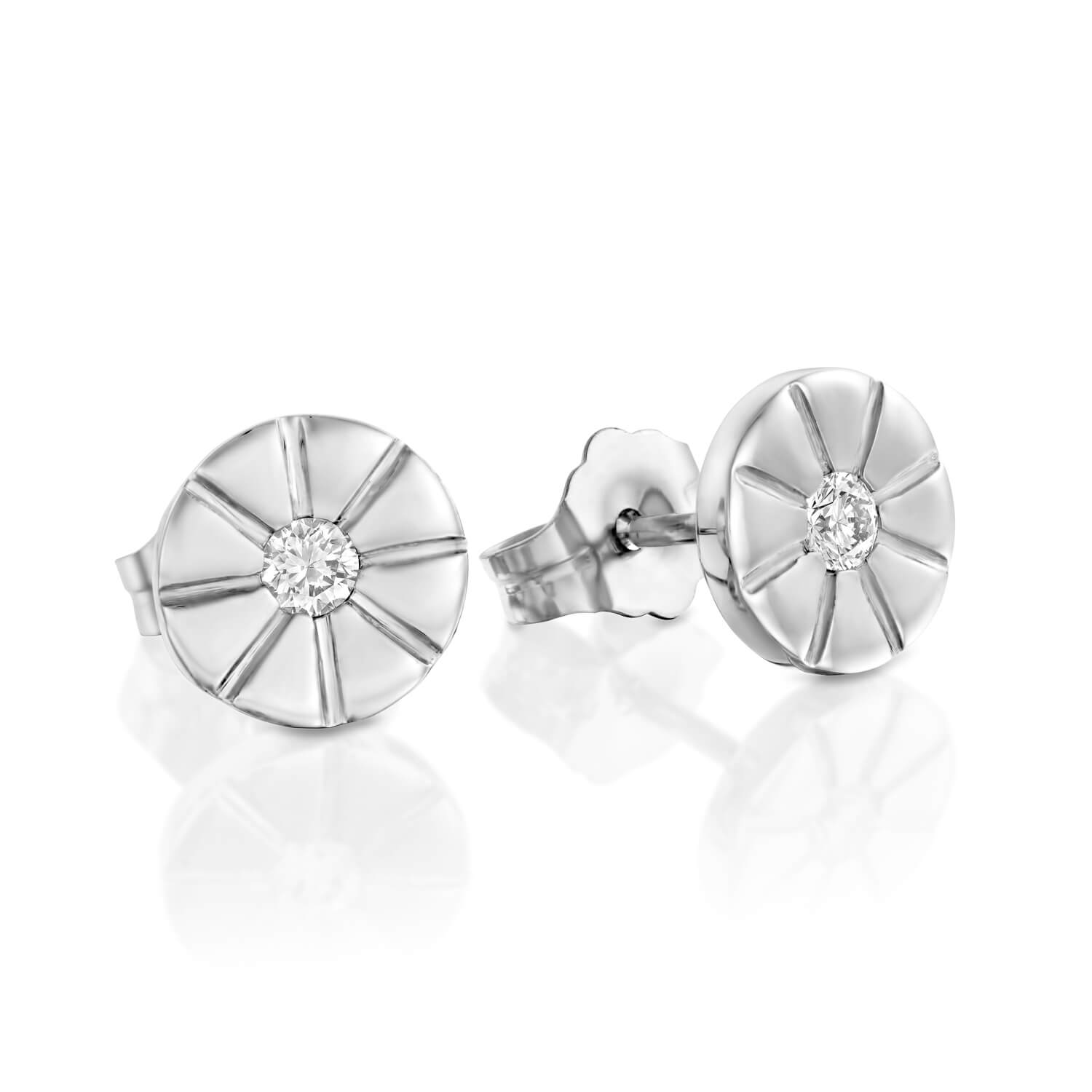 Sun diamond stud earrings. Delicate design with brilliant diamonds at the center of the shiny sun to enhance your appearance.