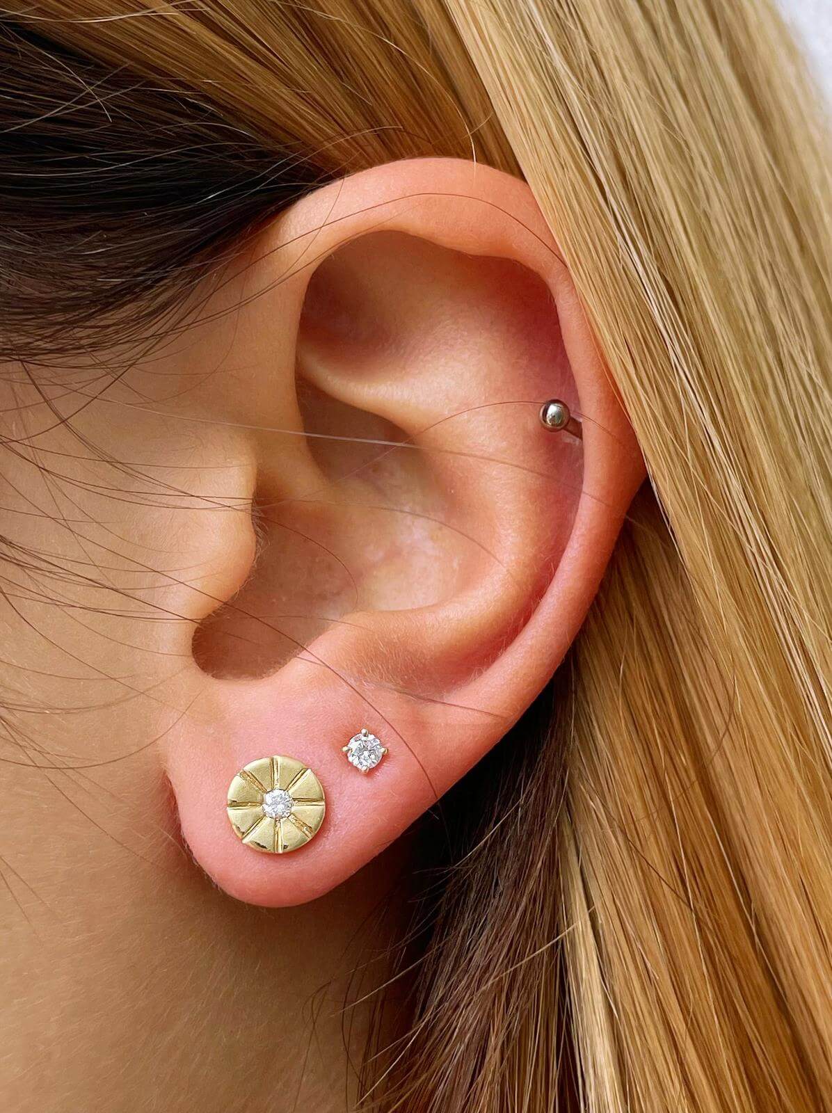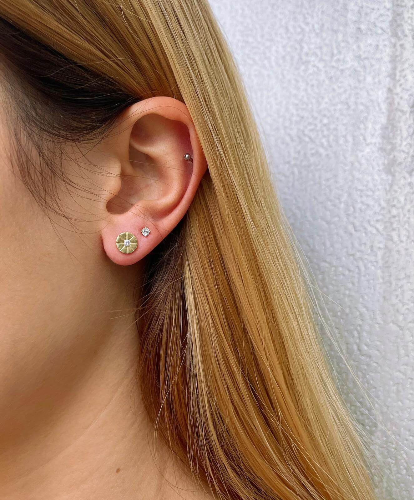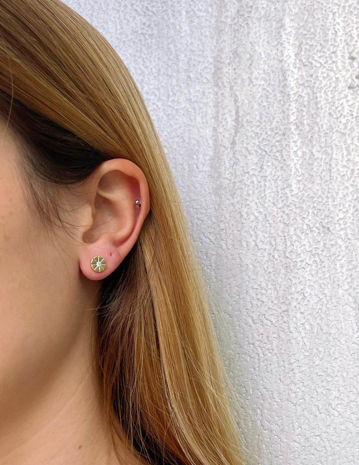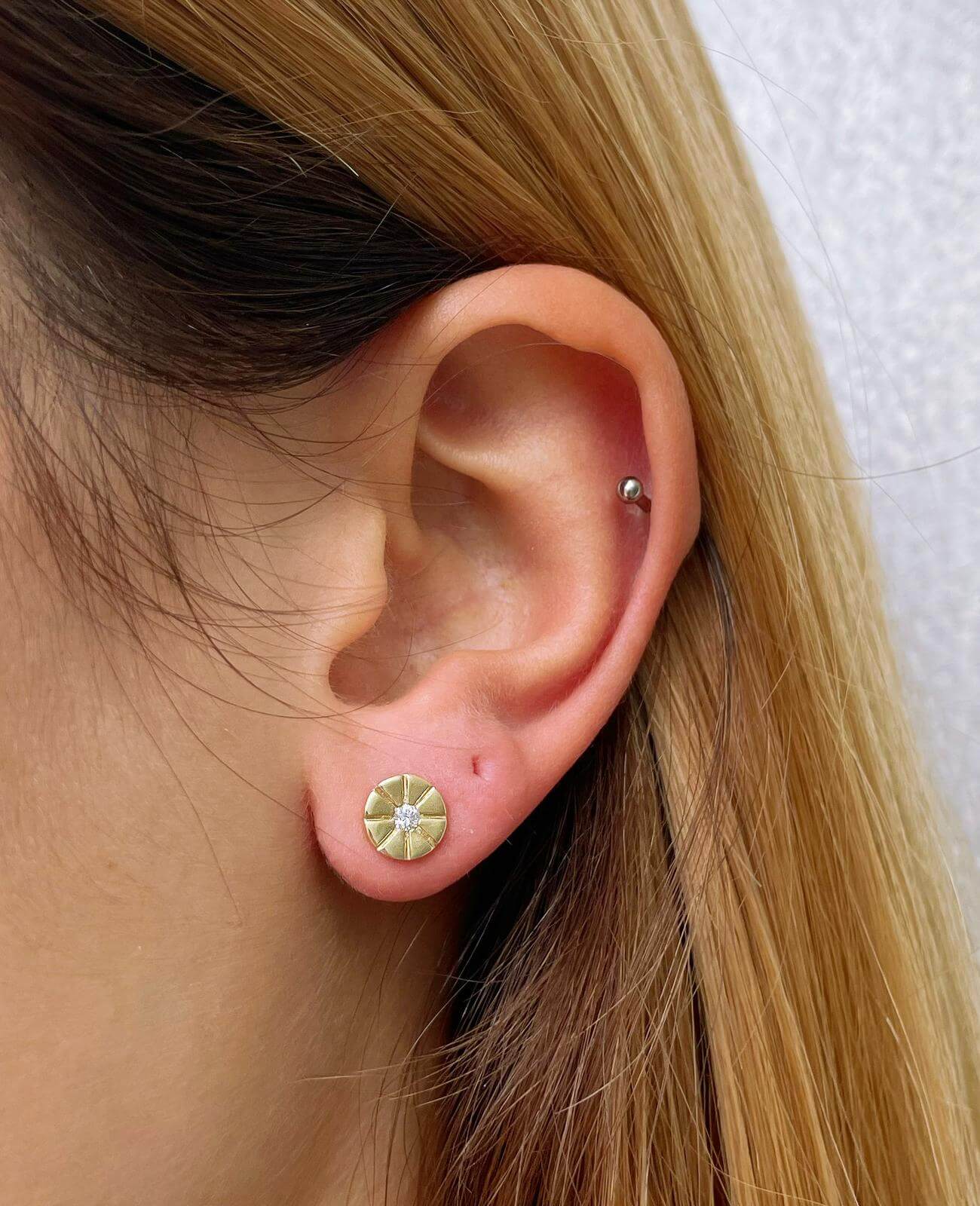 Sun diamond stud earrings. Delicate design with brilliant diamonds at the center of the shiny sun to enhance your appearance.