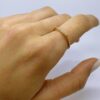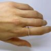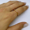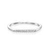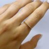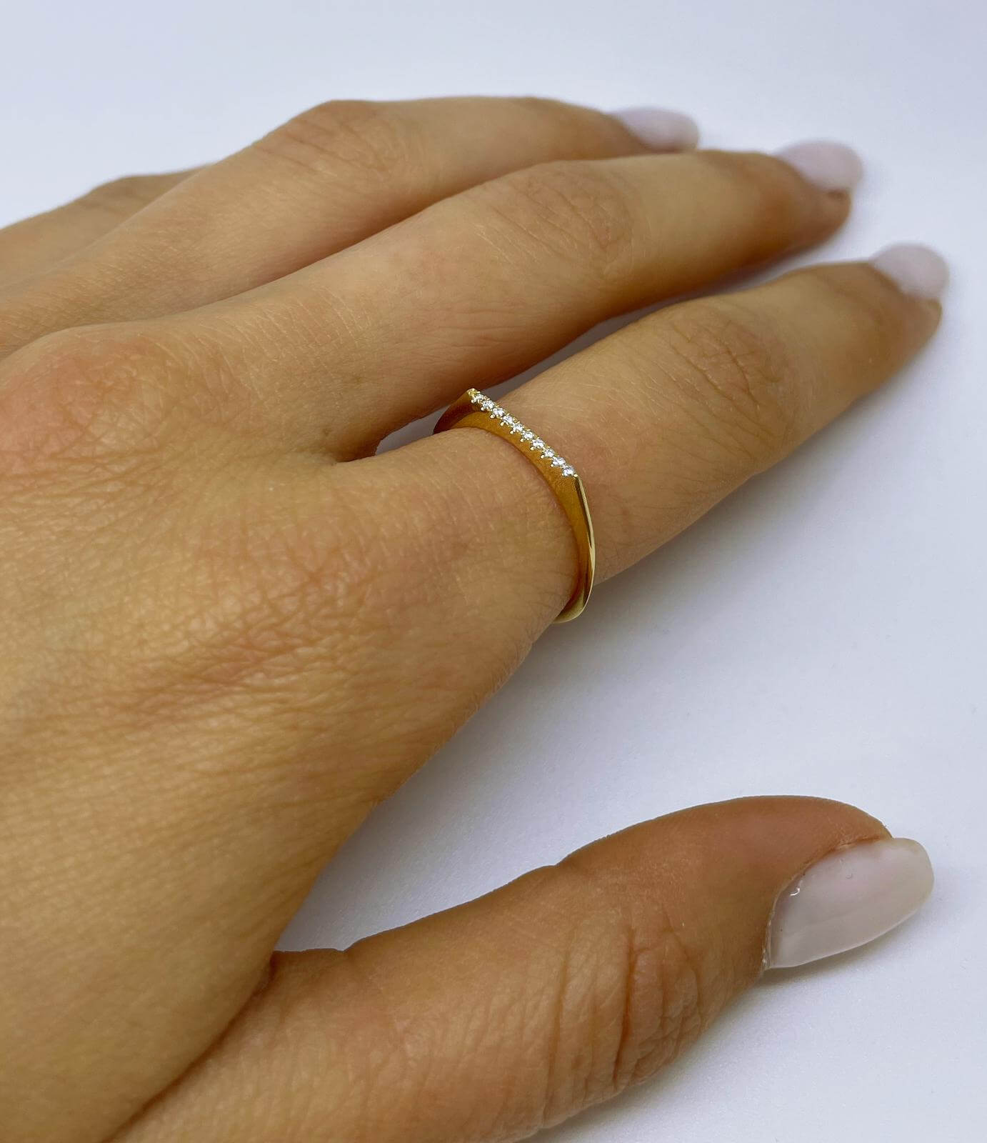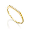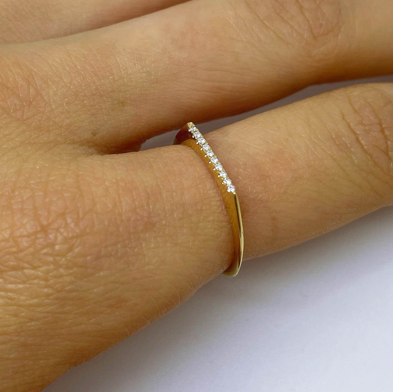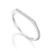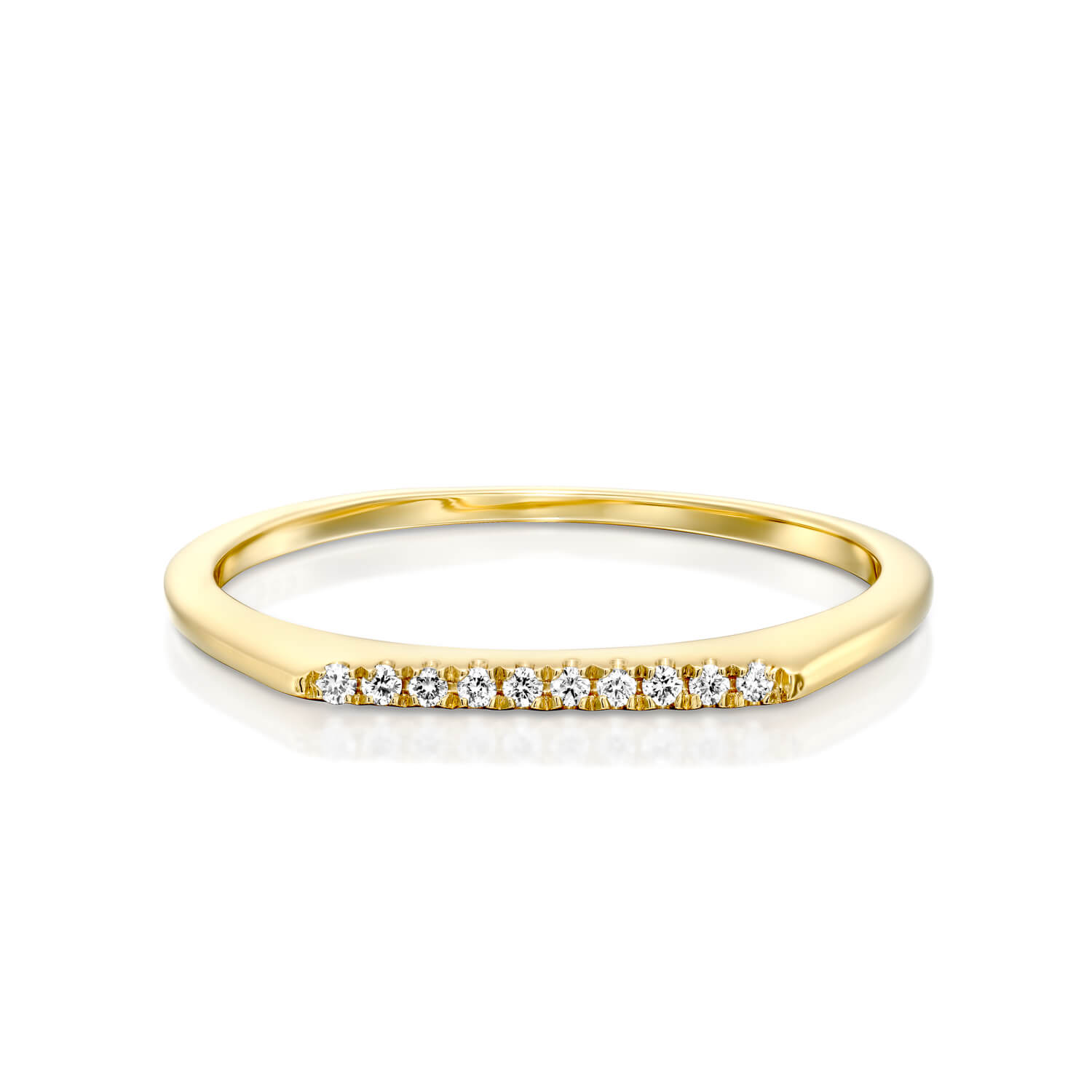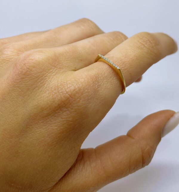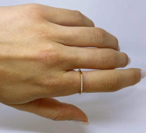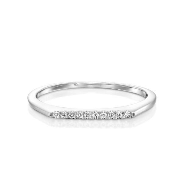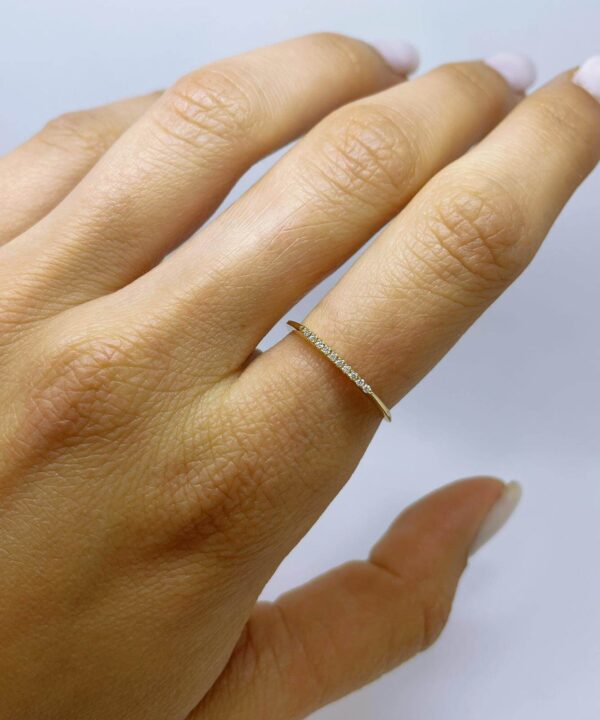 A thin and delicate row diamond ring set with 10 sparkling diamonds in a row weighing 0.05 carats total.