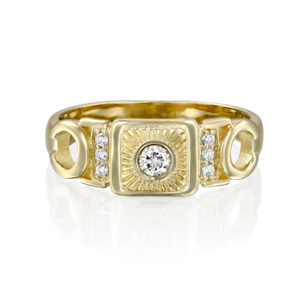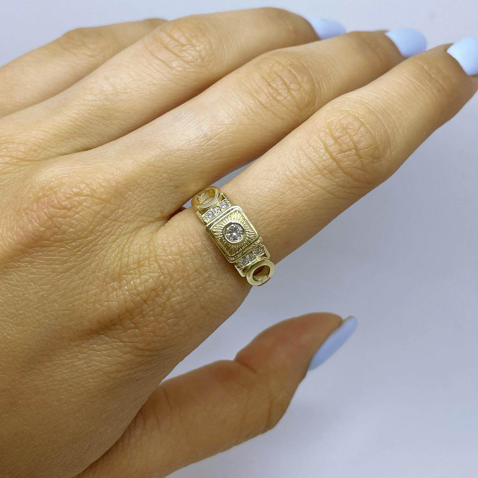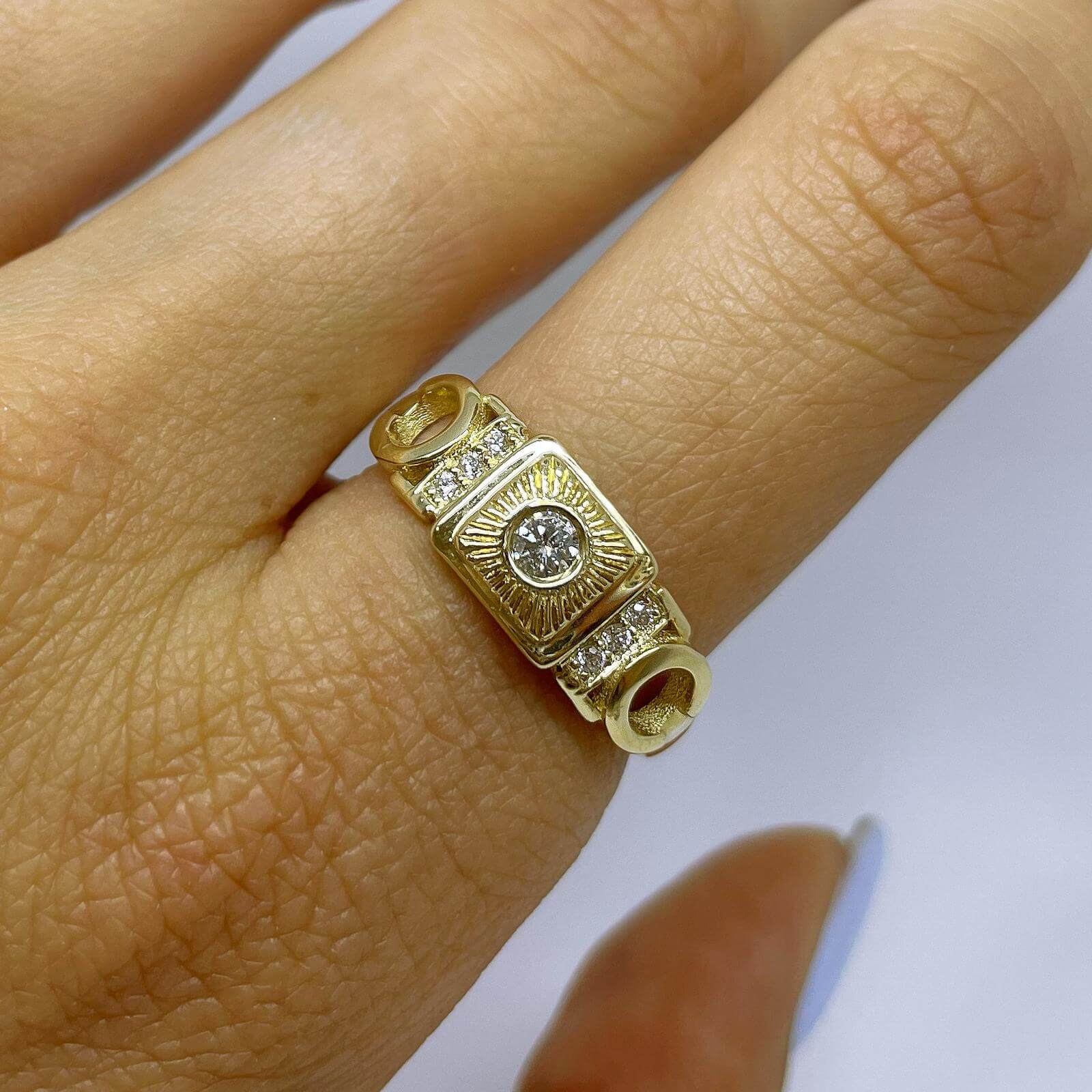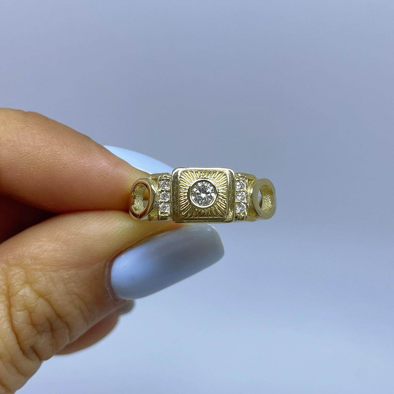 A special vintage-style diamond ring, set with a 0.10 carat diamond in the center and shining diamonds on the sides. This diamond ring with a special look, carefully made with an emphasis on the small details, serves as a unique piece of jewelry for everyday and events.