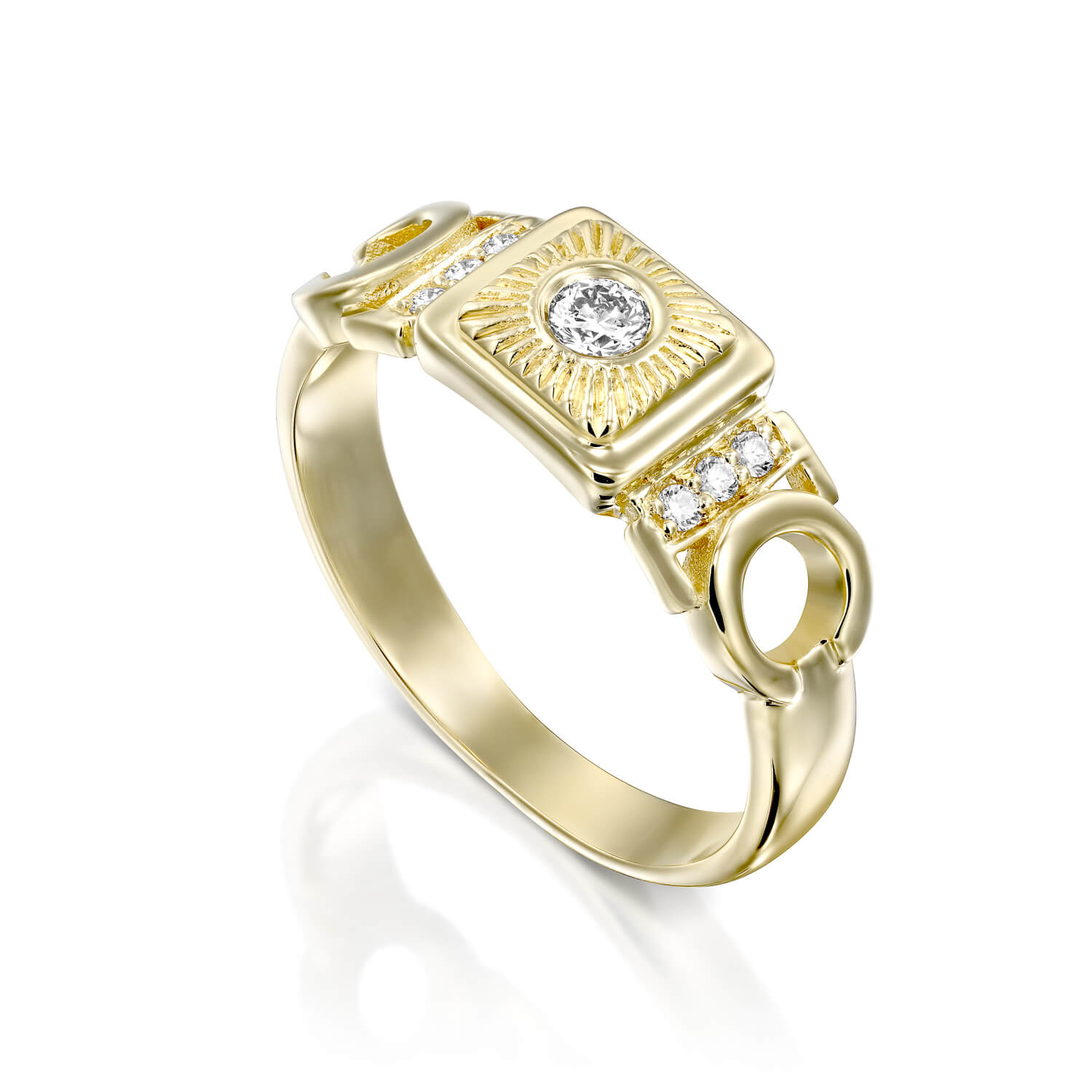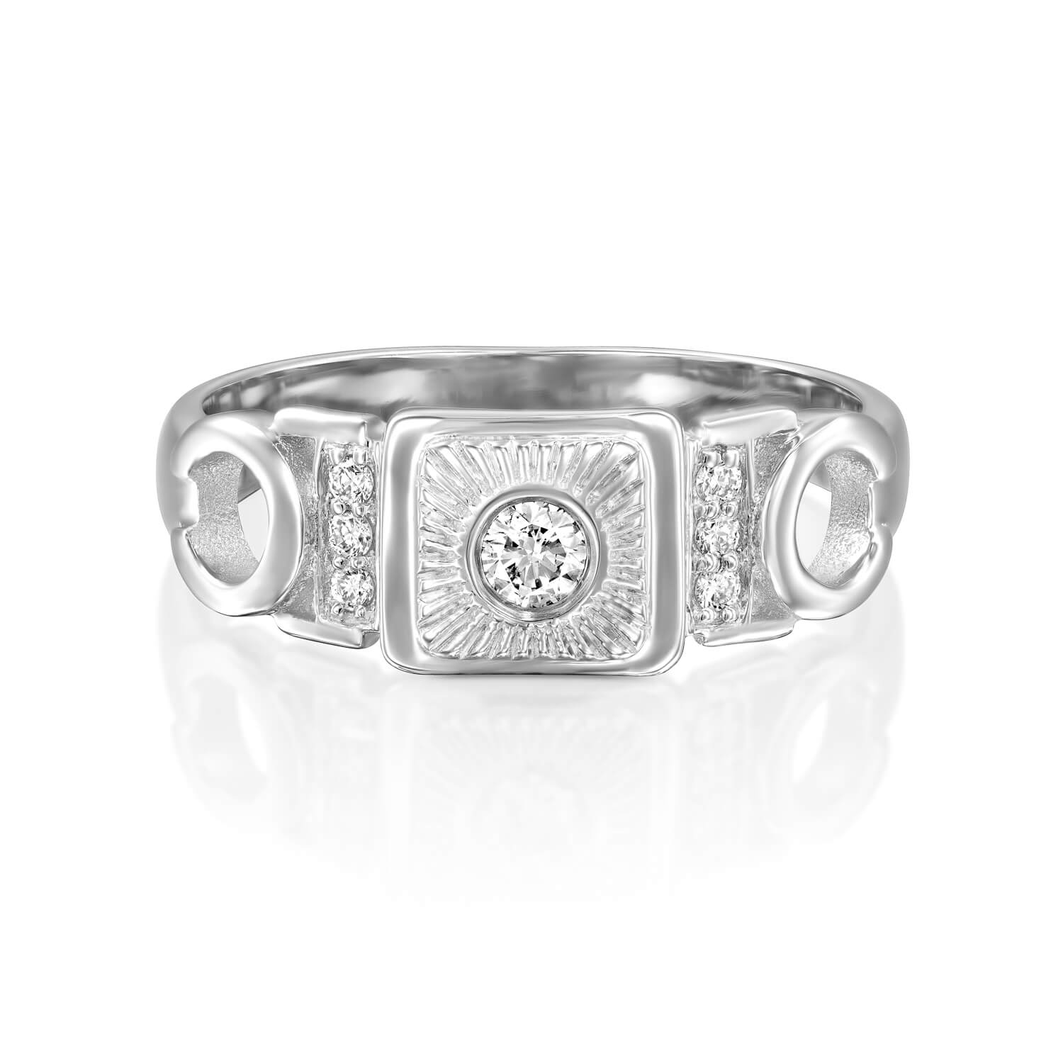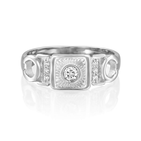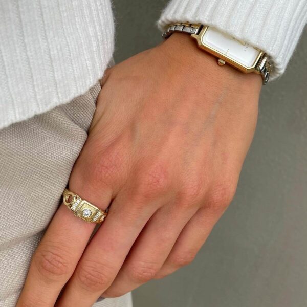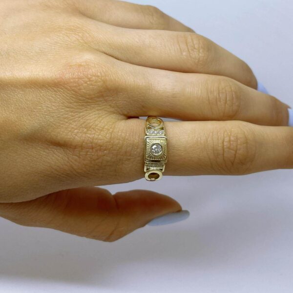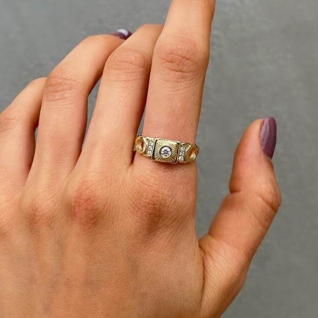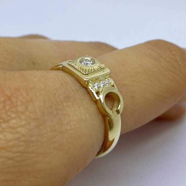 A special vintage-style diamond ring, set with a 0.10 carat diamond in the center and shining diamonds on the sides. This diamond ring with a special look, carefully made with an emphasis on the small details, serves as a unique piece of jewelry for everyday and events.