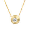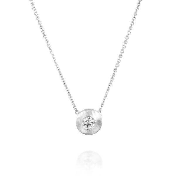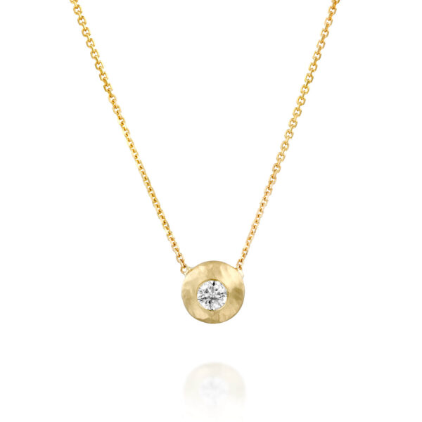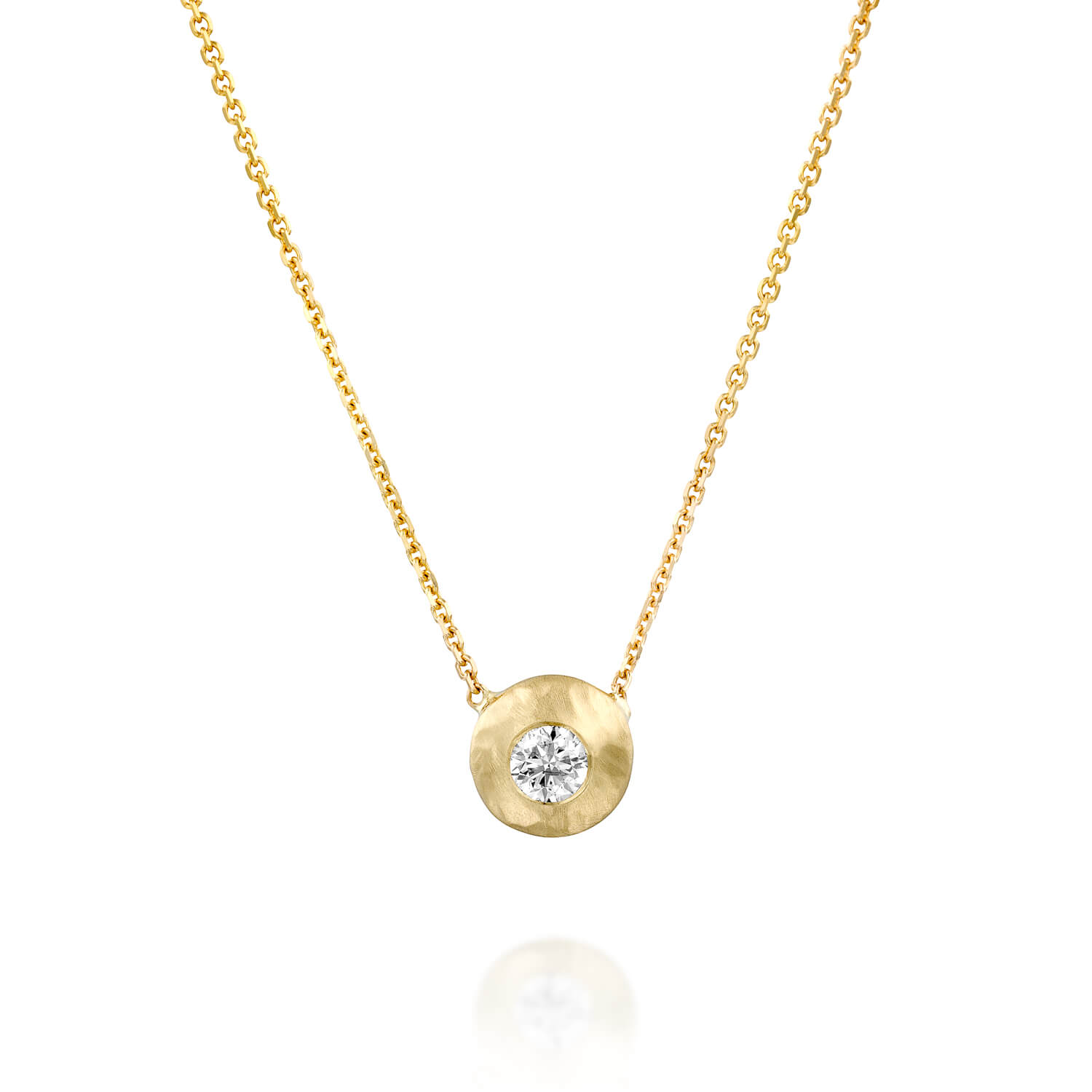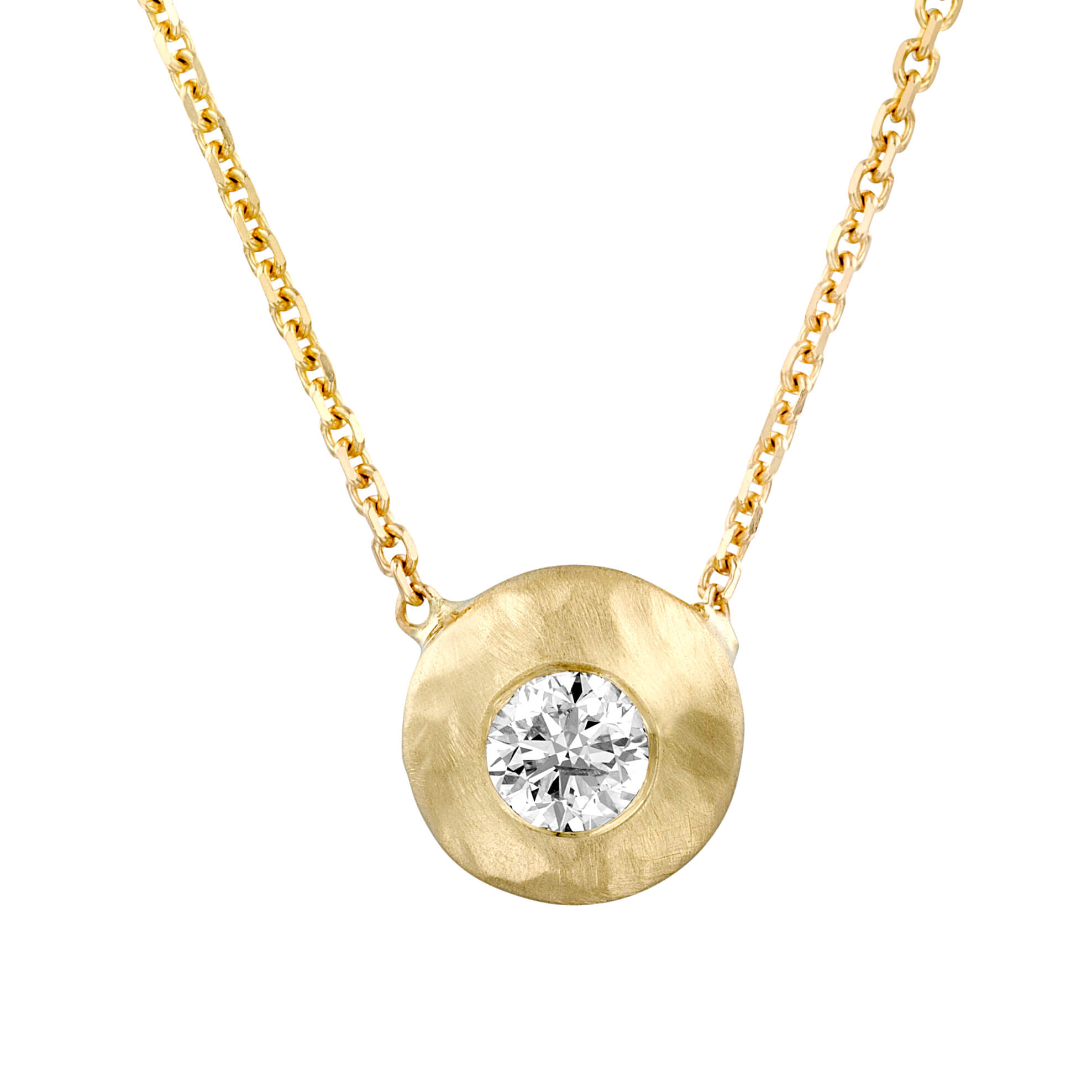 A vintage style diamond necklace features a 0.20ct center diamond. A donut shaped diamond pendant with a hammered finish to give it an antique look.
