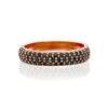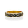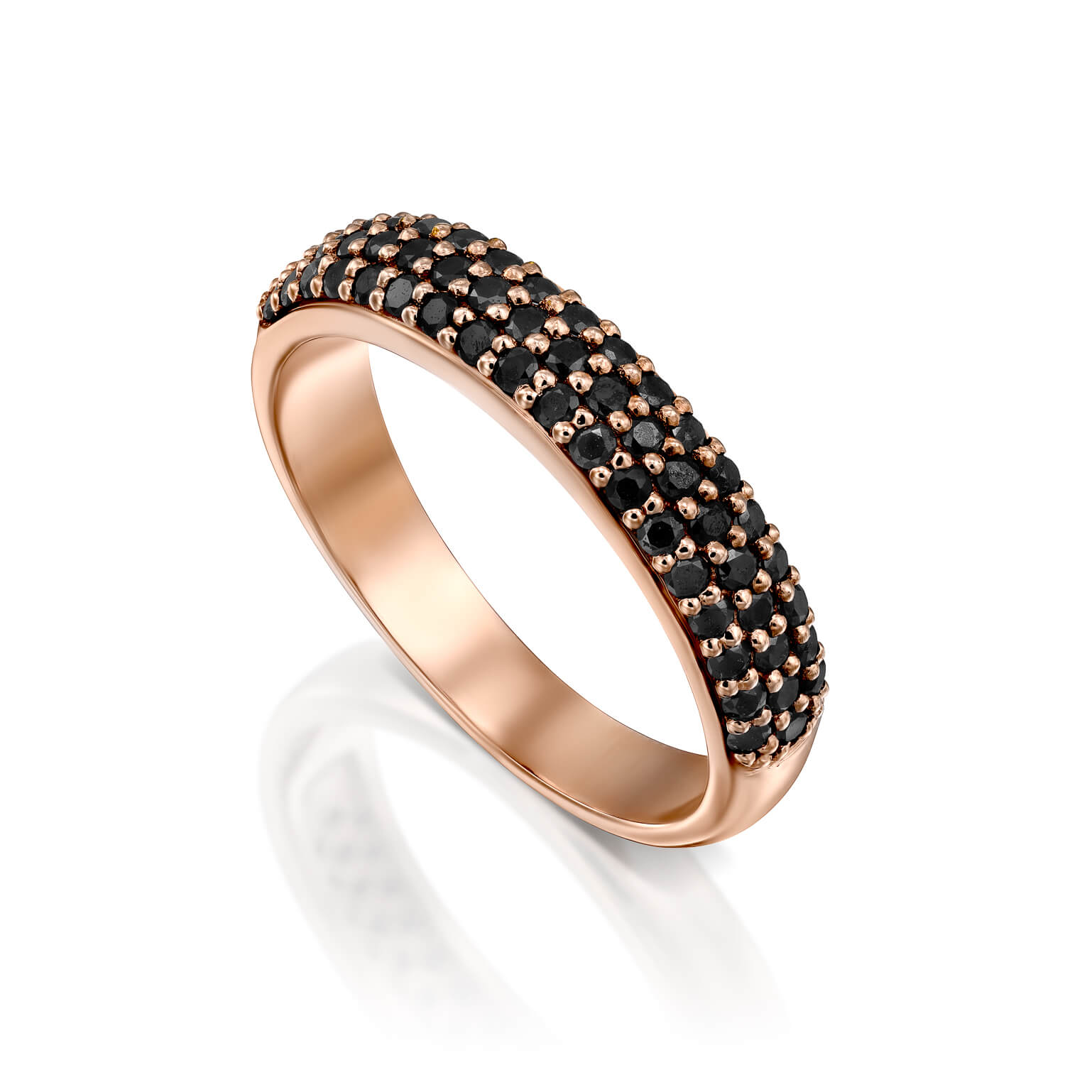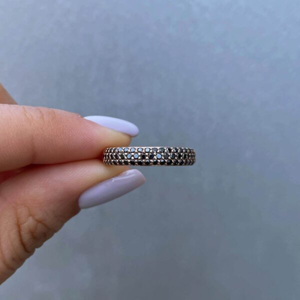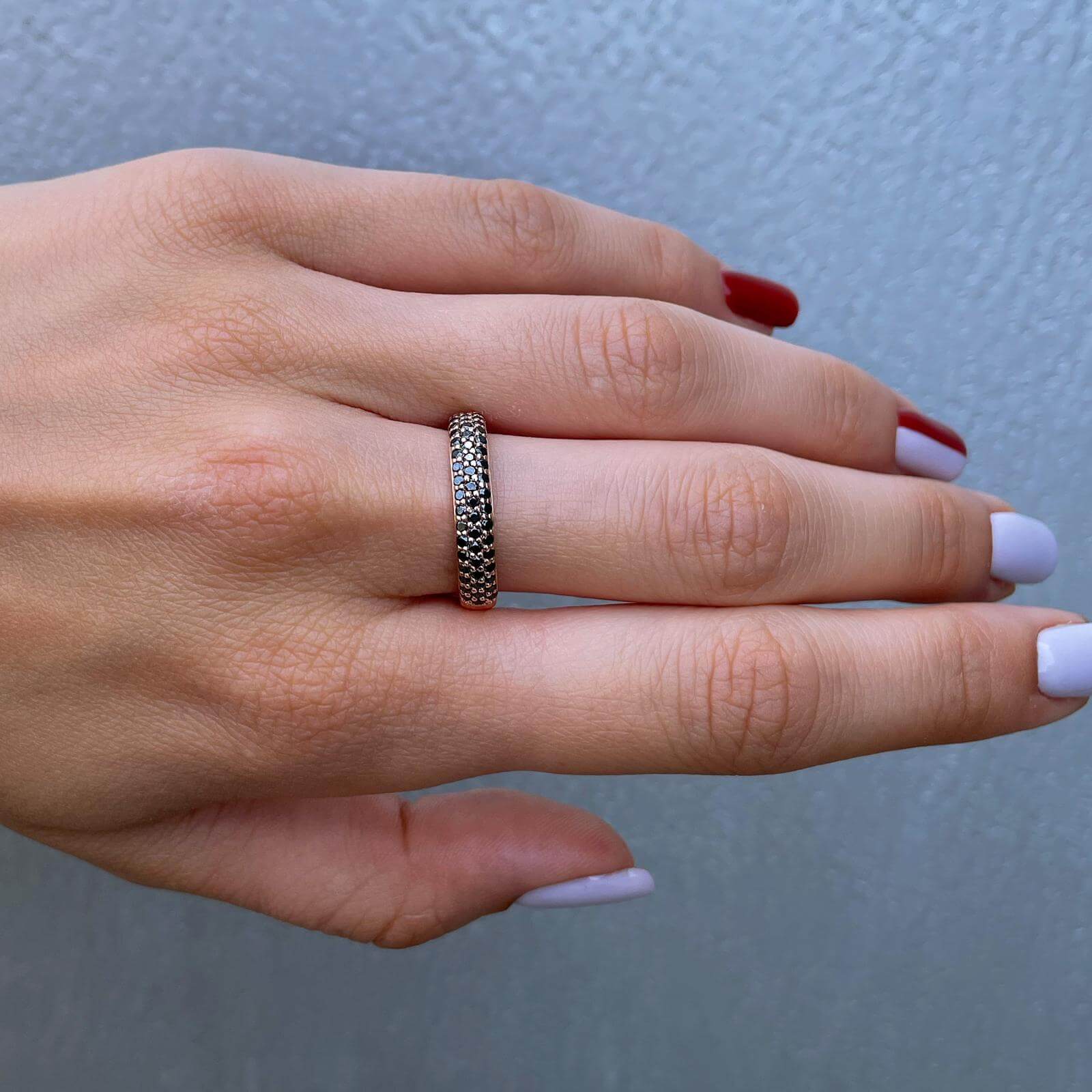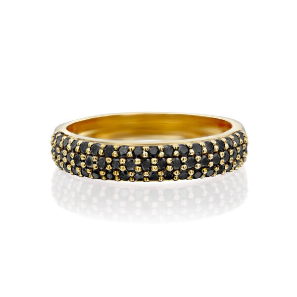 A luxurious and fashionable black diamond ring set with 48 black diamonds weighing 0.48 carats in total. A wide round diamond ring with black diamonds densely studded at the top. The ring design allows the diamonds to show from all angles.