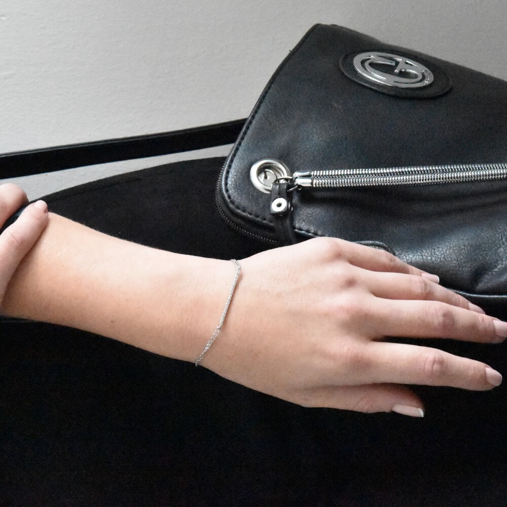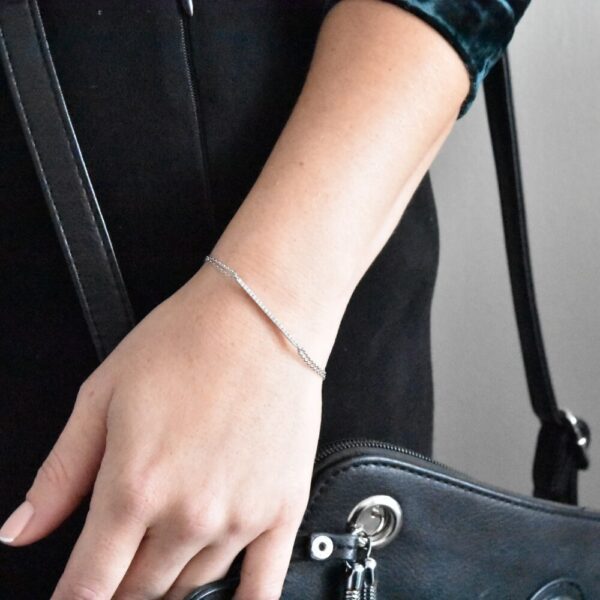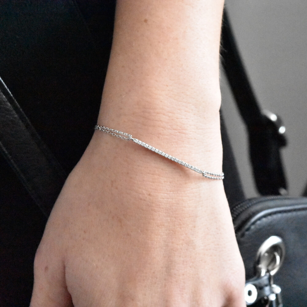 A stylish and young looking diamond bracelet set with 25 sparkling diamonds weighing 0.50 carats. An unusually long diamond bracelet that covers the entire front of the hand with a double chain to accentuate its presence.