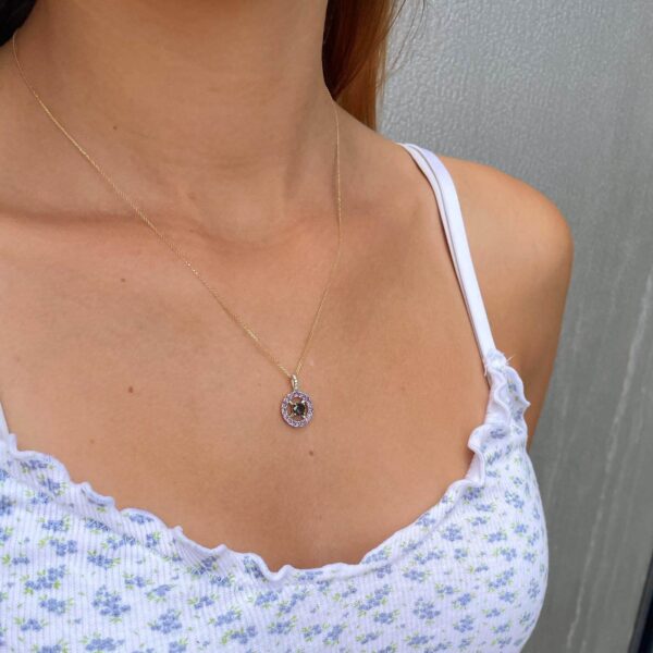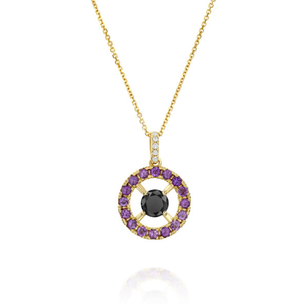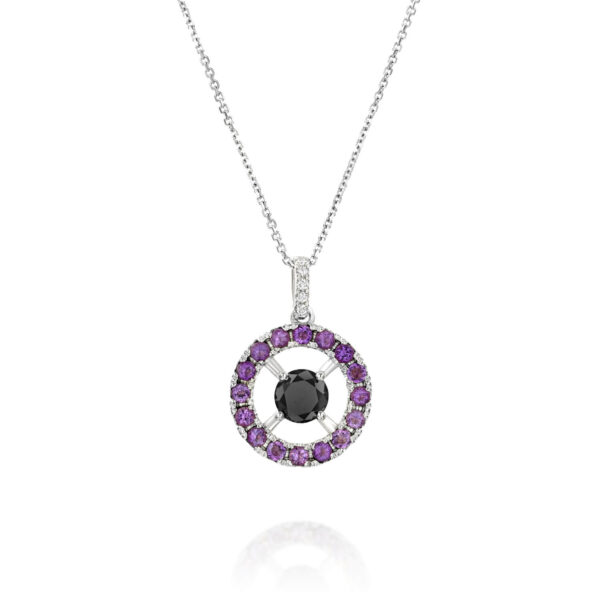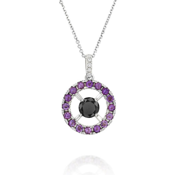 A special and impressive black diamond pendant with a black diamond in the center 0.60 carats and an aura of purple amethyst gems around it 0.16 carats in total. A special diamond pendant with bright and magical colors that creates a magical and mesmerizing look.