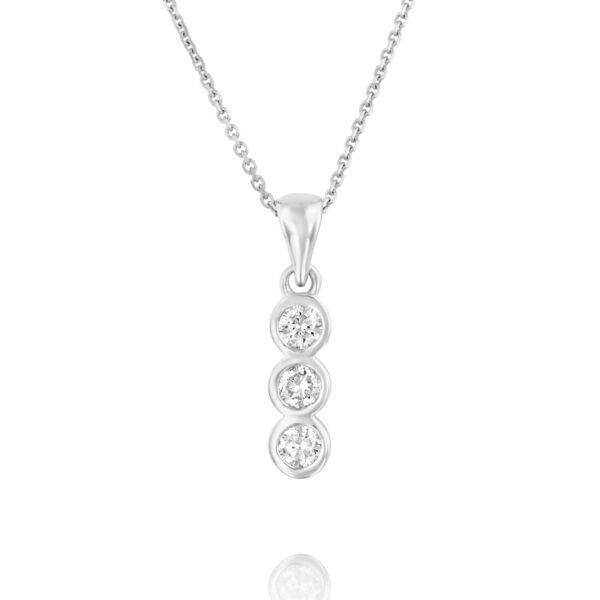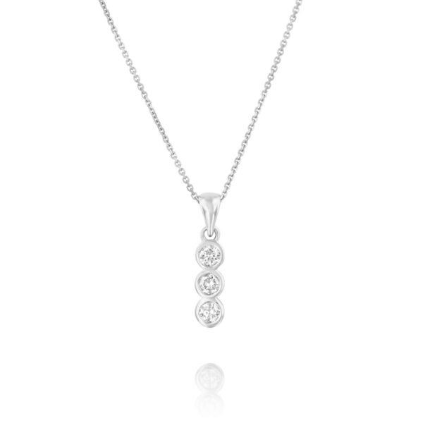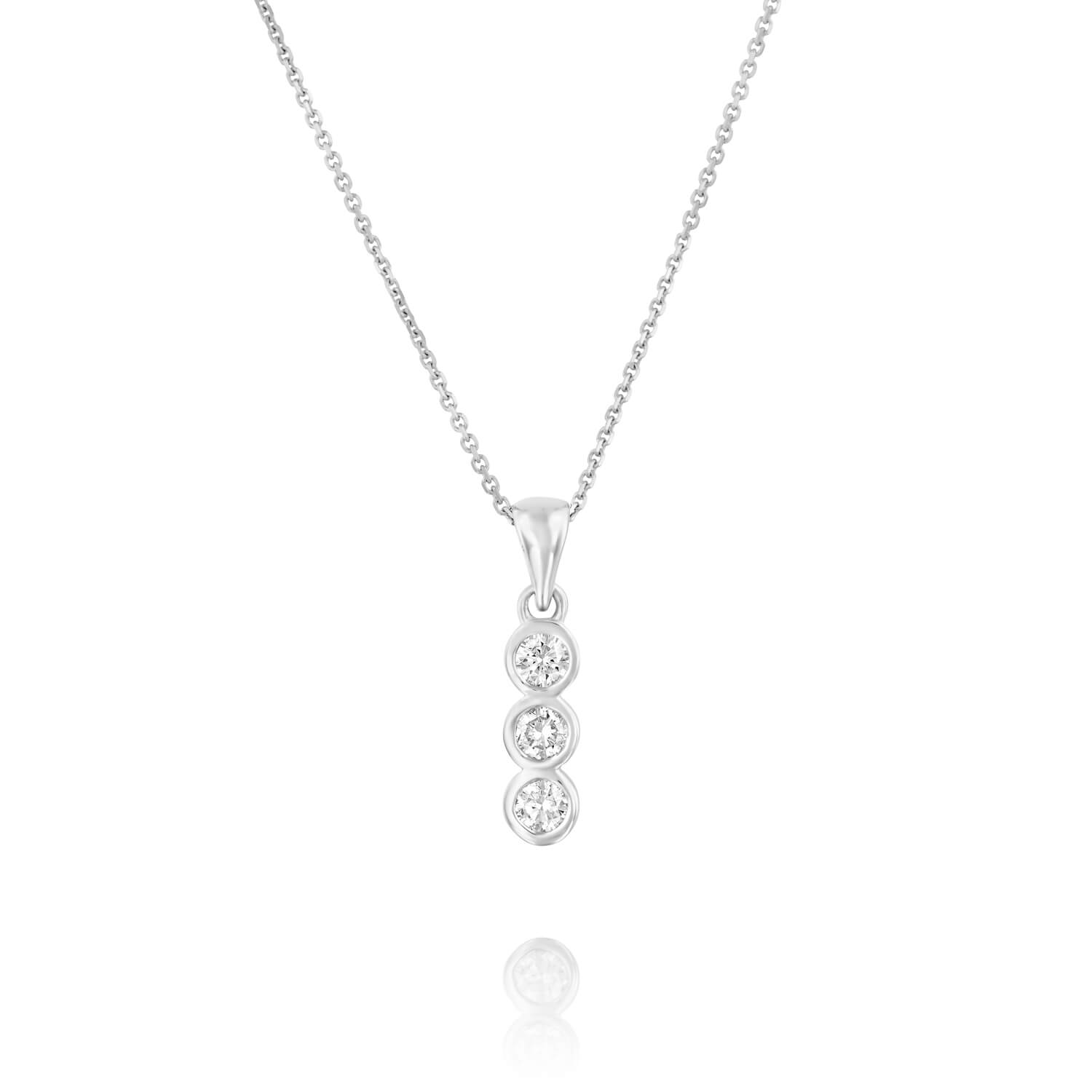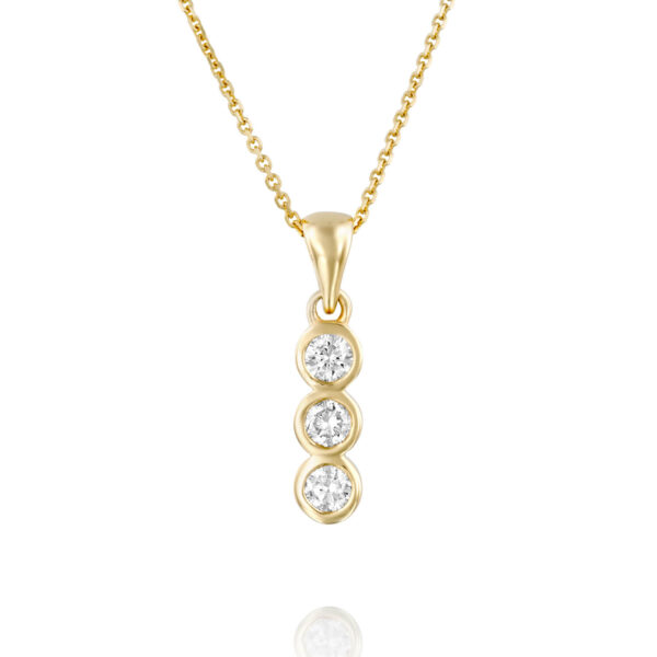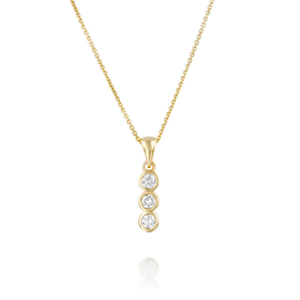 A delicate and fashionable diamond pendant set with 3 diamonds total weight 0.22ct. This diamond pendant is made of gold cups attached in aline, each glass wraps a sparkling diamond and gives it a larger appearance.