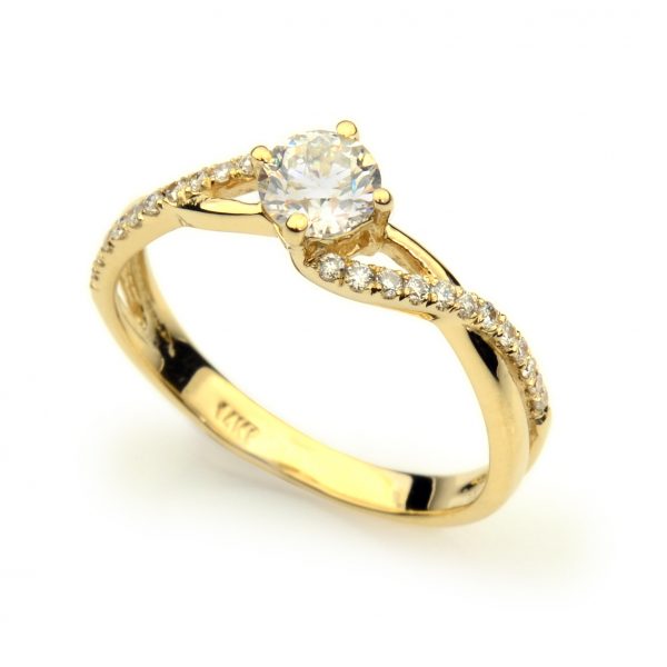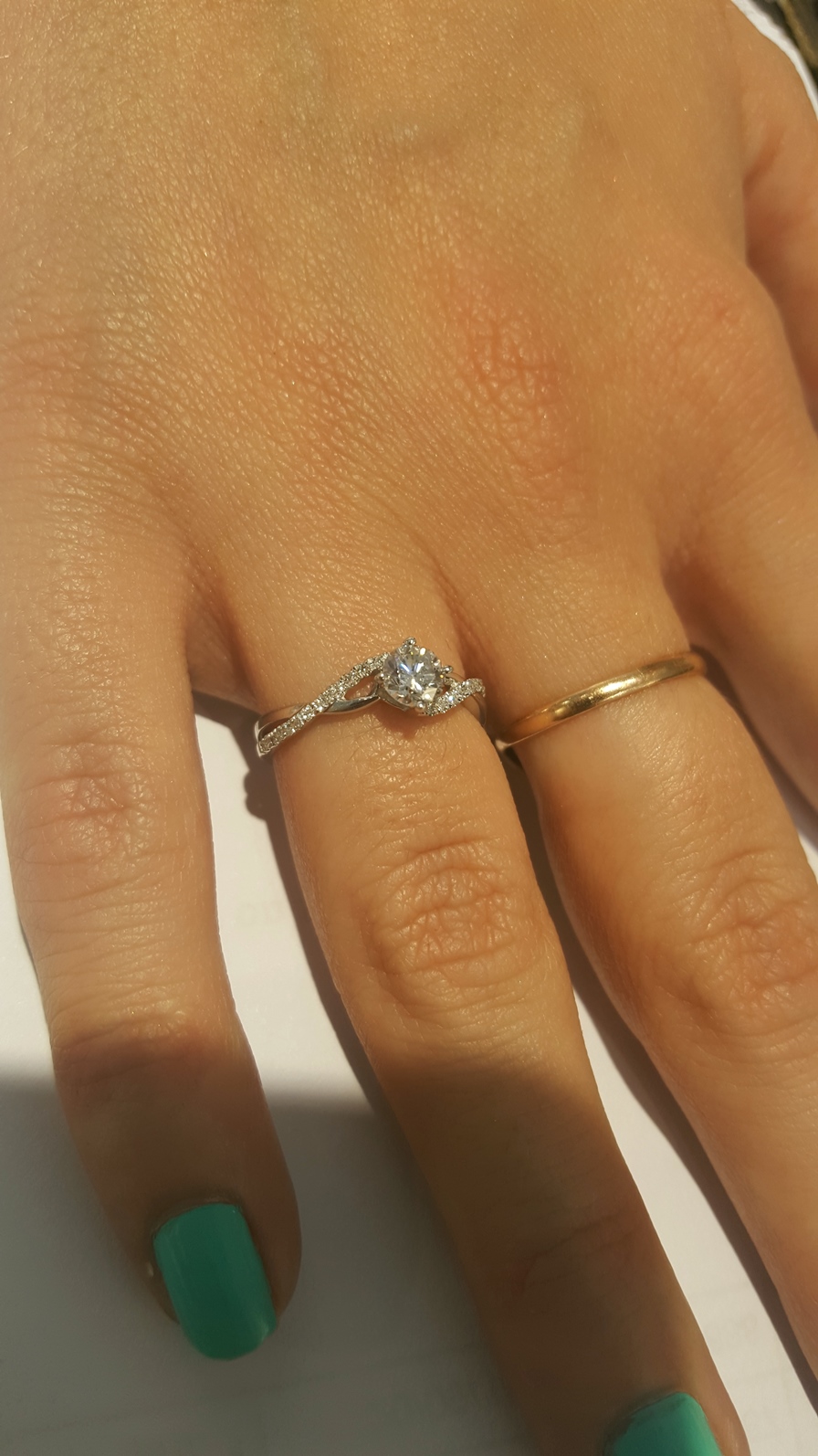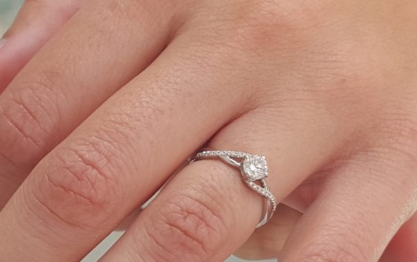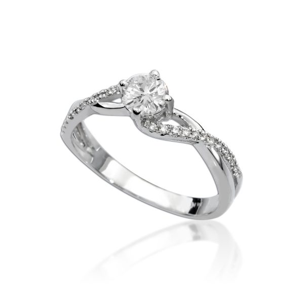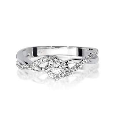 A slightly different and stylish diamond ring features with a 0.30 carat round brilliant diamond. A delicate and graceful engagement ring designed as two thin rings that twist and connect with each other.
